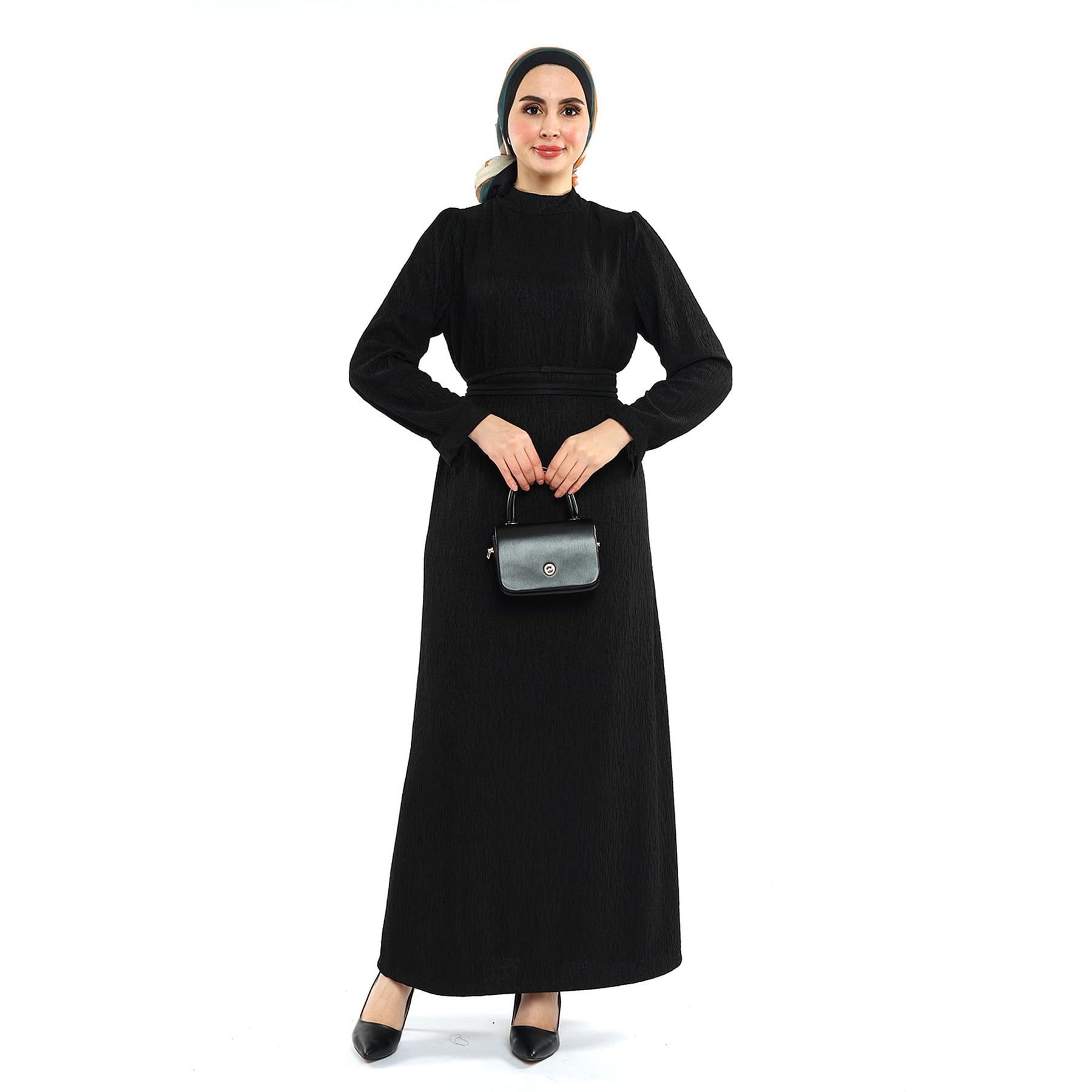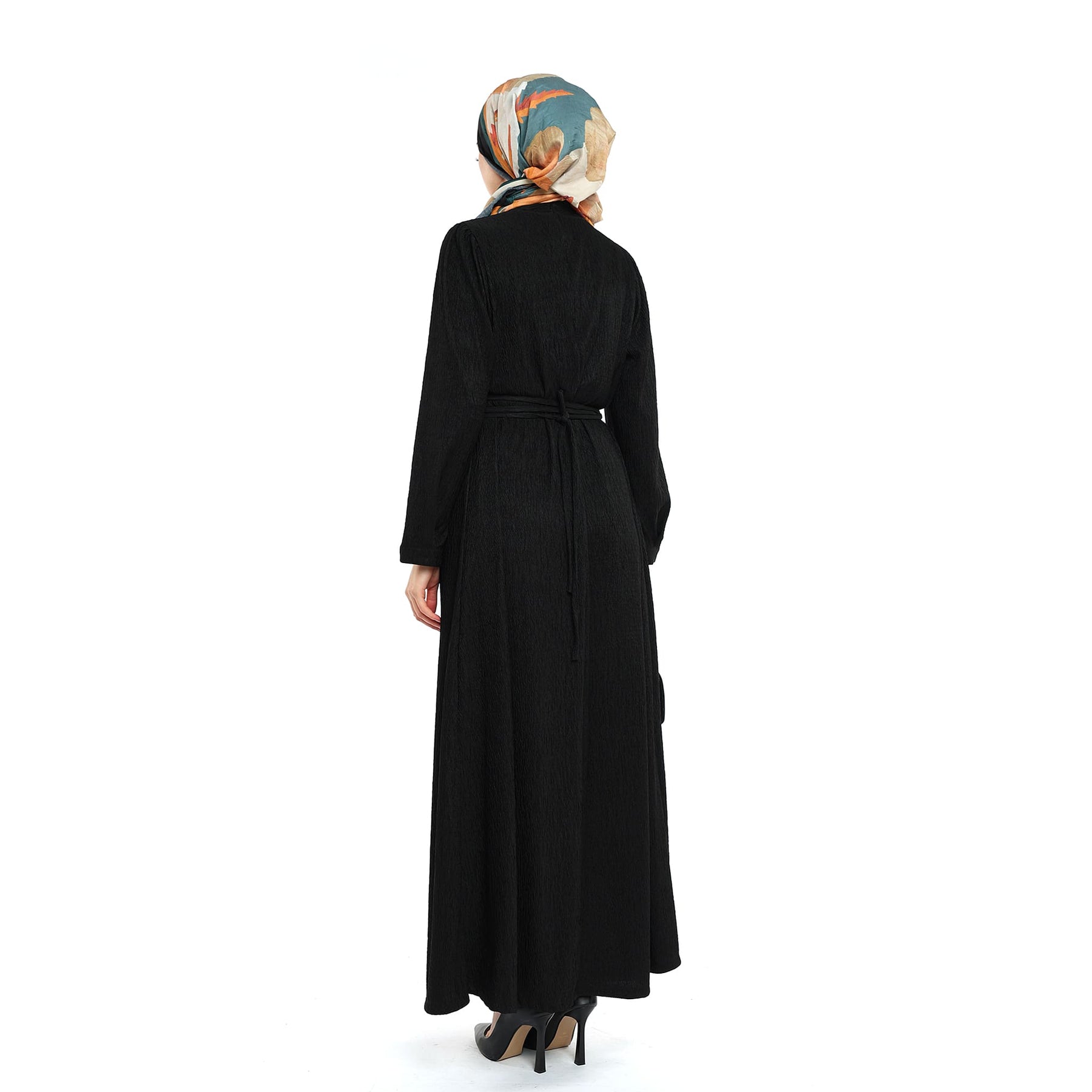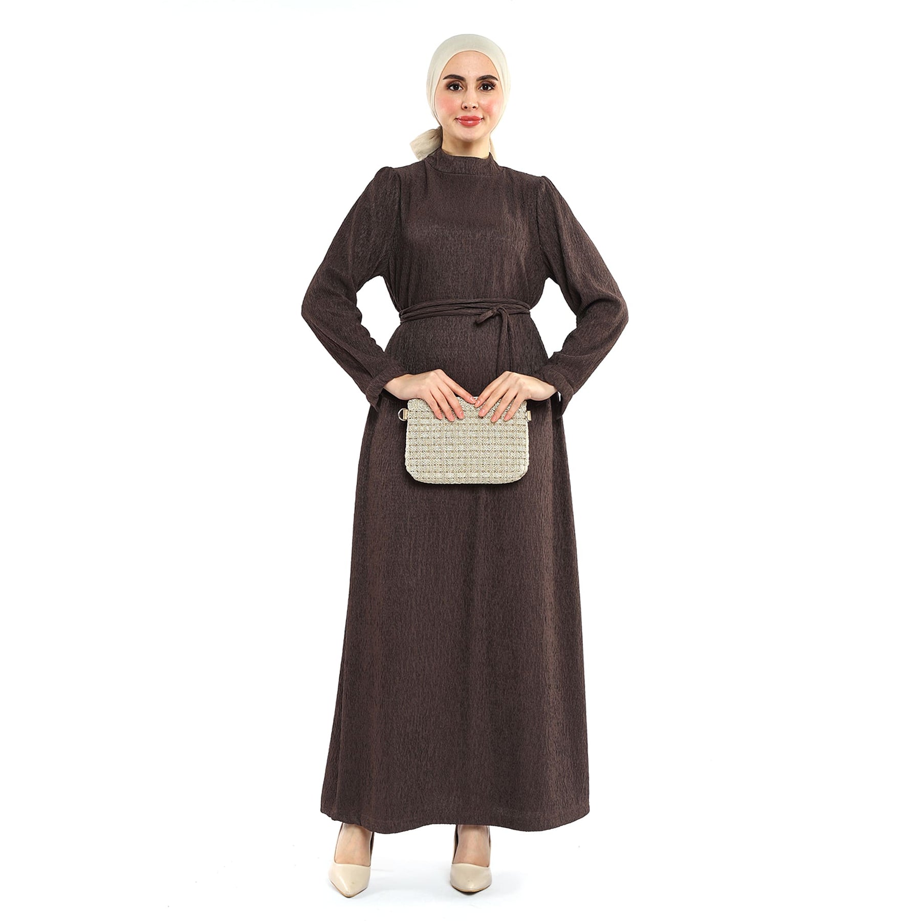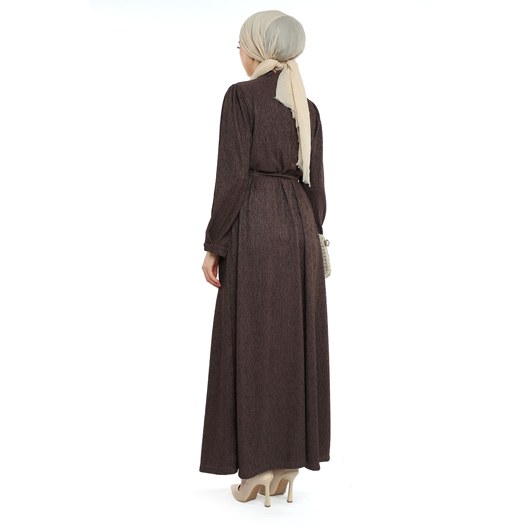 Designed for the cold season, this dress stands out with its wave-textured surface, neat stand collar and refined shoulder pleats. The removable self-fabric belt softly defines the waist, while the unlined construction keeps the fabric’s natural drape and comfortable feel. Falling below the knee (length may vary by size), it moves easily from daytime plans to evening meetups. Pair with opaque tights, ankle boots and woolly accessories for an effortlessly polished look.
