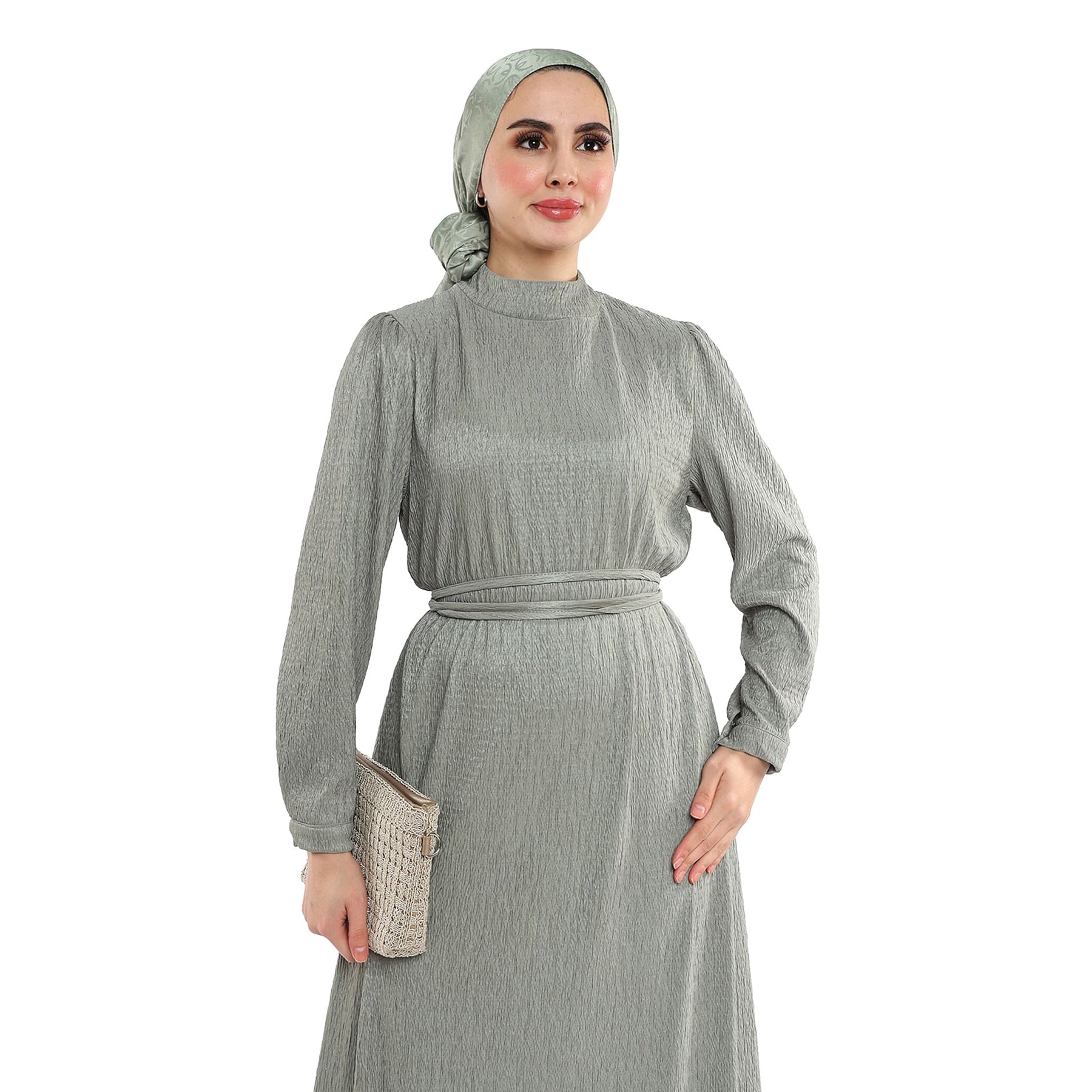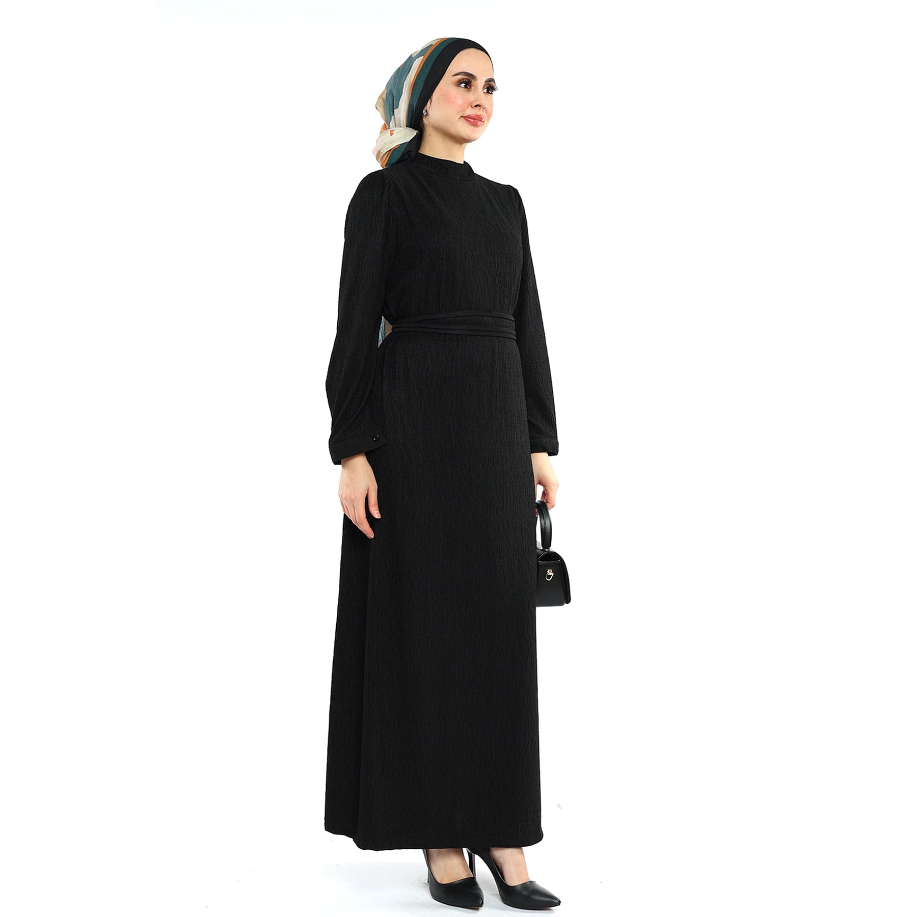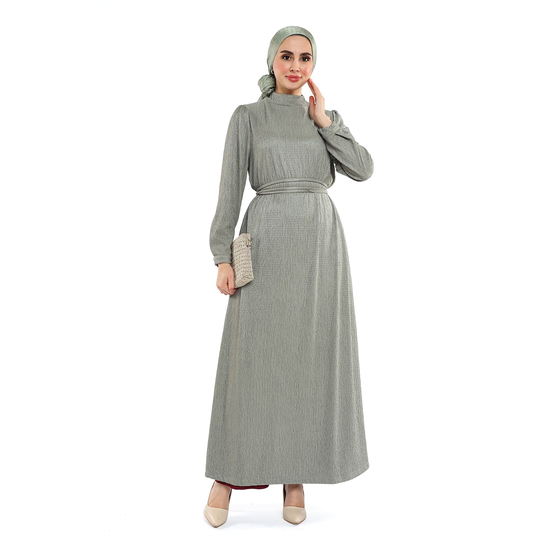 Wave-Texture Stand Collar Dress with Shoulder Pleats & Belt