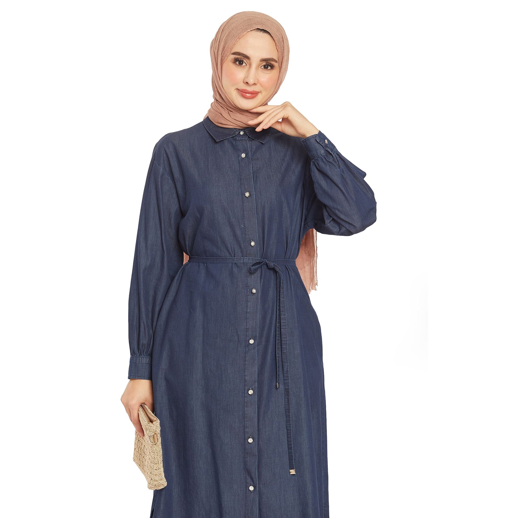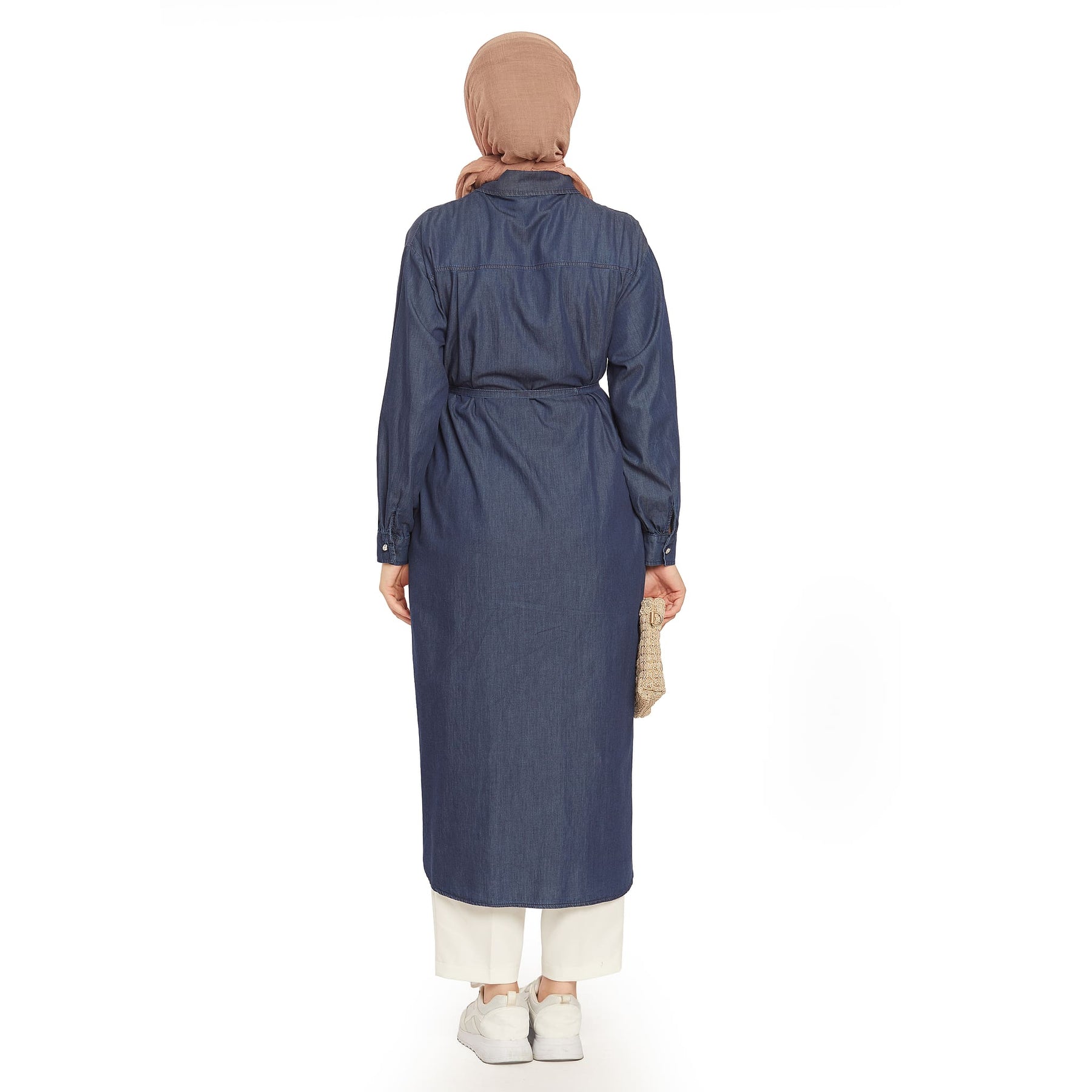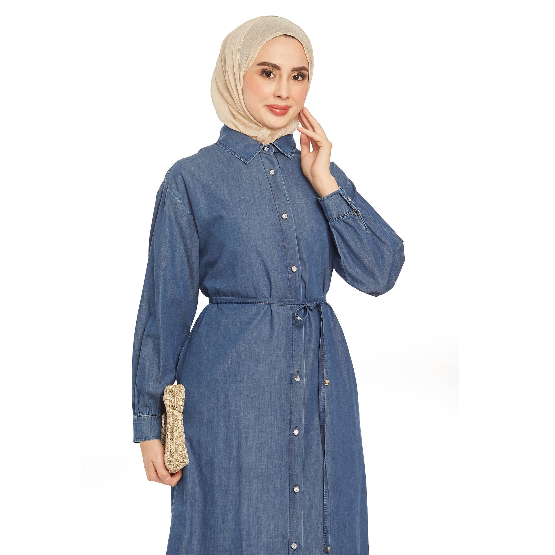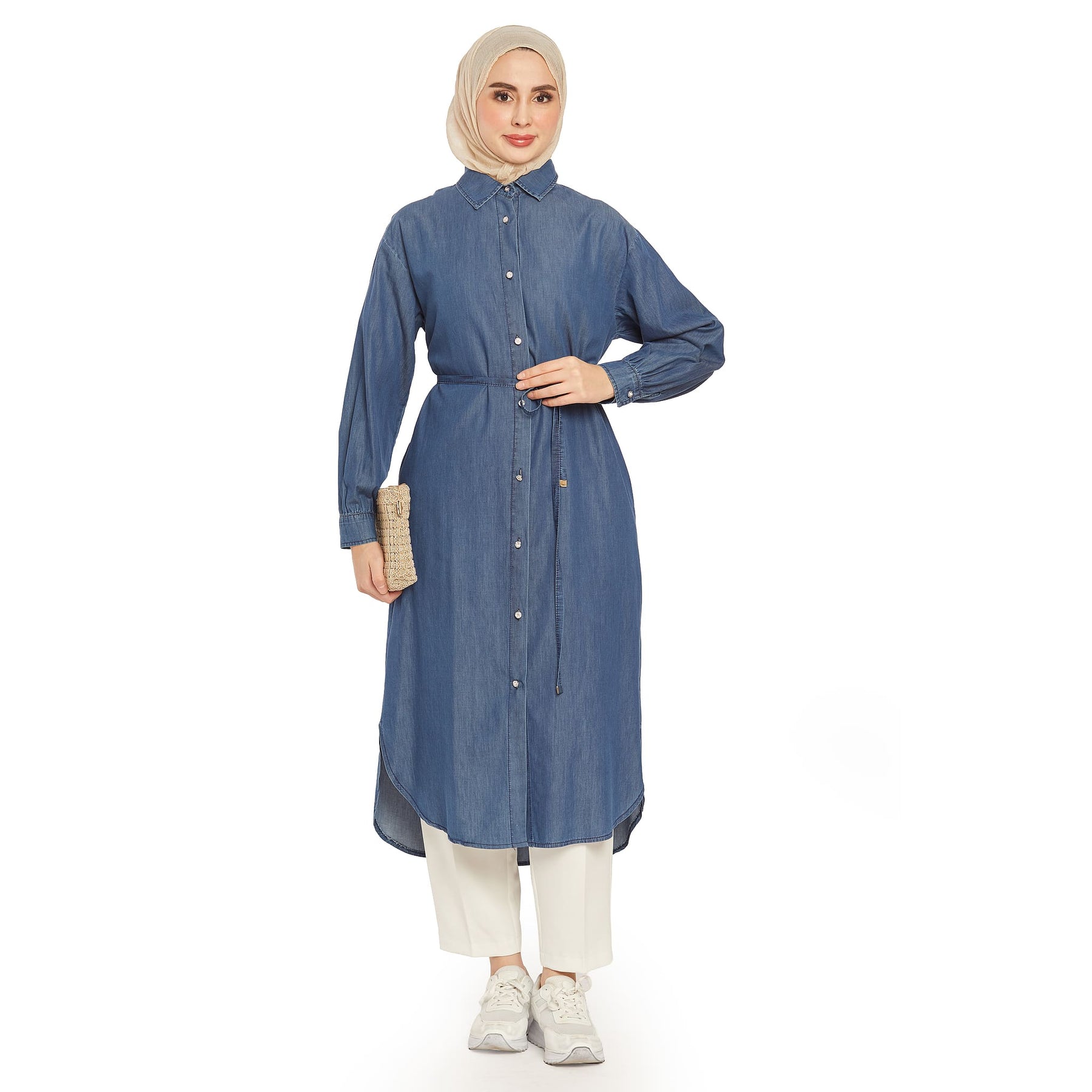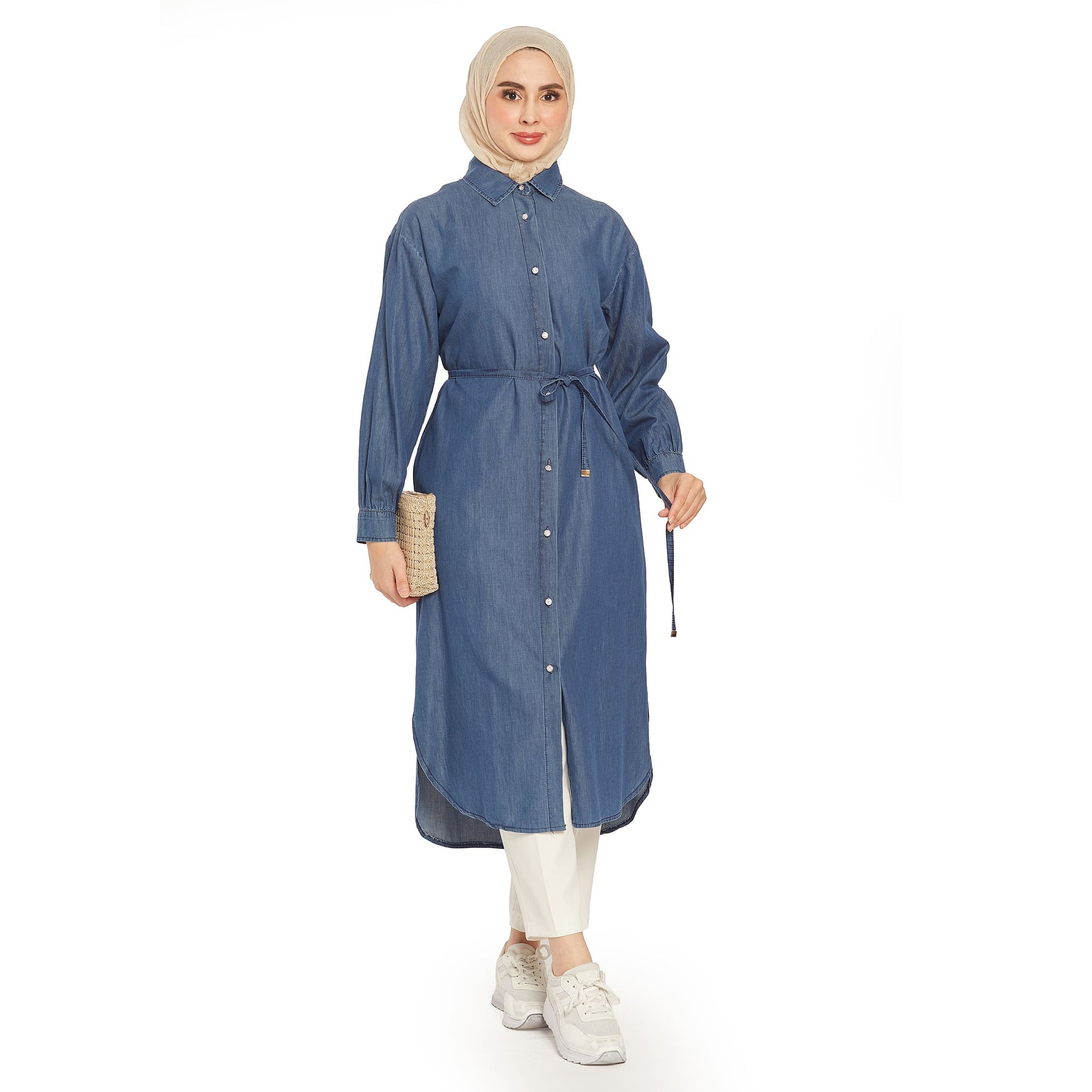 The stone button denim tunic features elegant stone button details, perfect for summer and spring wear. The polo collar adds a classic touch, while the thin denim belt at the waist accentuates the silhouette.