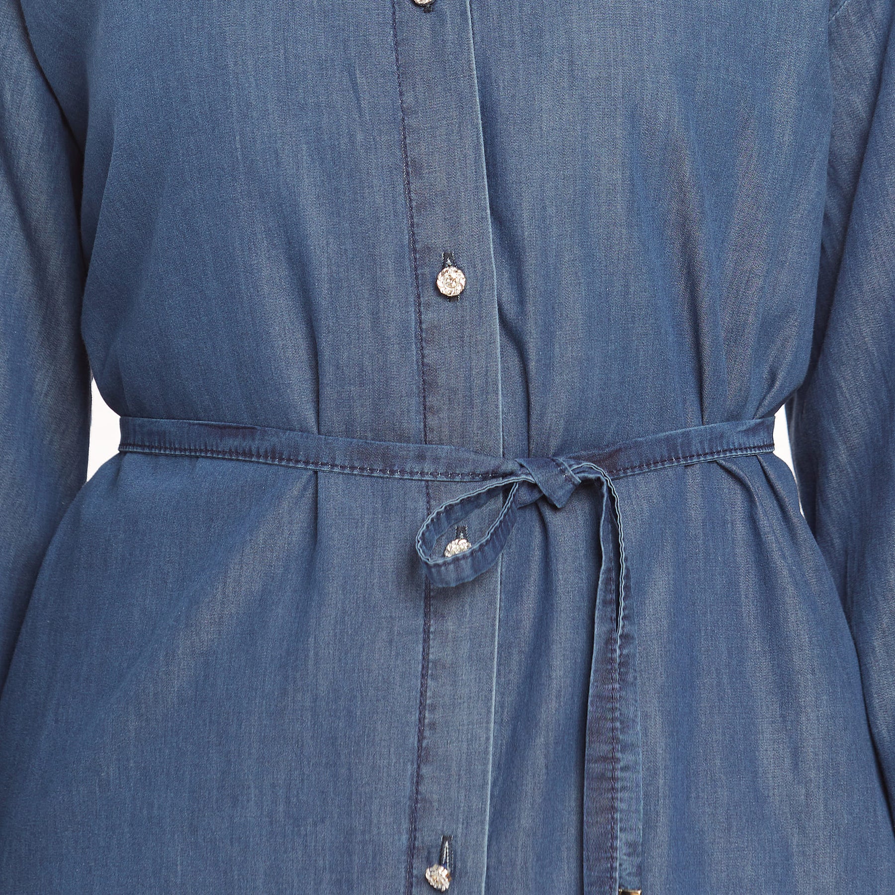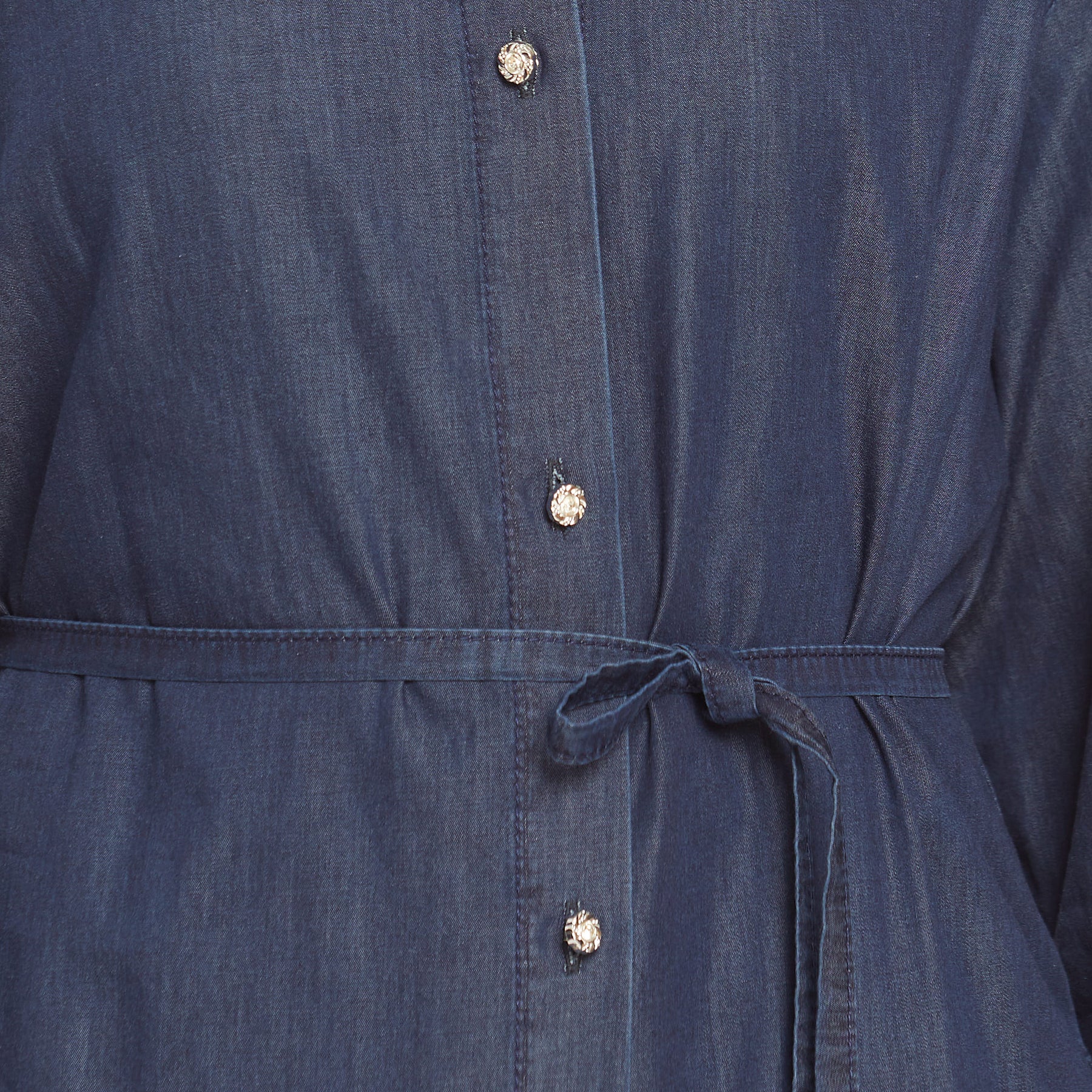 • Detail: Stone buttons, thin denim belt for waist shaping