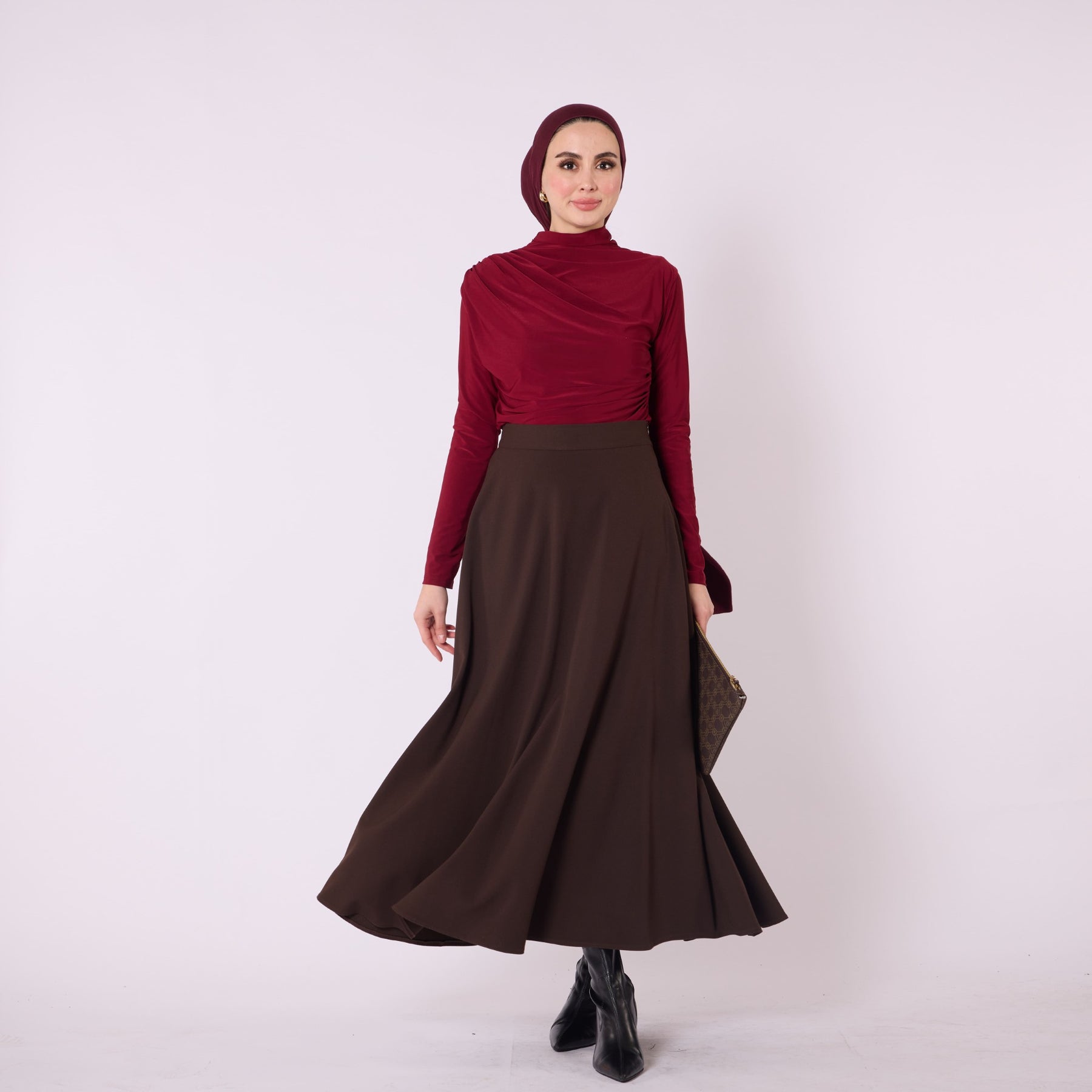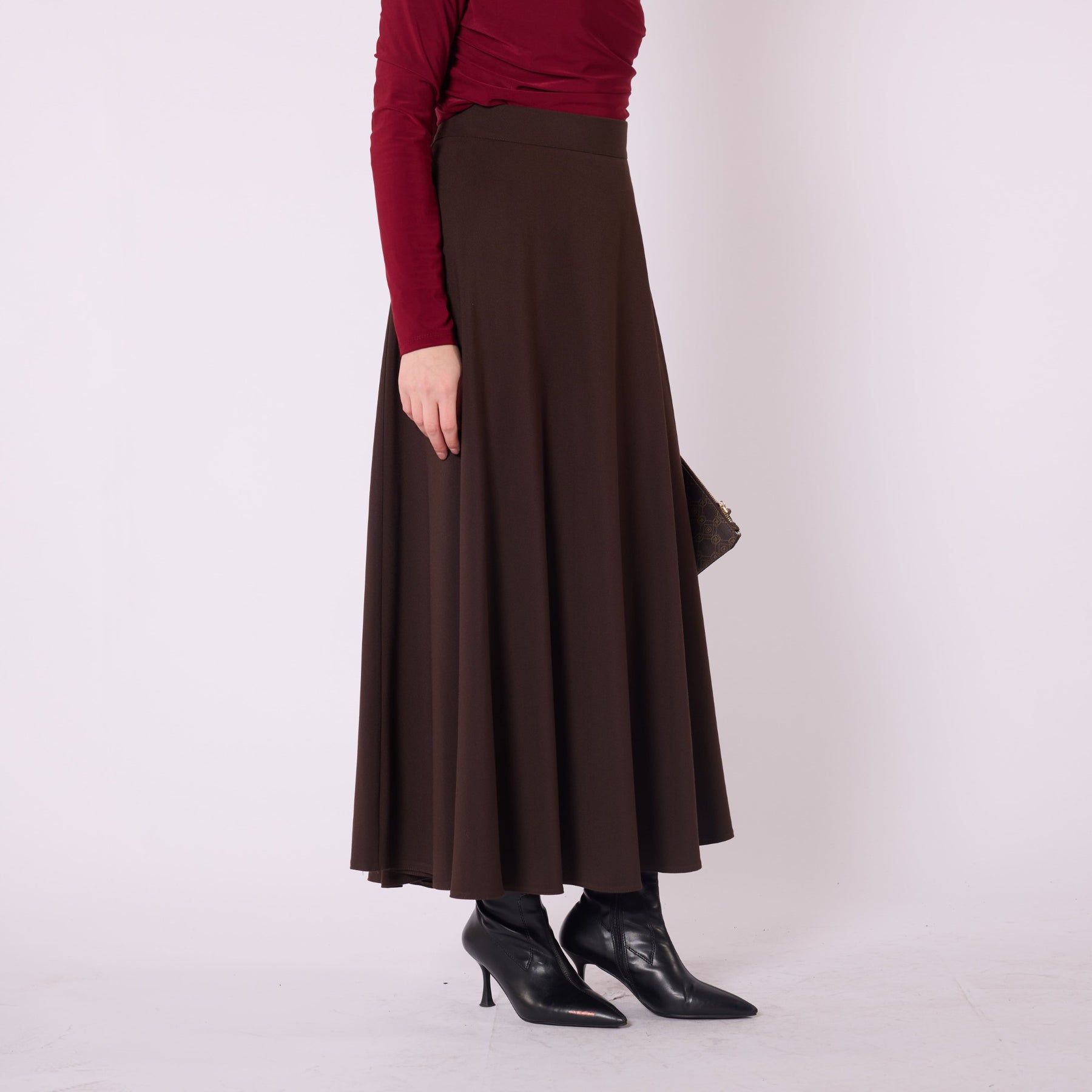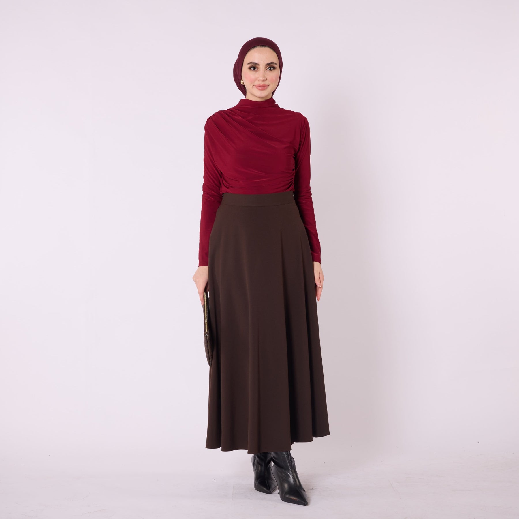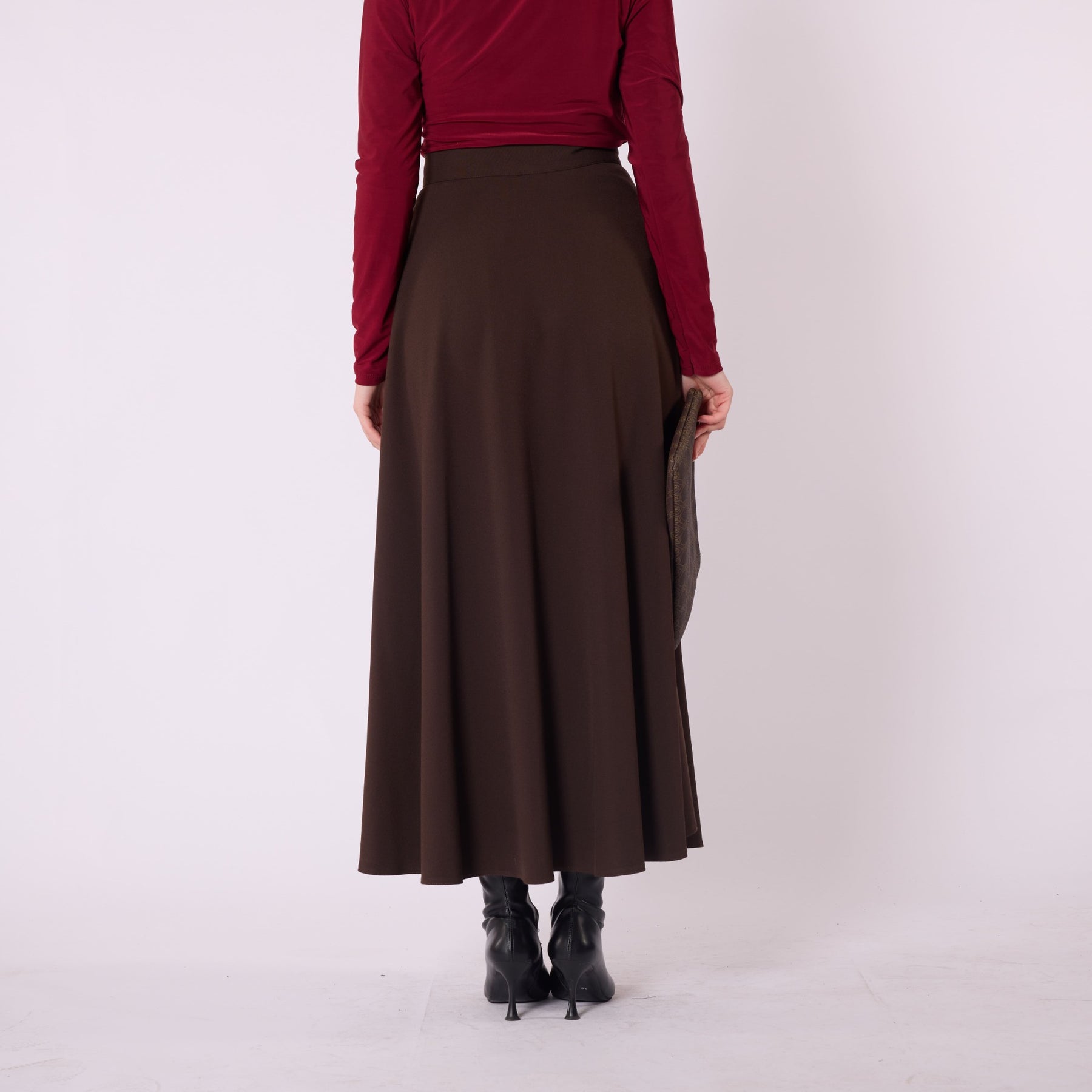 Designed with a relaxed flowing silhouette, this A-line long skirt combines comfort and elegance for both everyday use and office styling. The elastic waistband enhances ease of wear, while the winter-weight fabric provides warmth without compromising movement. Its unlined construction keeps the skirt lightweight, allowing effortless pairings with sweaters, blouses or long cardigans. Available in brown, light brown and black, it offers a timeless, versatile look suitable for modern wardrobes.