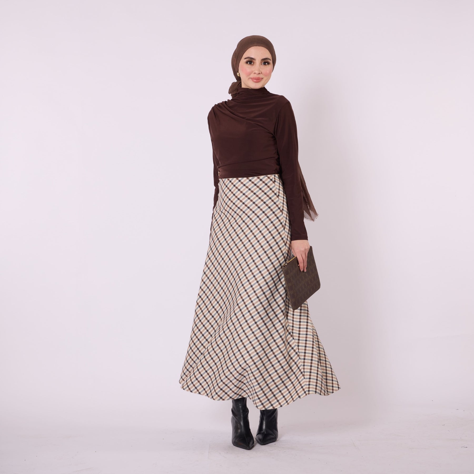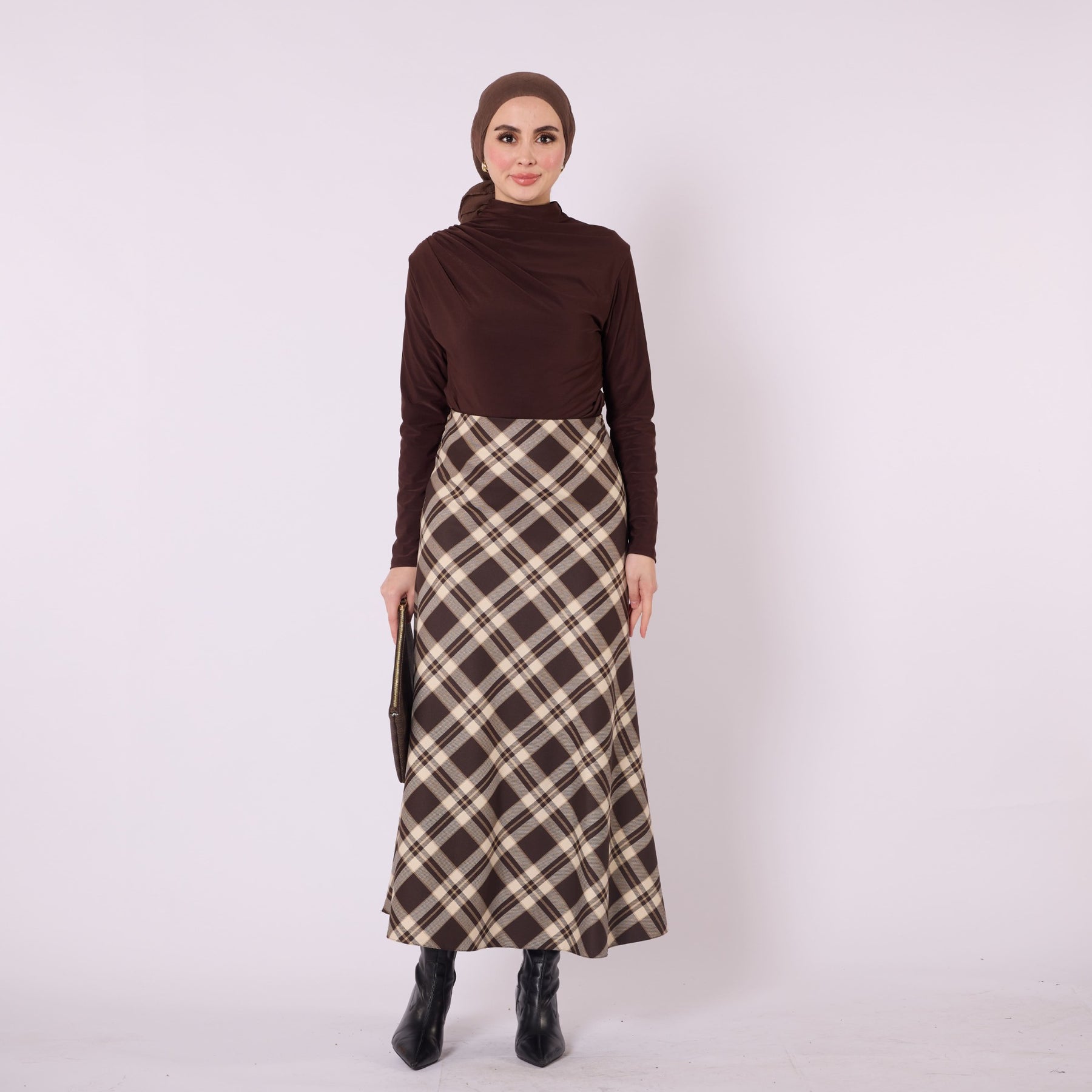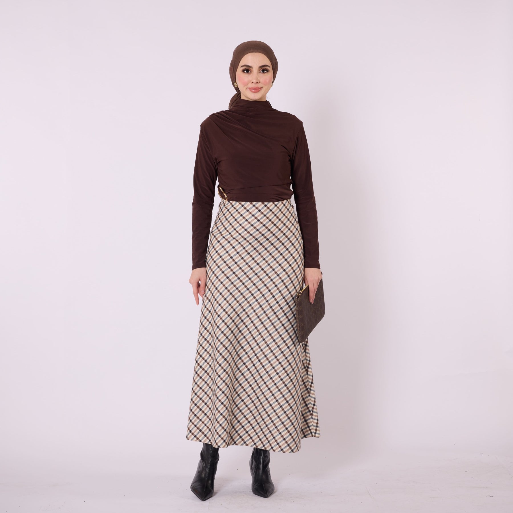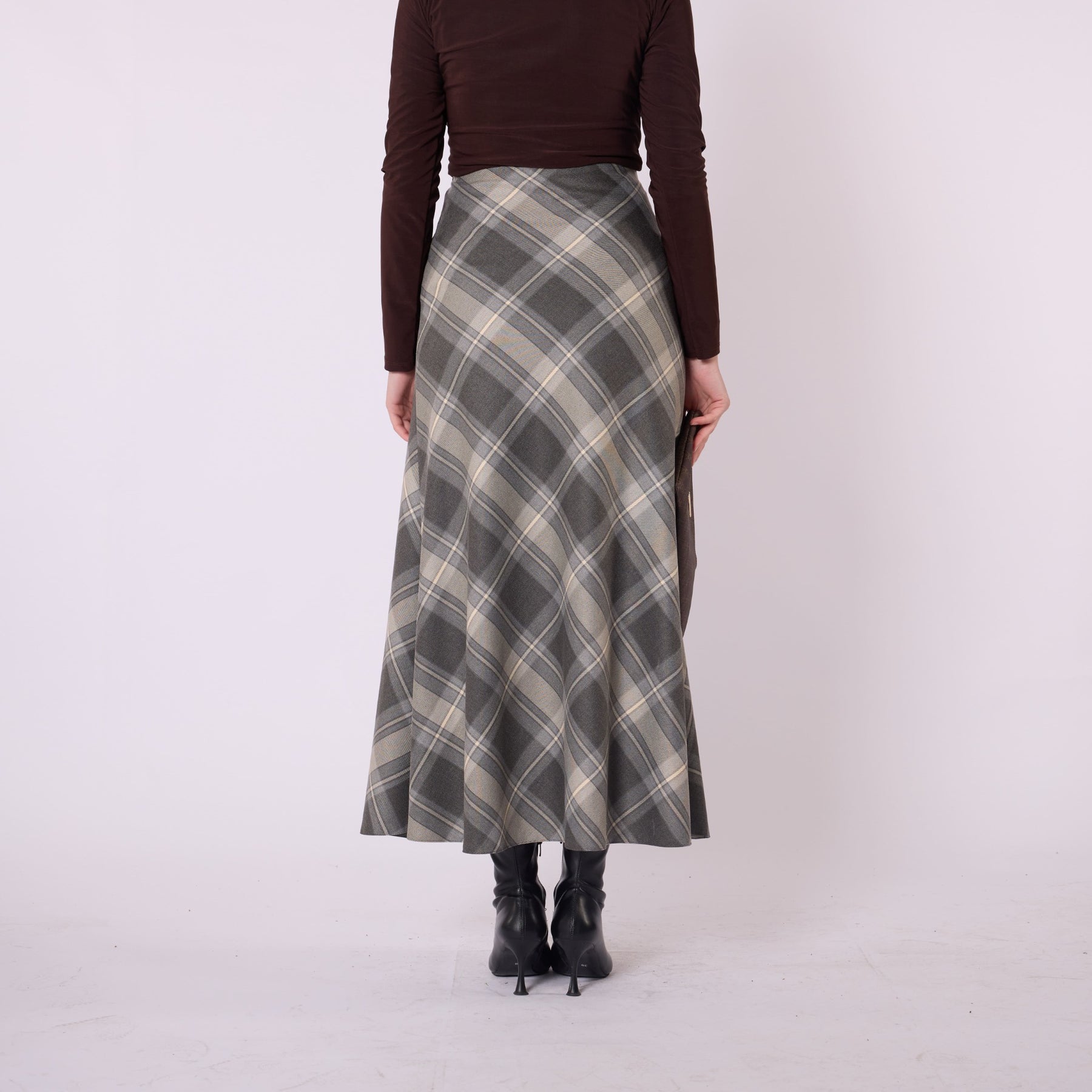 Designed with a soft winter texture, this plaid long skirt offers warmth and comfort with its high-waist, elastic design. Its unlined structure provides a lightweight and flowy silhouette, making it ideal for everyday wear. Available in beige, burgundy, grey, navy and brown, it pairs effortlessly with knitwear, cardigans and simple tops. The timeless plaid pattern adds a refined touch to cold-season outfits while ensuring practicality and versatility.