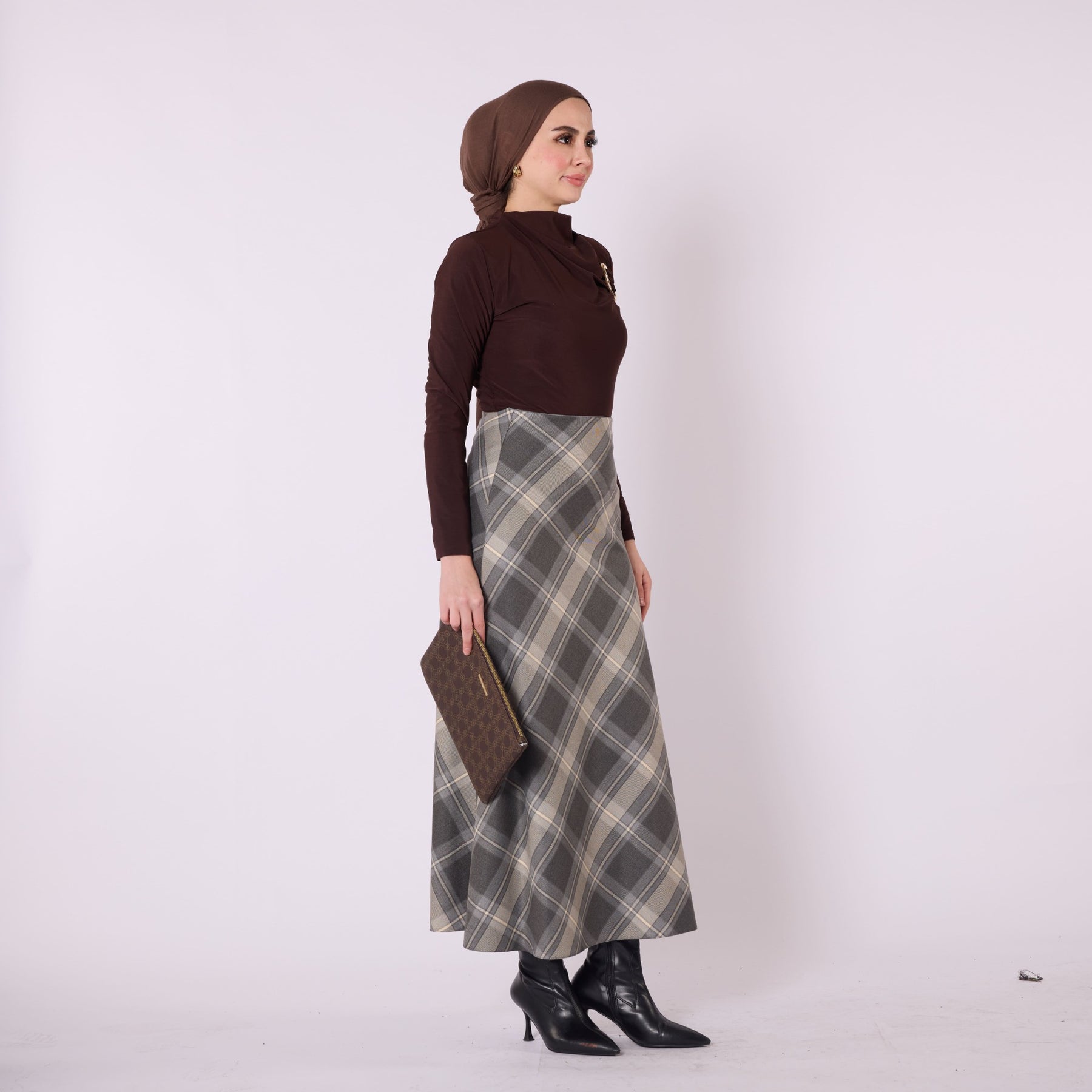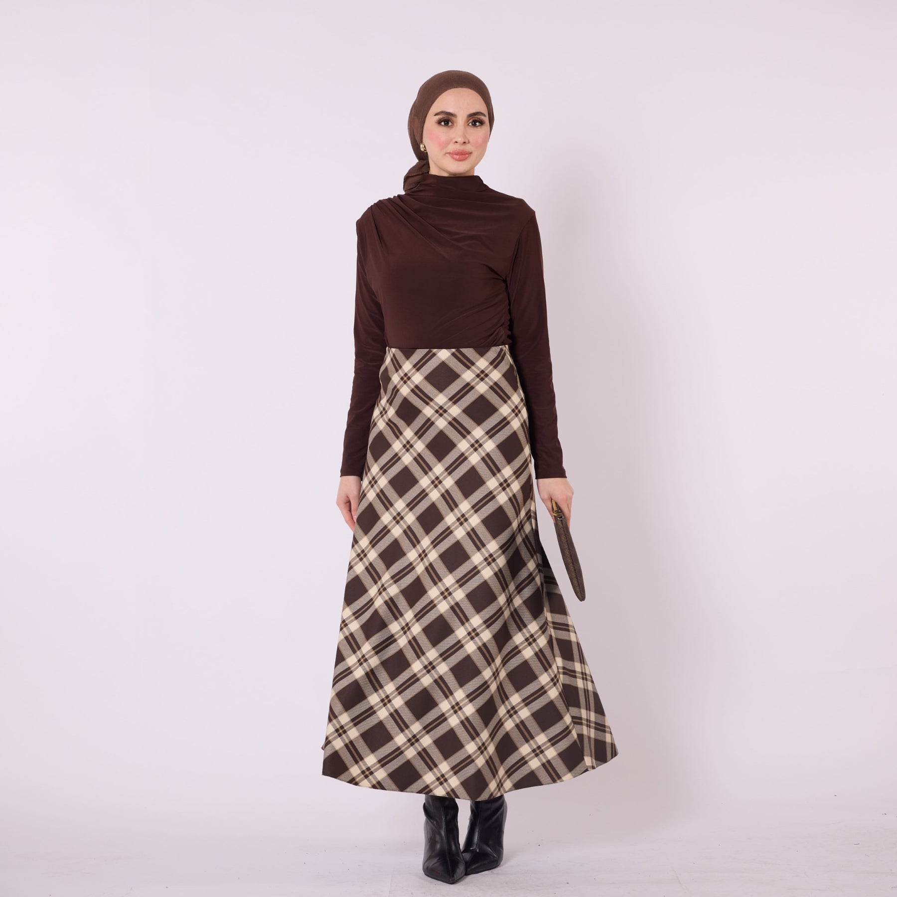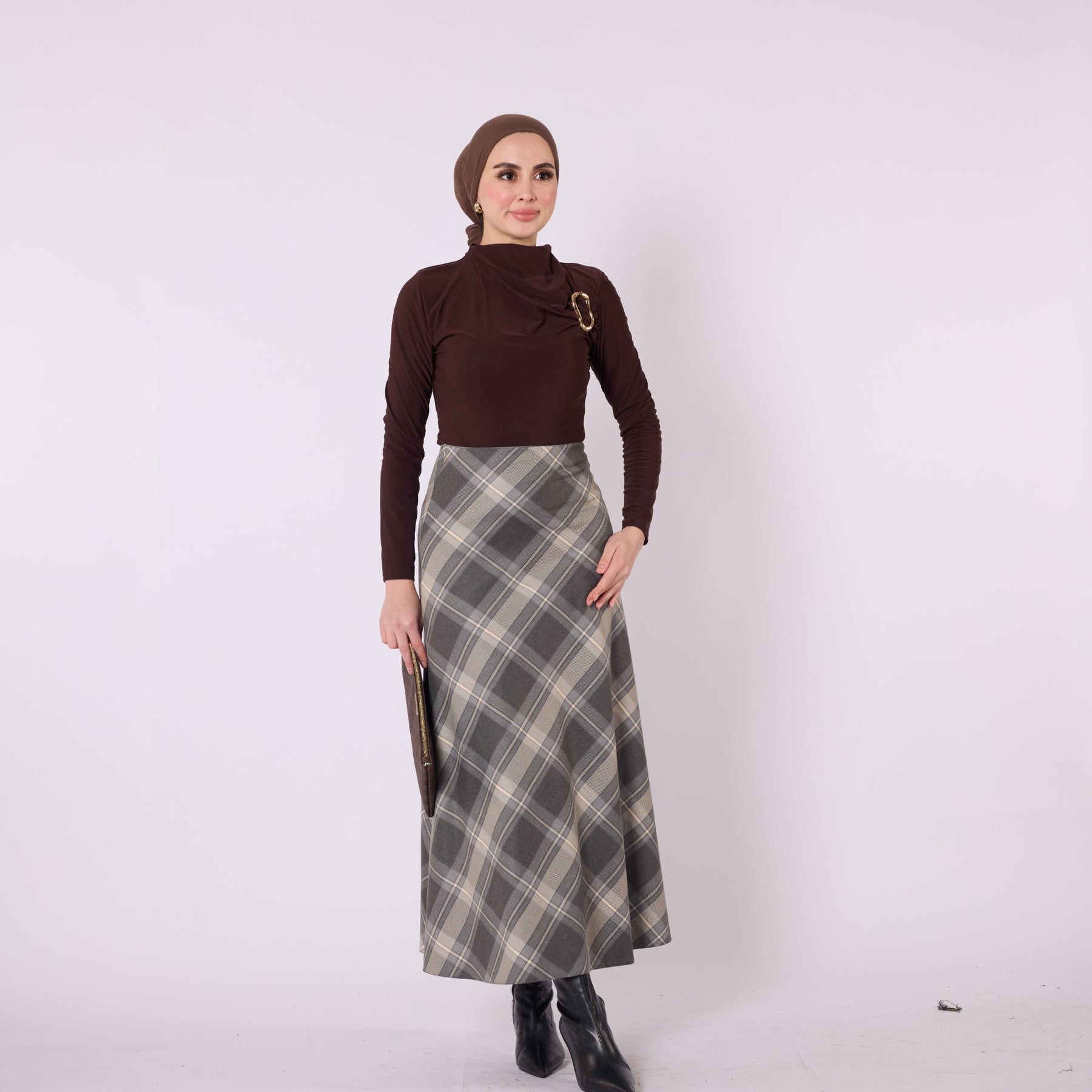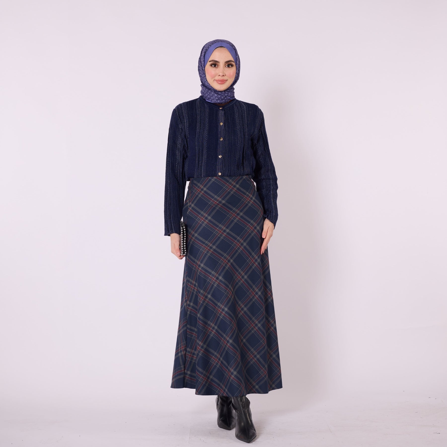 Designed with a soft winter texture, this plaid long skirt offers warmth and comfort with its high-waist, elastic design. Its unlined structure provides a lightweight and flowy silhouette, making it ideal for everyday wear. Available in beige, burgundy, grey, navy and brown, it pairs effortlessly with knitwear, cardigans and simple tops. The timeless plaid pattern adds a refined touch to cold-season outfits while ensuring practicality and versatility.
