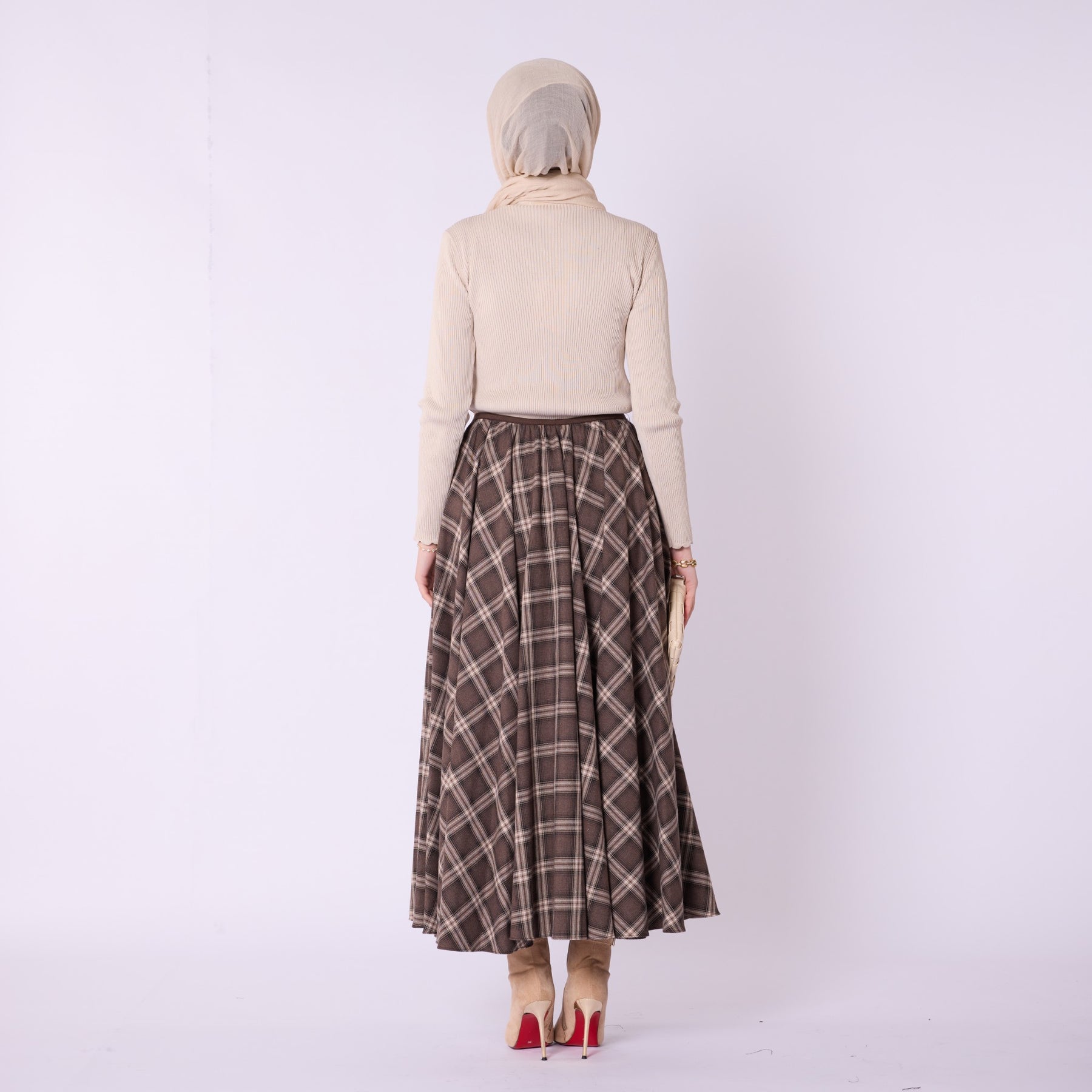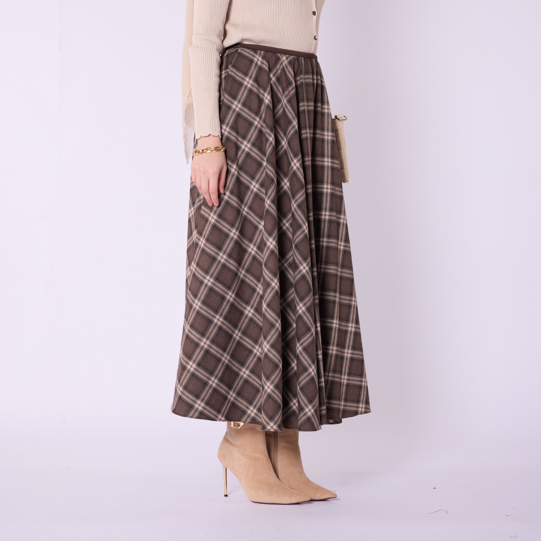 Combining the timeless charm of plaid with a modern silhouette, this elastic-waist pleated skirt is a comfortable and stylish choice for everyday wear. Crafted from lightweight 100% polyester fabric, it provides ease of movement throughout the day, while its unlined structure offers a free-flowing drape. Available in black and brown tones, it pairs effortlessly with sweaters, shirts, and boots for versatile winter outfits. The pleated design adds natural volume, and the elastic waistband comfortably adapts to different body shapes, making it a practical yet chic wardrobe essential.