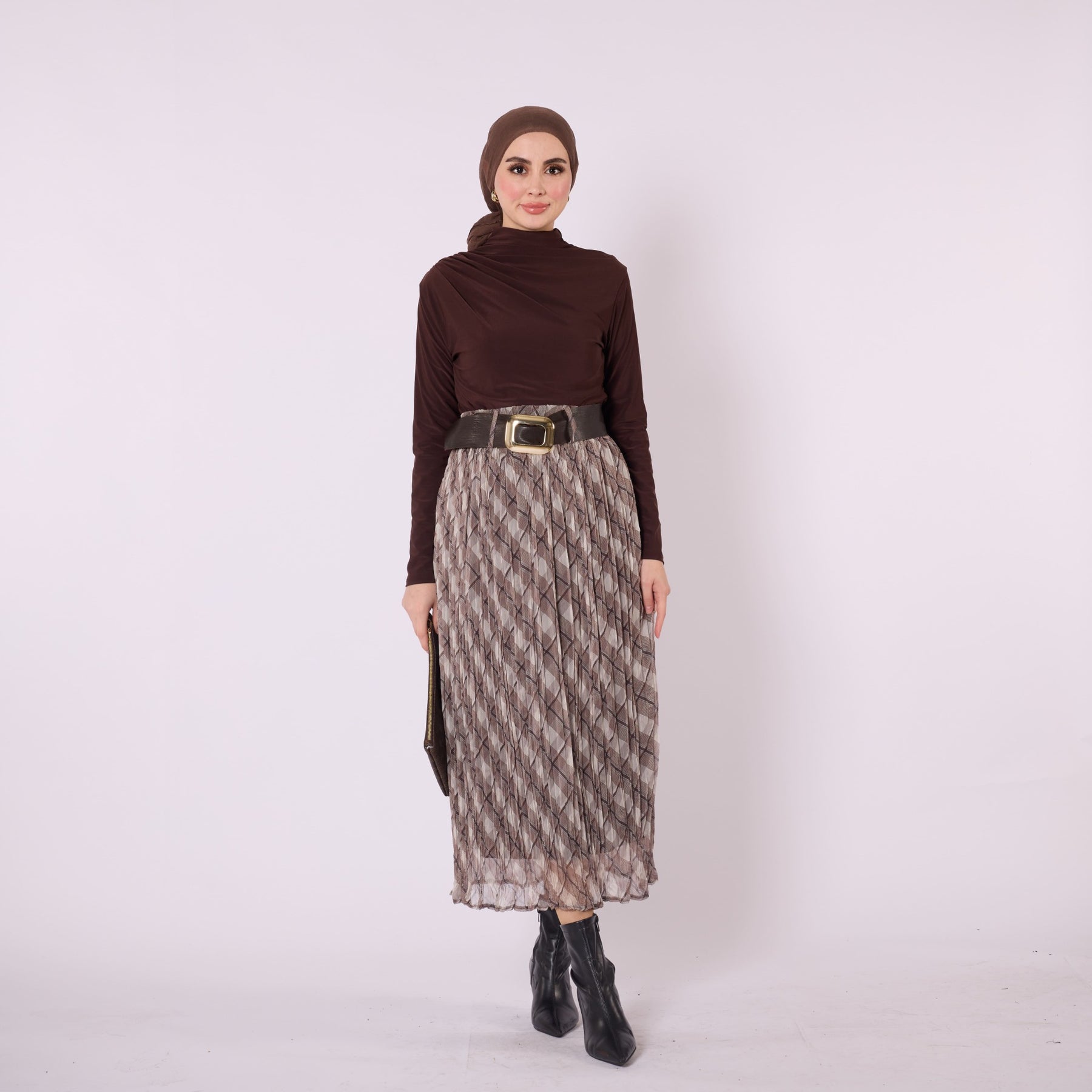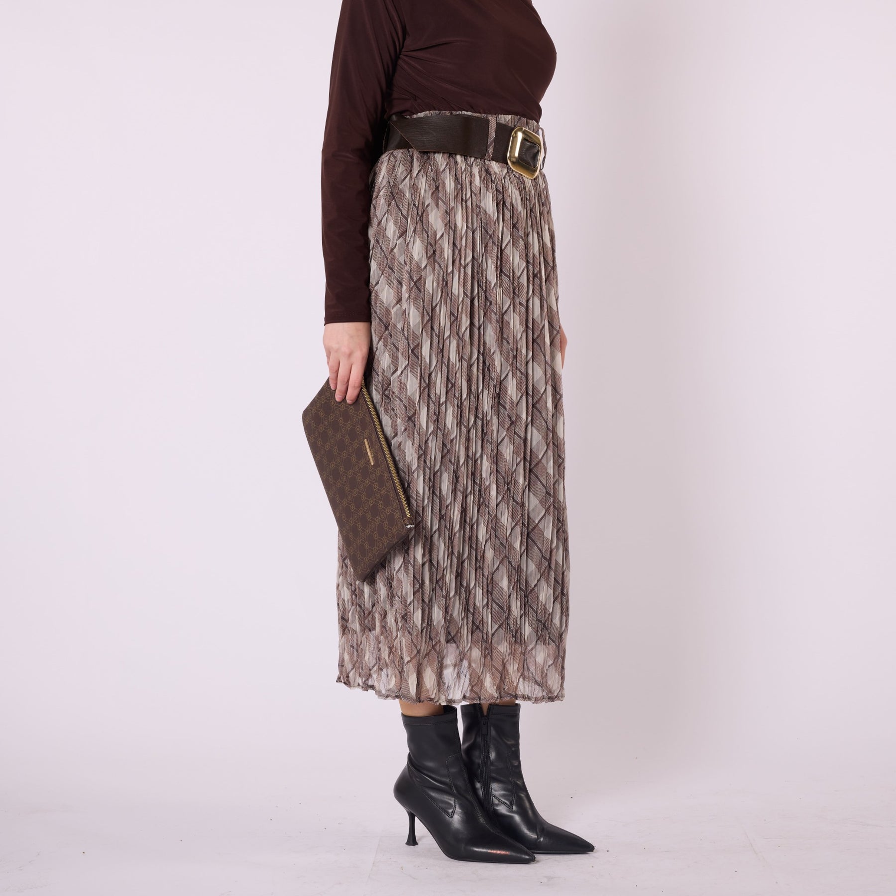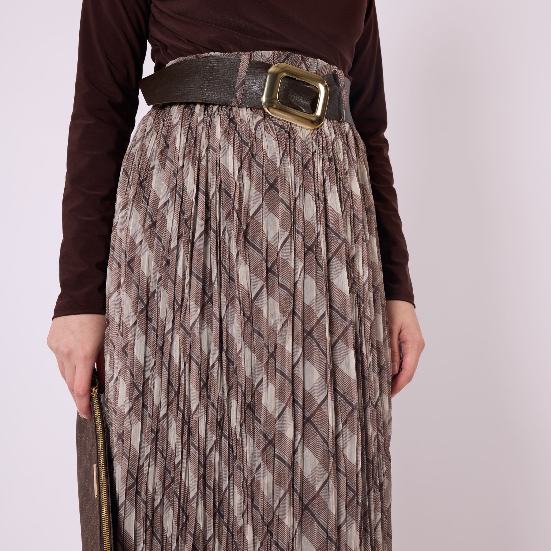 Featuring a refined plaid pattern and soft pleated structure, this belted skirt is a versatile piece suitable for both everyday wear and polished, elegant looks. The elastic waistband provides comfort throughout the day, while the belt detail shapes the silhouette and highlights the waist beautifully. Its lined construction adds warmth and comfort, making it ideal for cooler seasons. Designed in a timeless beige tone, the skirt pairs effortlessly with sweaters, blouses and long cardigans, creating stylish combinations with minimal effort. Perfect for office settings as well as casual city outfits, it adapts easily to different accessories and offers a balanced blend of comfort and sophistication.
