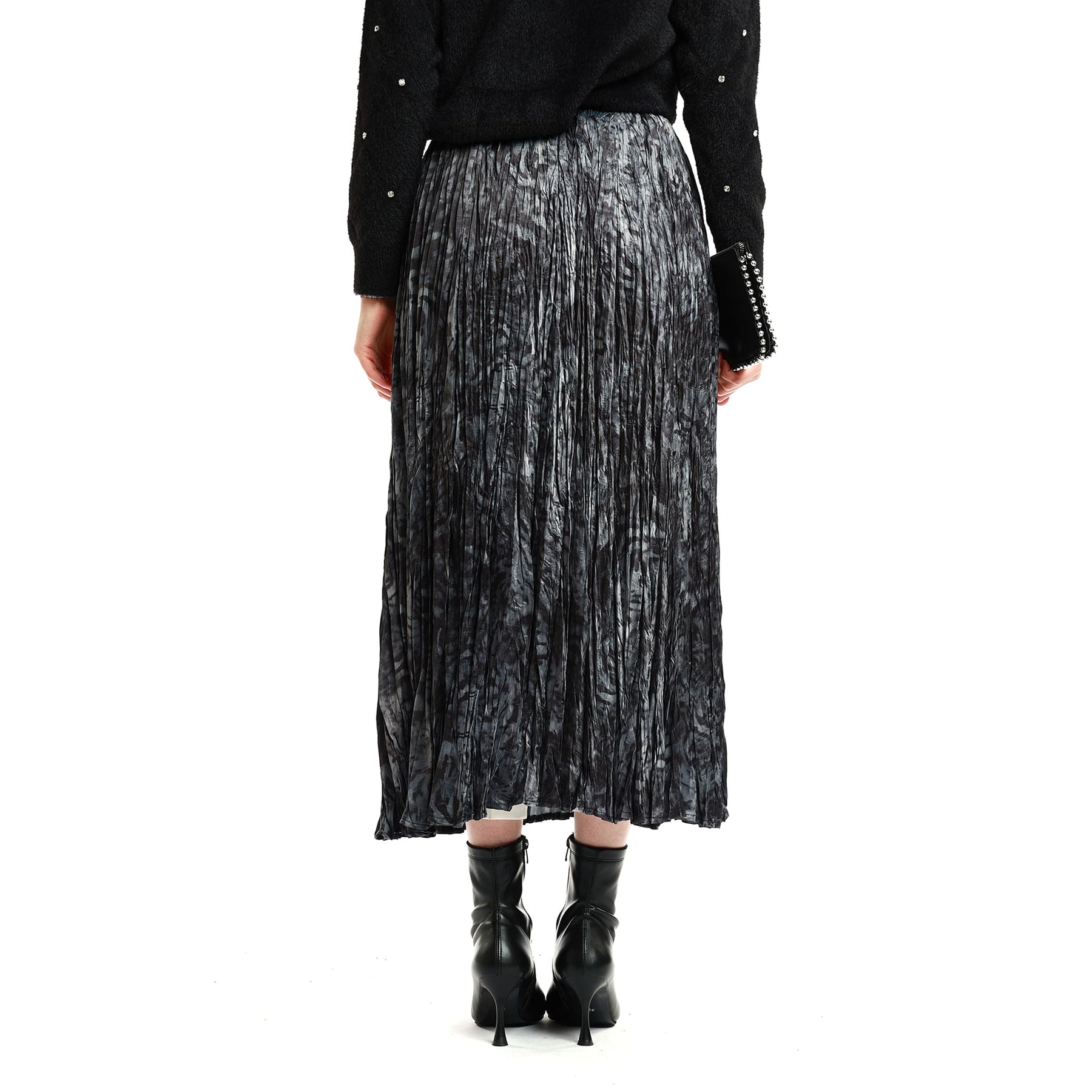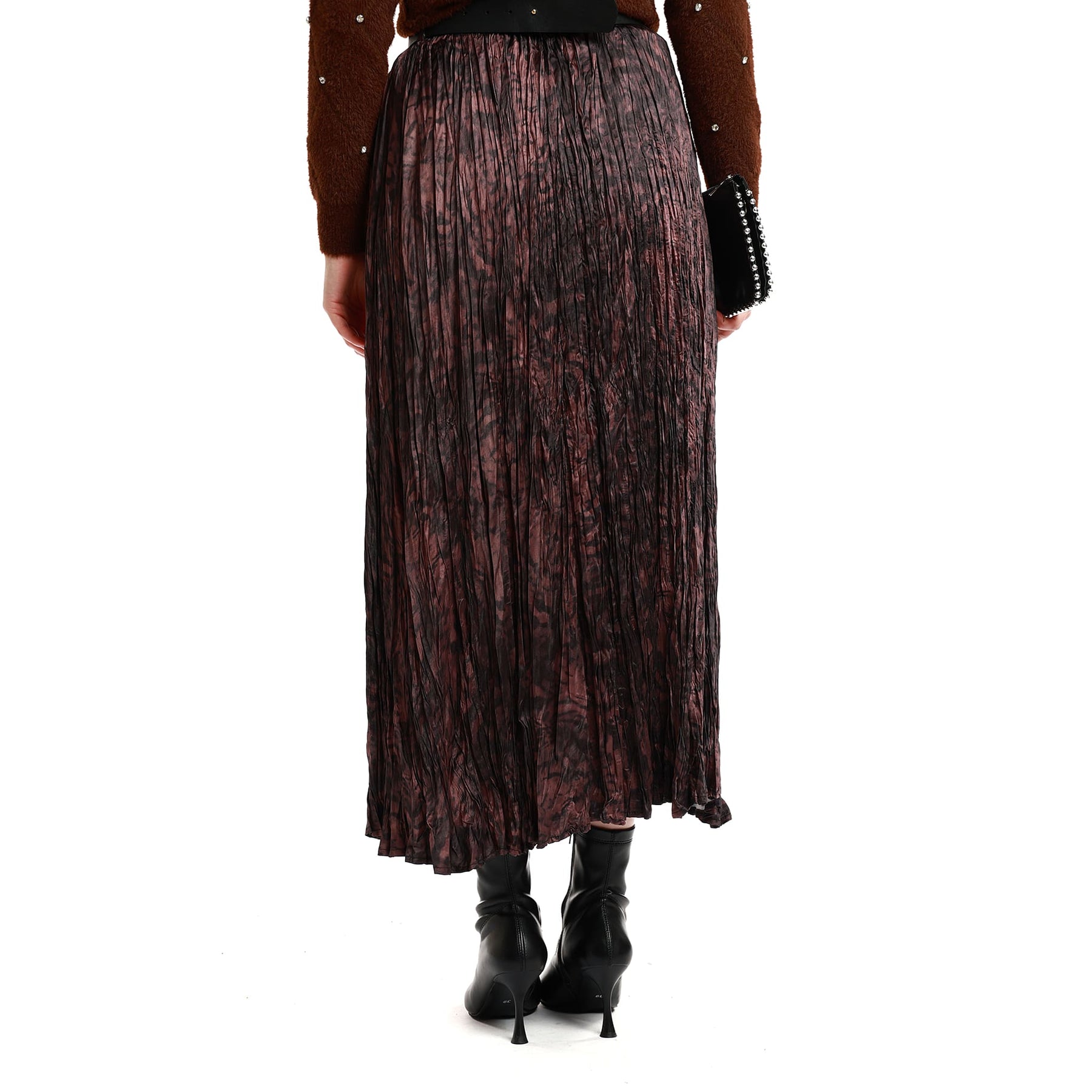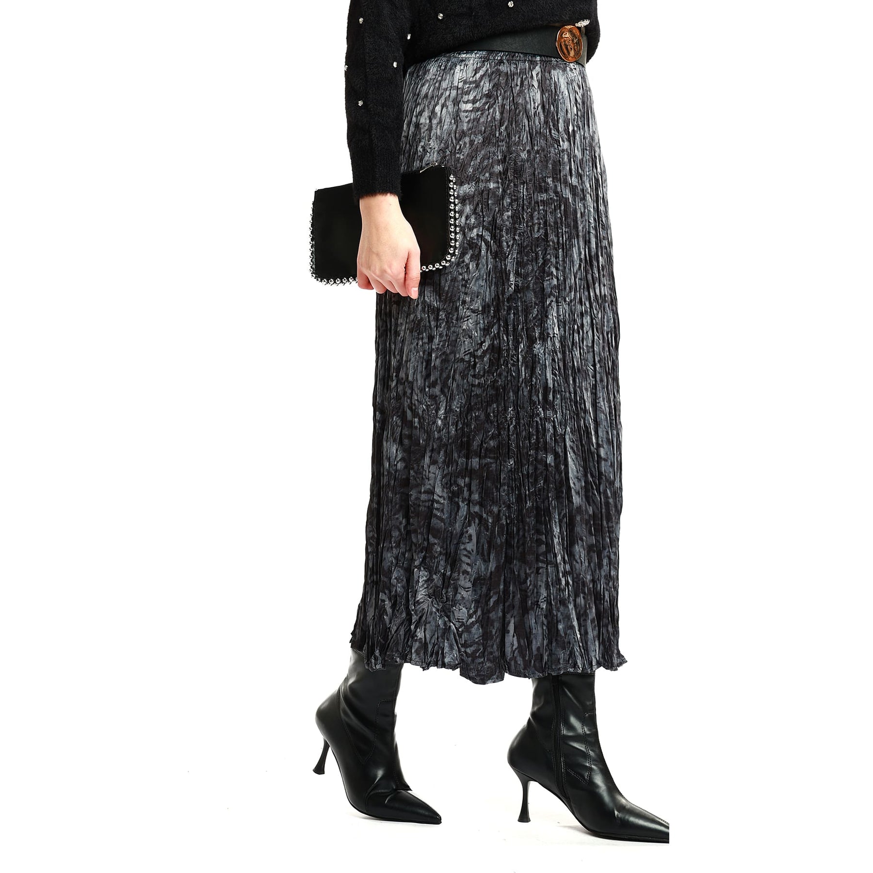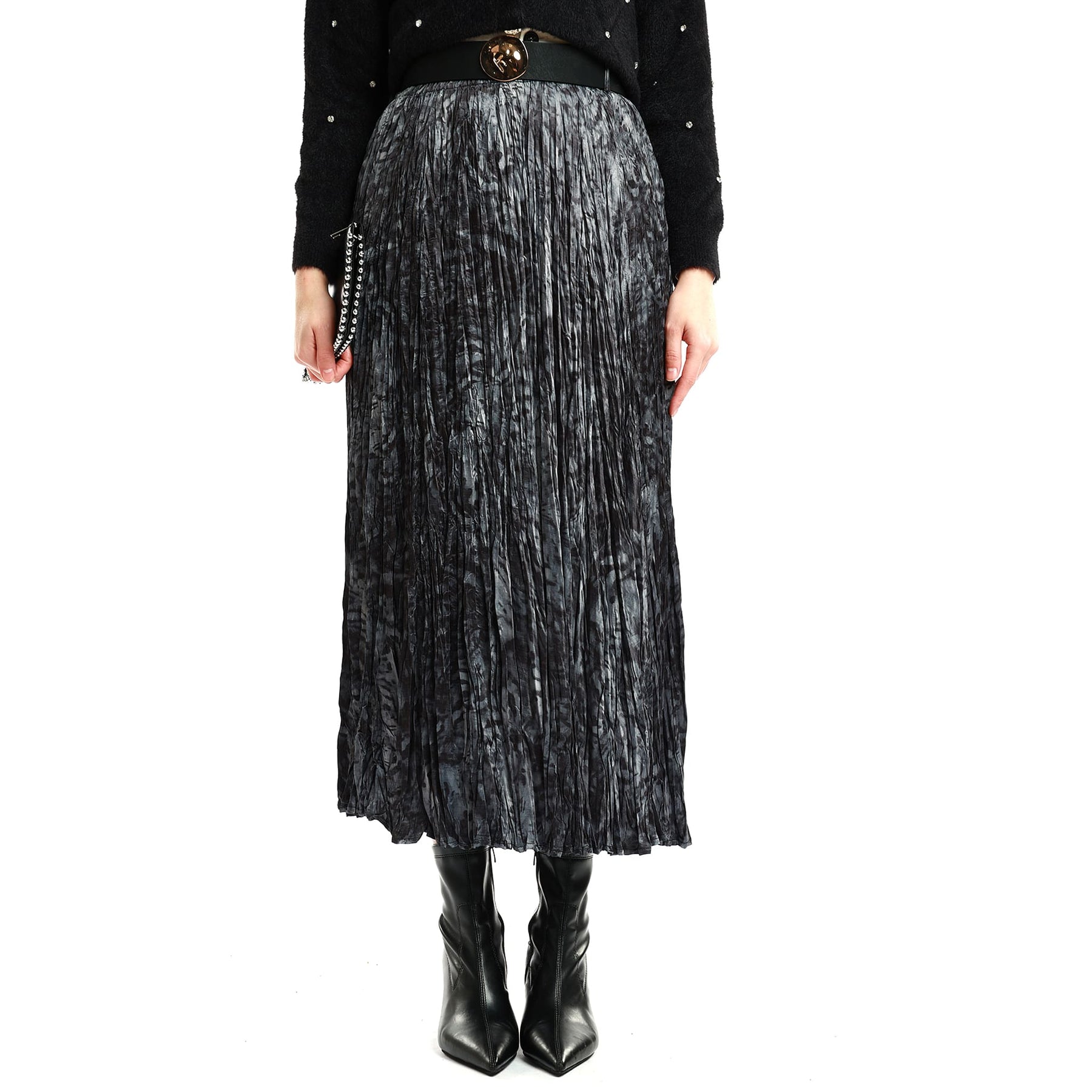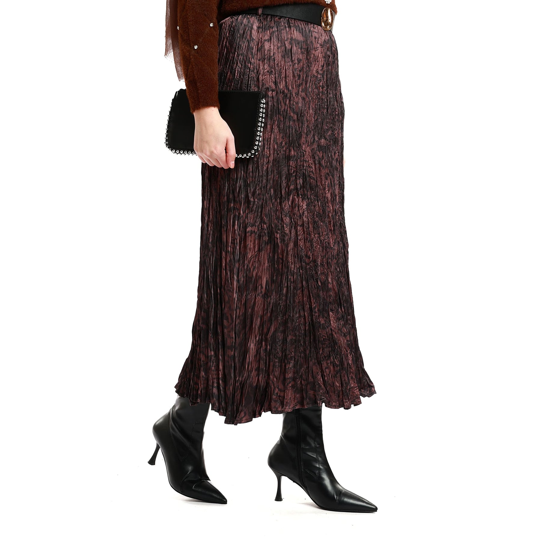 Model: Patterned pleated skirt with belt detail