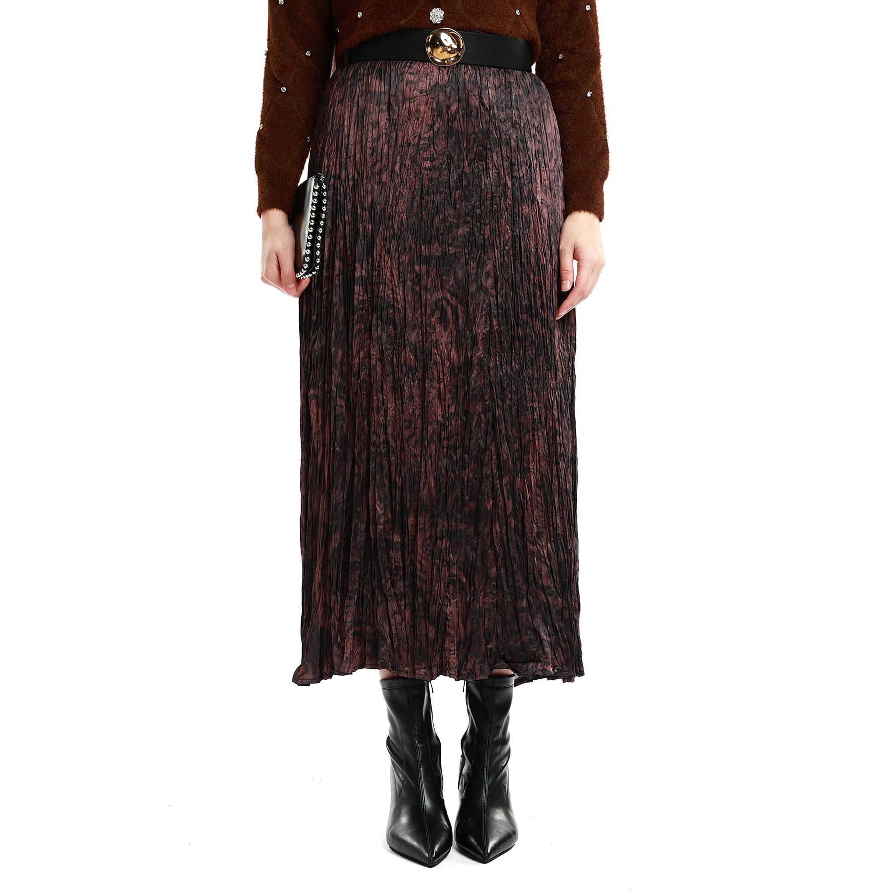 This patterned pleated skirt with a belt detail offers a chic and modern silhouette. Its unlined, lightweight polyester fabric ensures comfort and ease of movement, making it ideal for winter outfits. The gold-colored belt buckle adds an elegant accent to the waistline, while the self-patterned texture provides a refined look without printed designs.