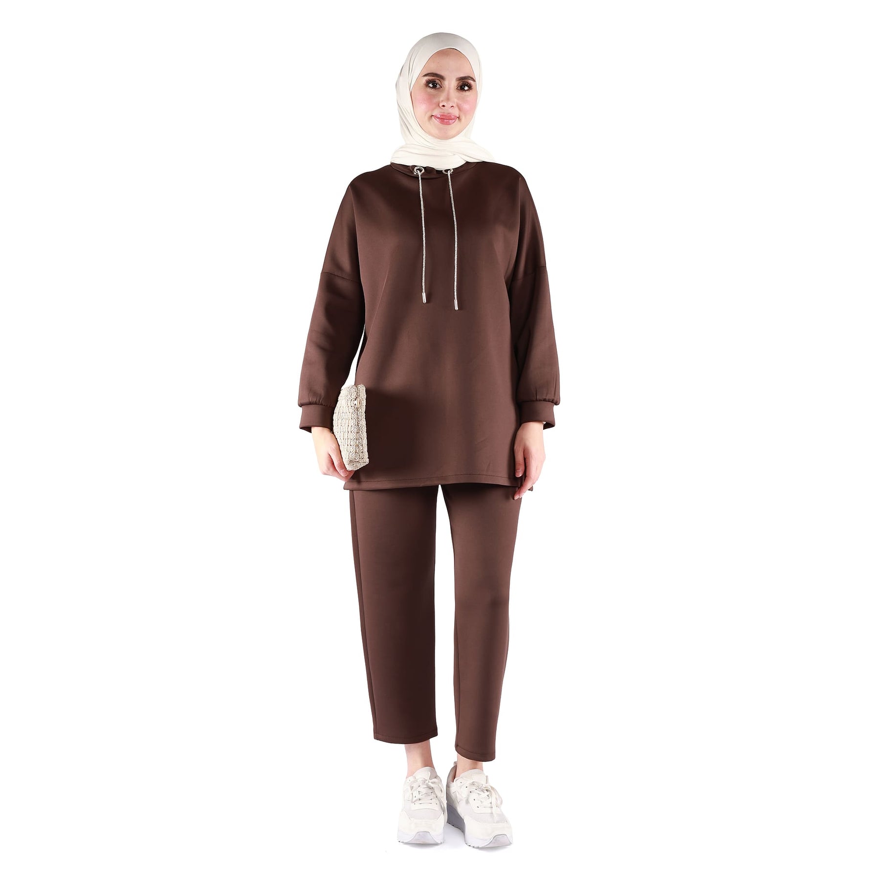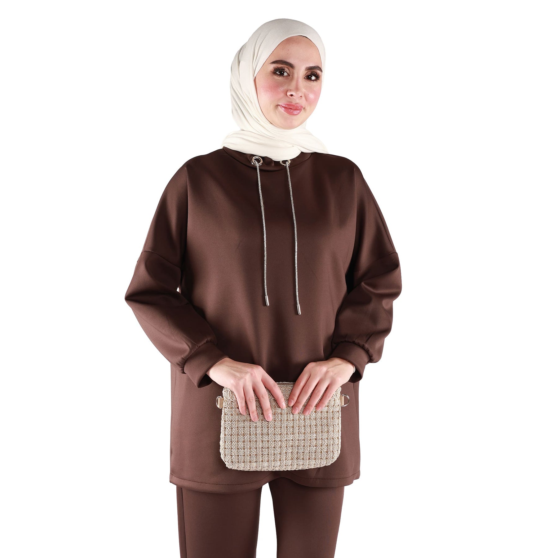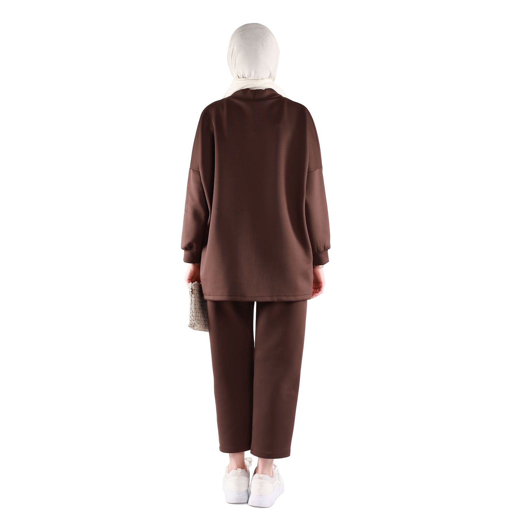 The trousers are designed with an elasticated waistband, ensuring a comfortable fit that adapts well to different body shapes and makes the set easy to slip on and off. Its relaxed cut makes it suitable for busy days, casual outings or laid-back office environments. Available in khaki, black and brown, this set can be styled with sneakers for a sporty vibe or with loafers and flat shoes for a slightly more refined everyday look. Whether you’re running errands, meeting friends or spending a long day out, the Dropped Shoulder Stand Collar Pants Set offers a balanced mix of comfort, modern style and effortless elegance.