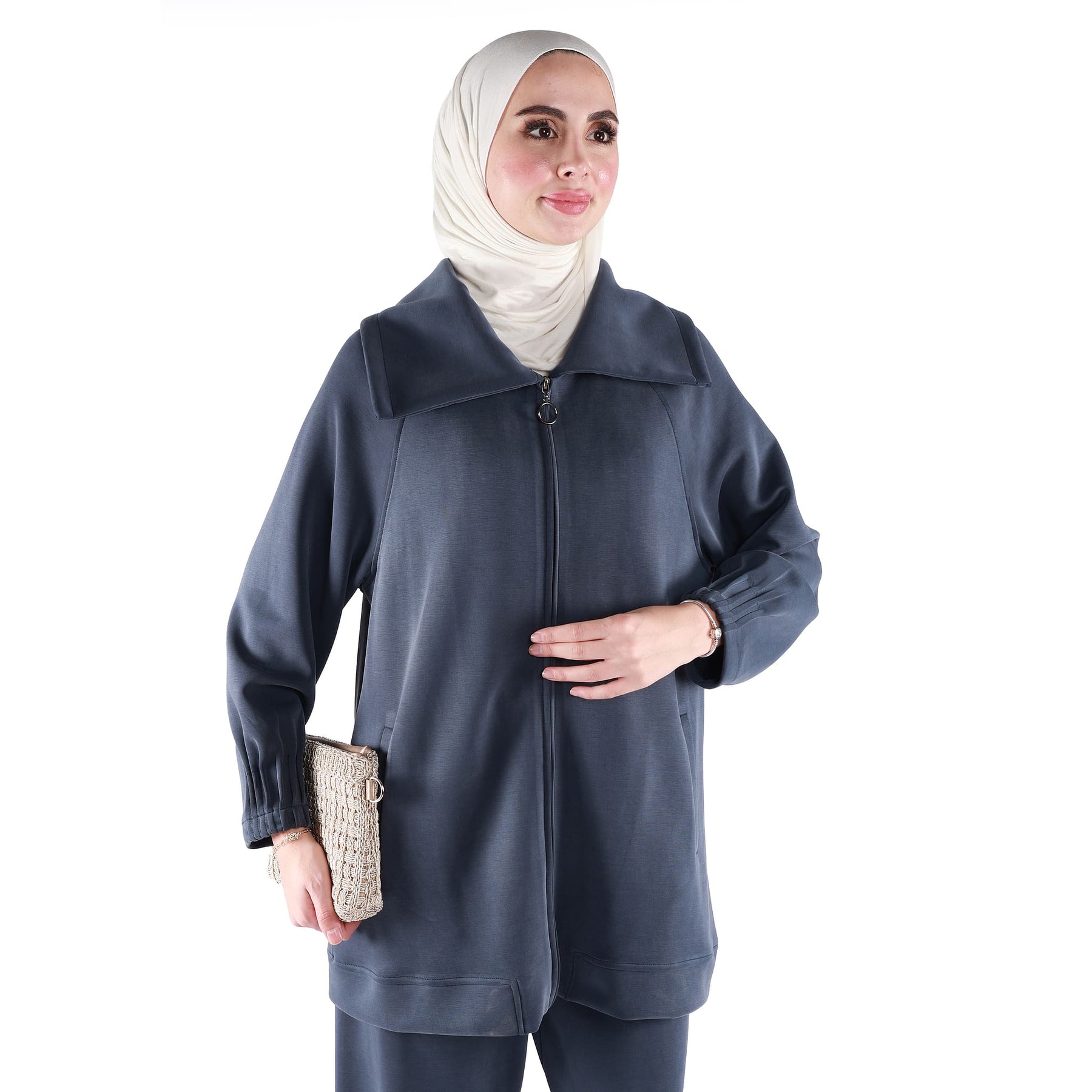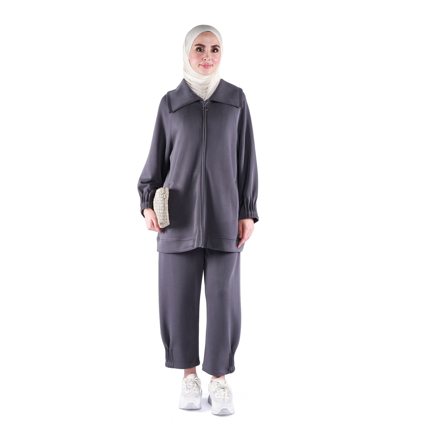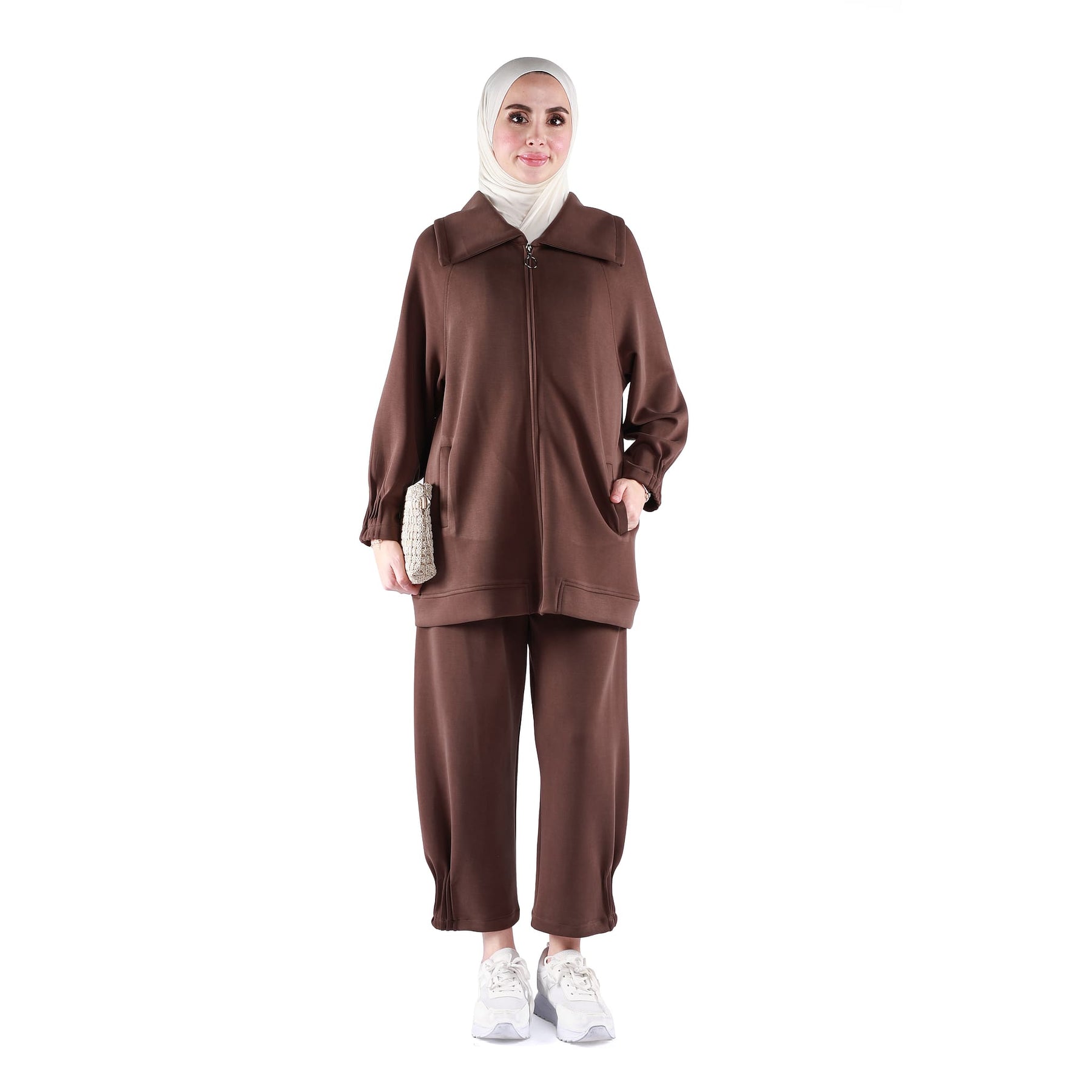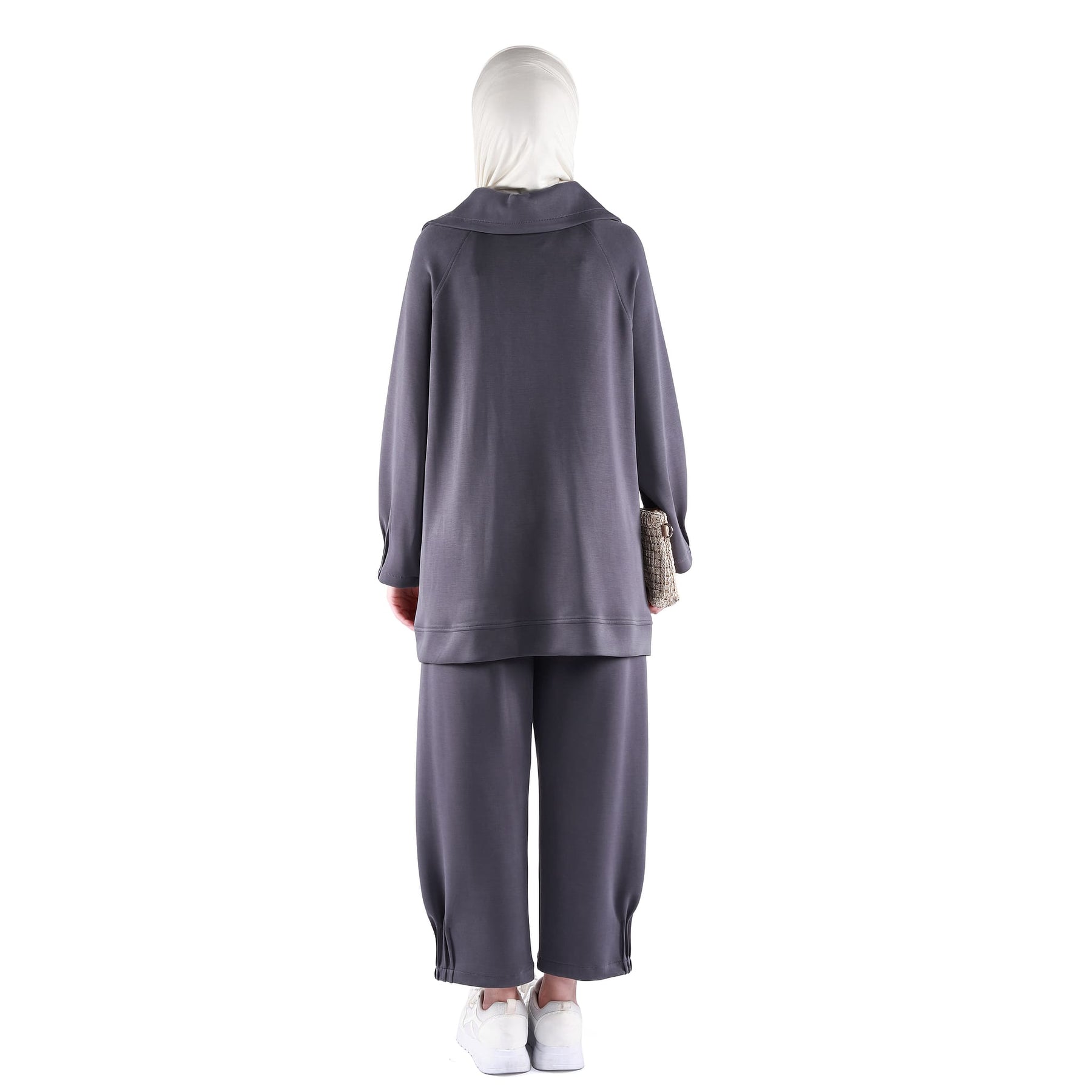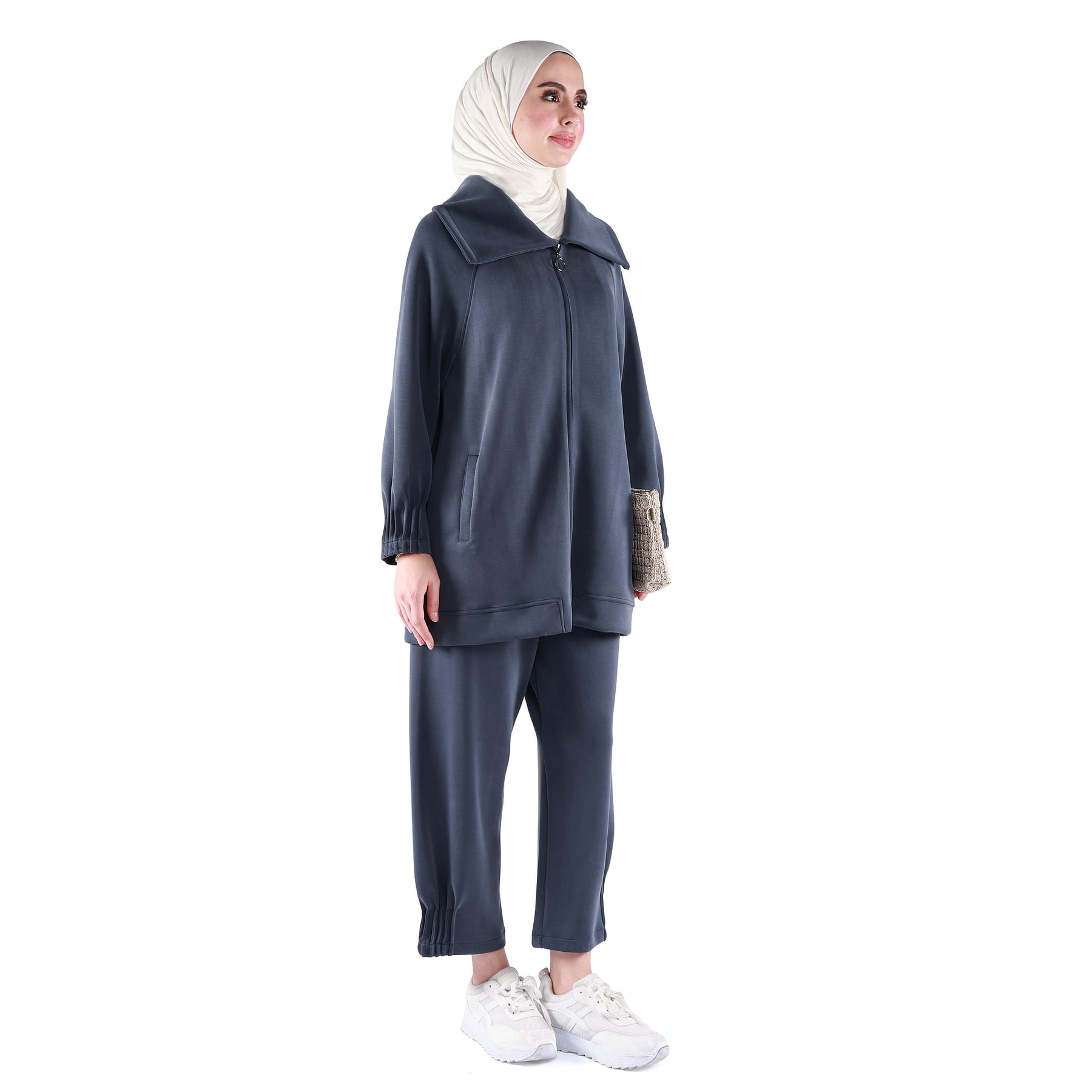 The polo collar zip-up gathered detail set offers comfort and style, perfect for daily wear. Made from 48% polyester, 48% modal, and 6% elastane, it provides a soft, lightweight, and stretchy fabric. The wide polo collar gives a modern look, while the gathered details on sleeves and ankles add a dynamic and stylish touch.