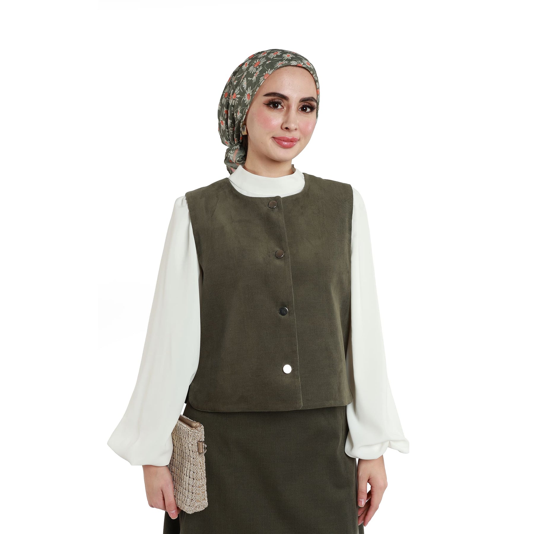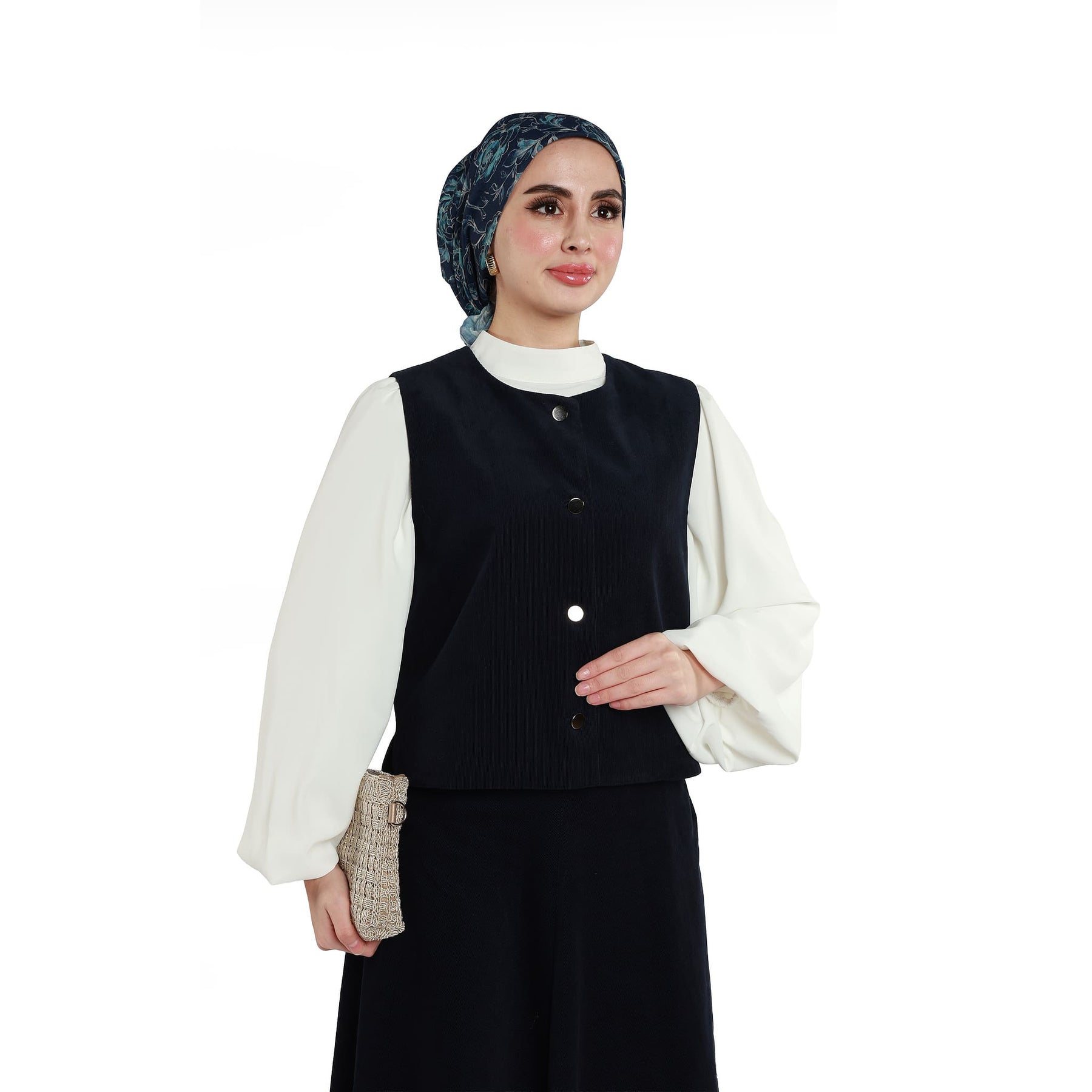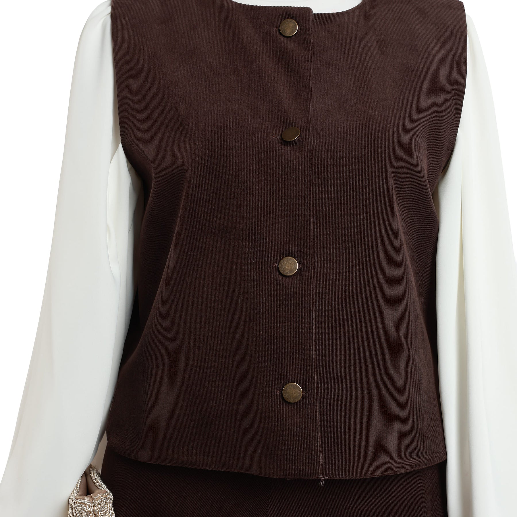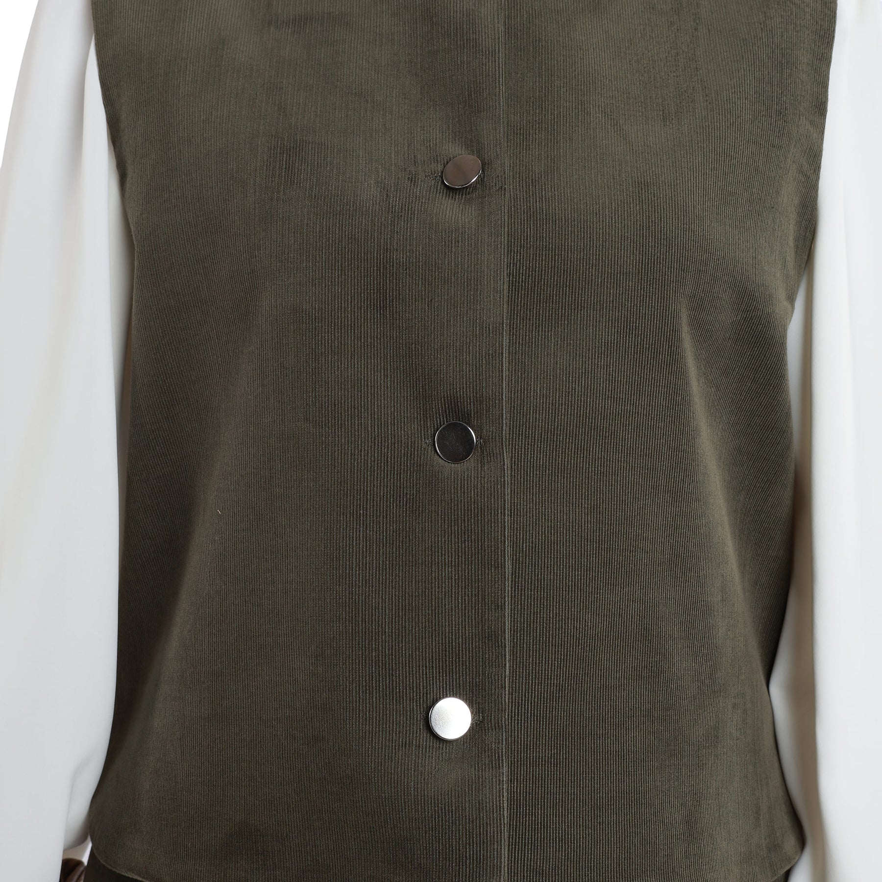 Top Detail: Sleeveless vest with silver button detail