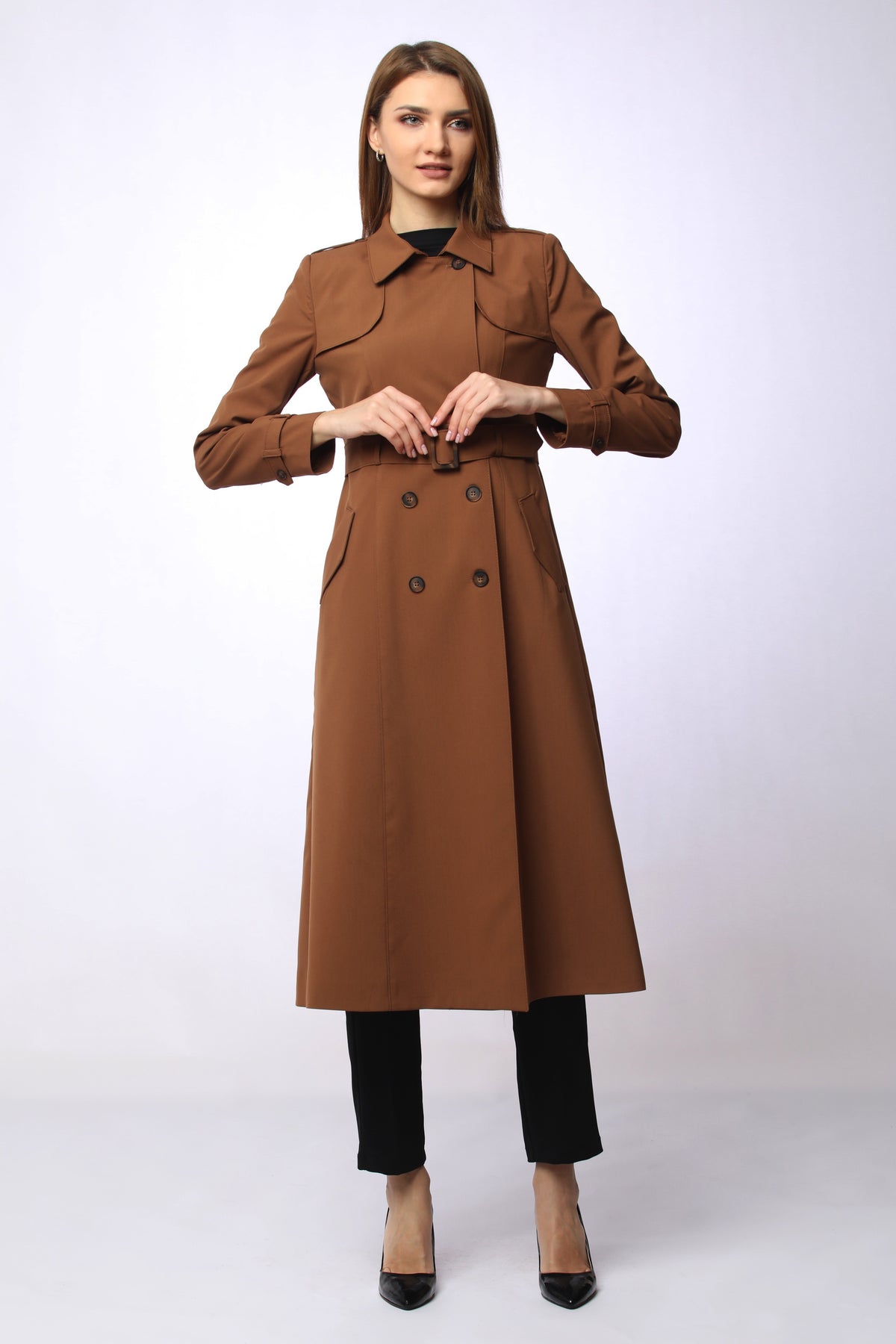 With its refined details and modern design, the polo collar trench coat with epaulet and belt details will be one of the standout pieces in your wardrobe. The polo collar gives it a classic touch, while the epaulet detail on the shoulders and the matching belt bring a contemporary edge. Featuring 8 asymmetric buttons on the front and 2 practical pockets, it is both stylish and functional. The belt buckle harmonizing with the buttons adds to its elegant appeal.