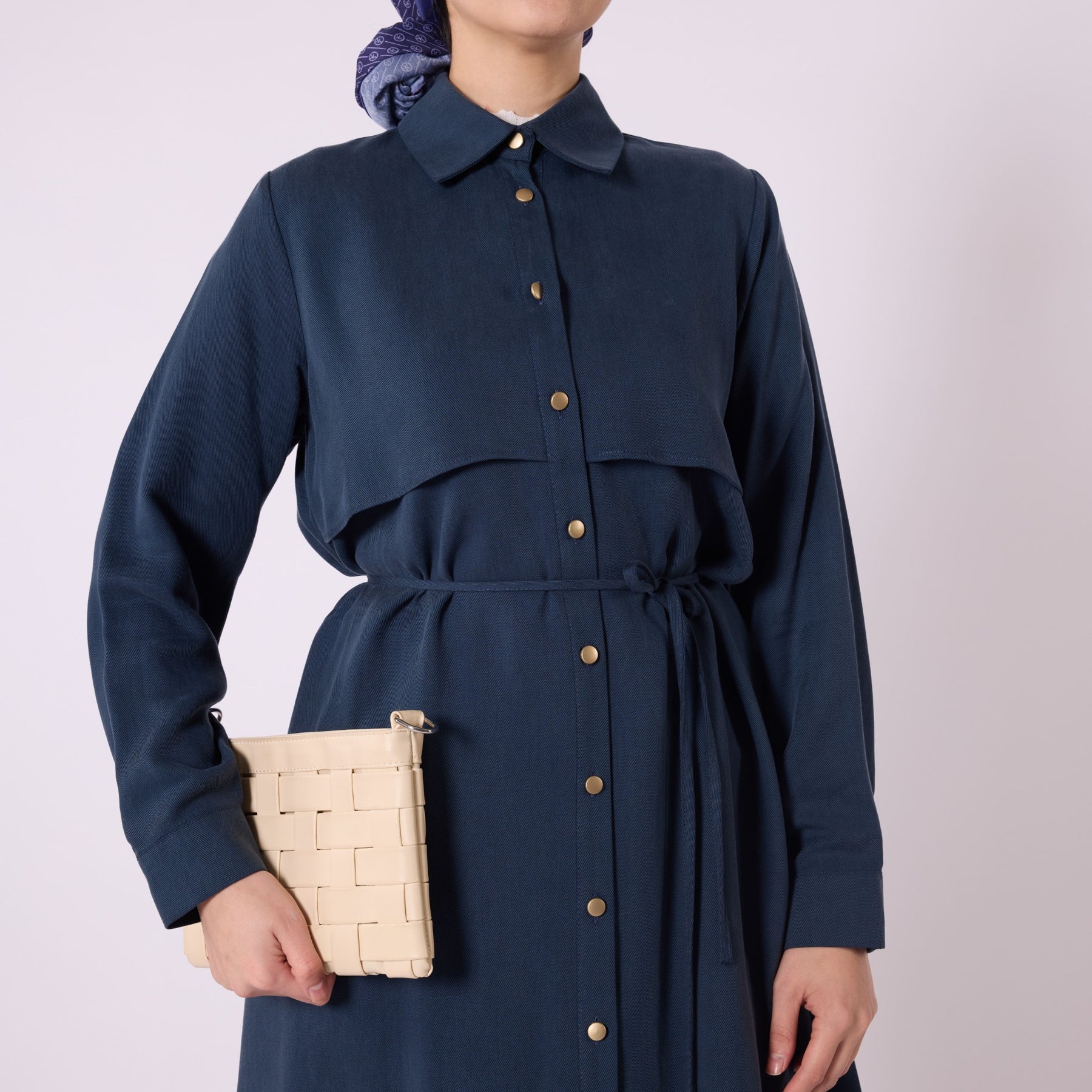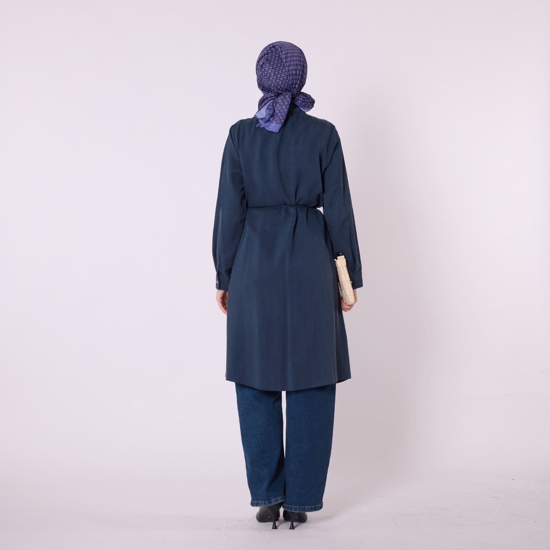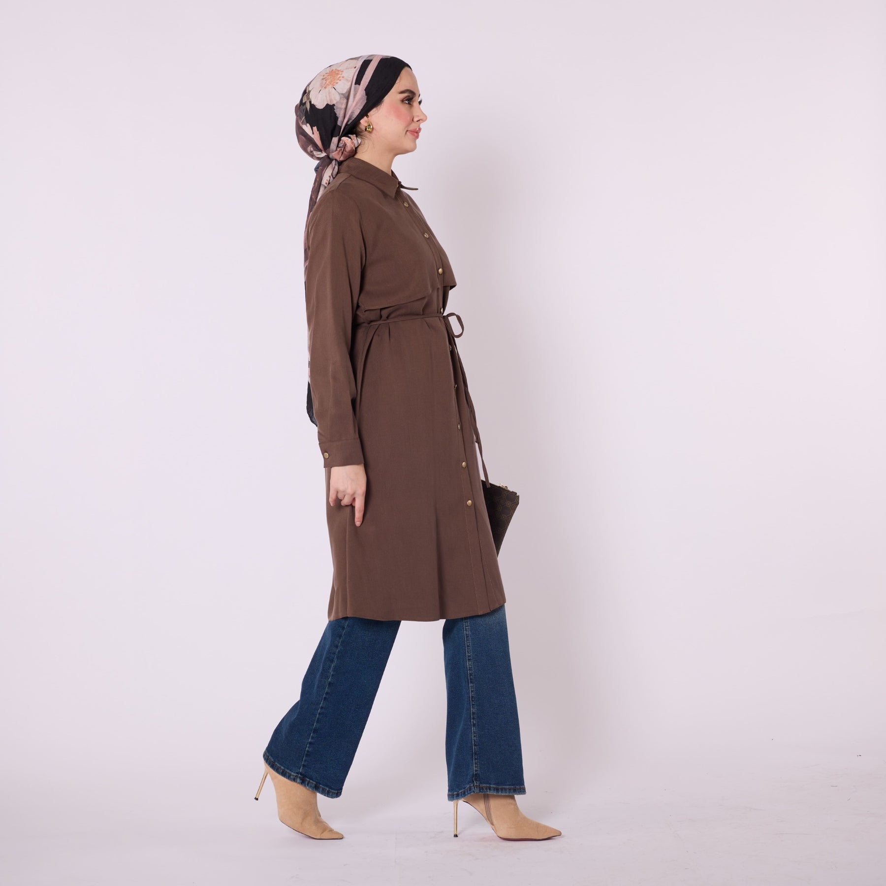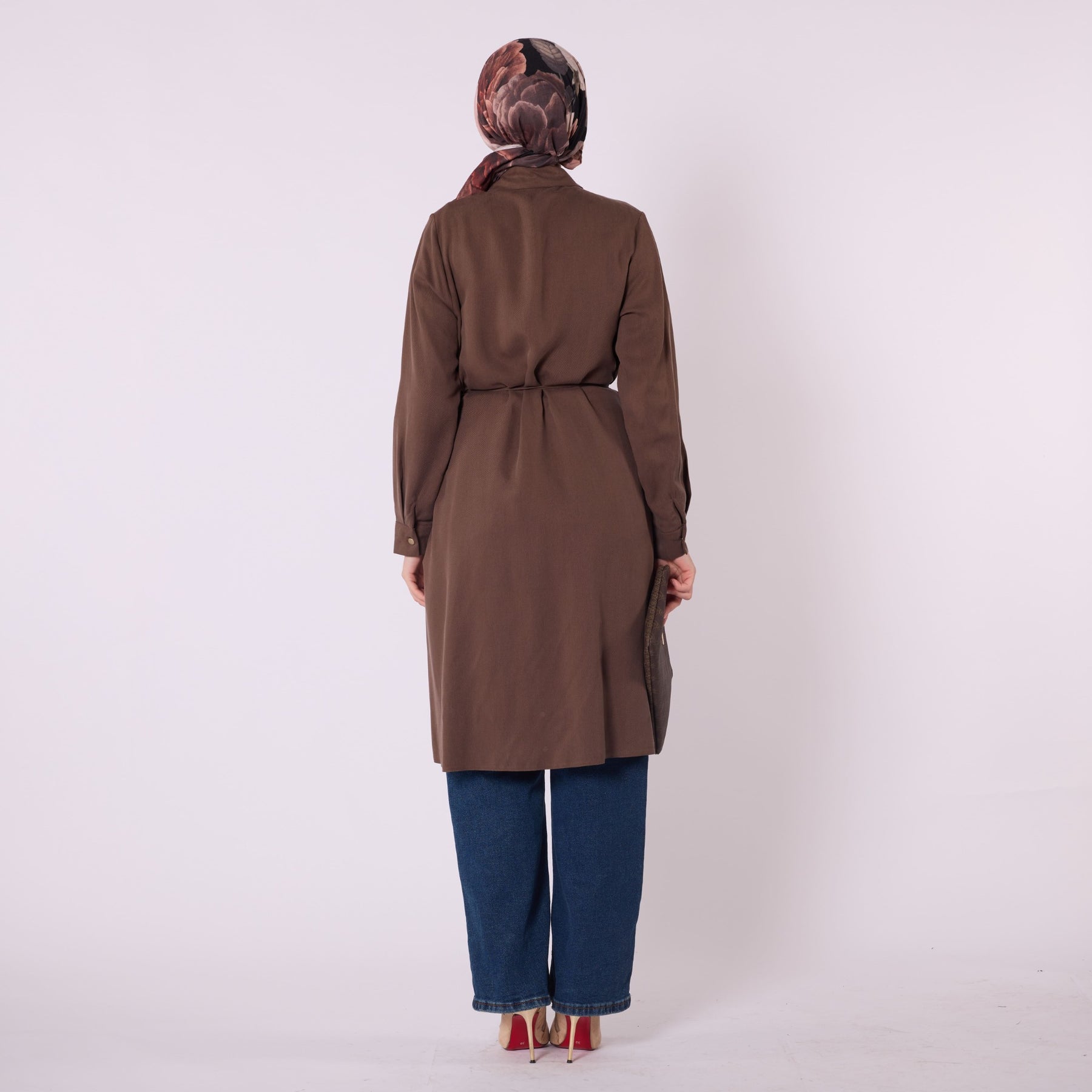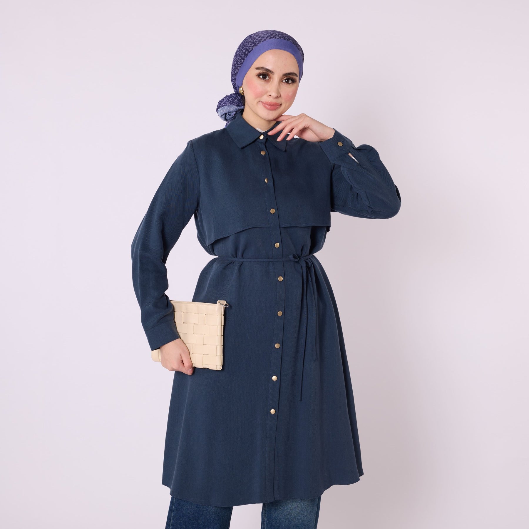 Crafted from 100% polyester, this tunic offers a lightweight and fluid drape, combining elegance with a modern silhouette. The polo collar, front button closure and adjustable waist tie allow versatile styling—wear it fitted for a defined shape or loose for a relaxed flow. The cape-style upper layer adds movement and a refined touch, making the tunic visually striking. Available in brown and navy, it is suitable for daily wear, office outfits or elevated day-to-night looks.