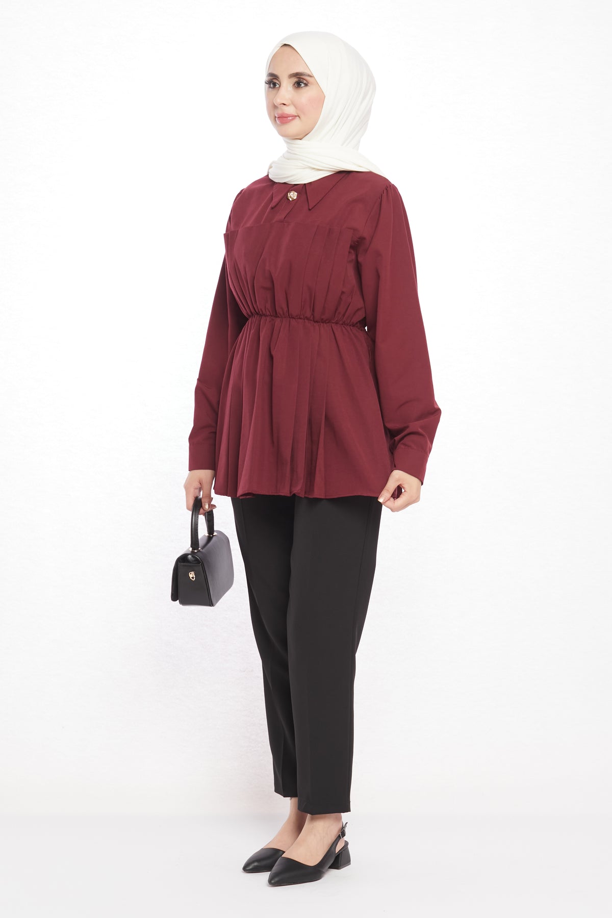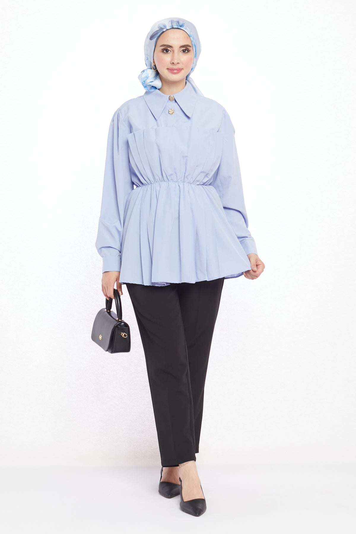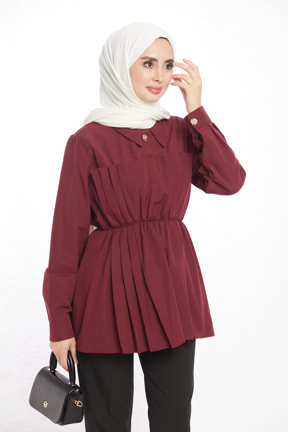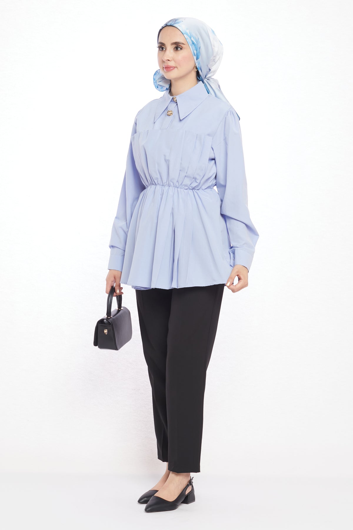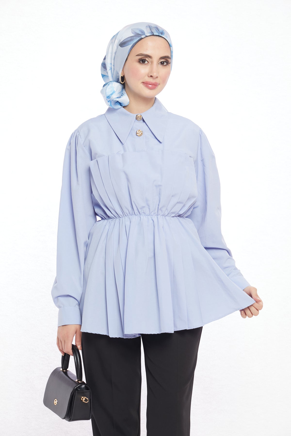 The ruched polo collar summer shirt stands out with its modern design and lightweight fabric, ensuring comfort during warm days. Featuring a half-button closure with two elegant gold buttons at the top, it adds a touch of sophistication. The ruched detailing enhances its dynamic and stylish look.