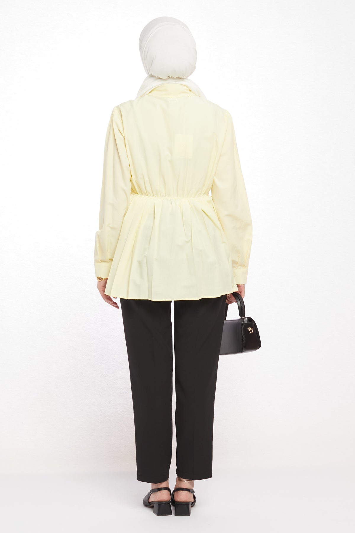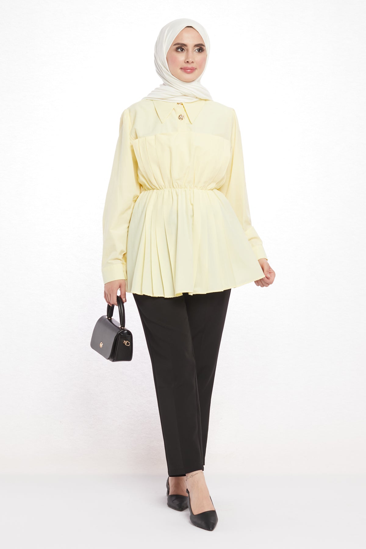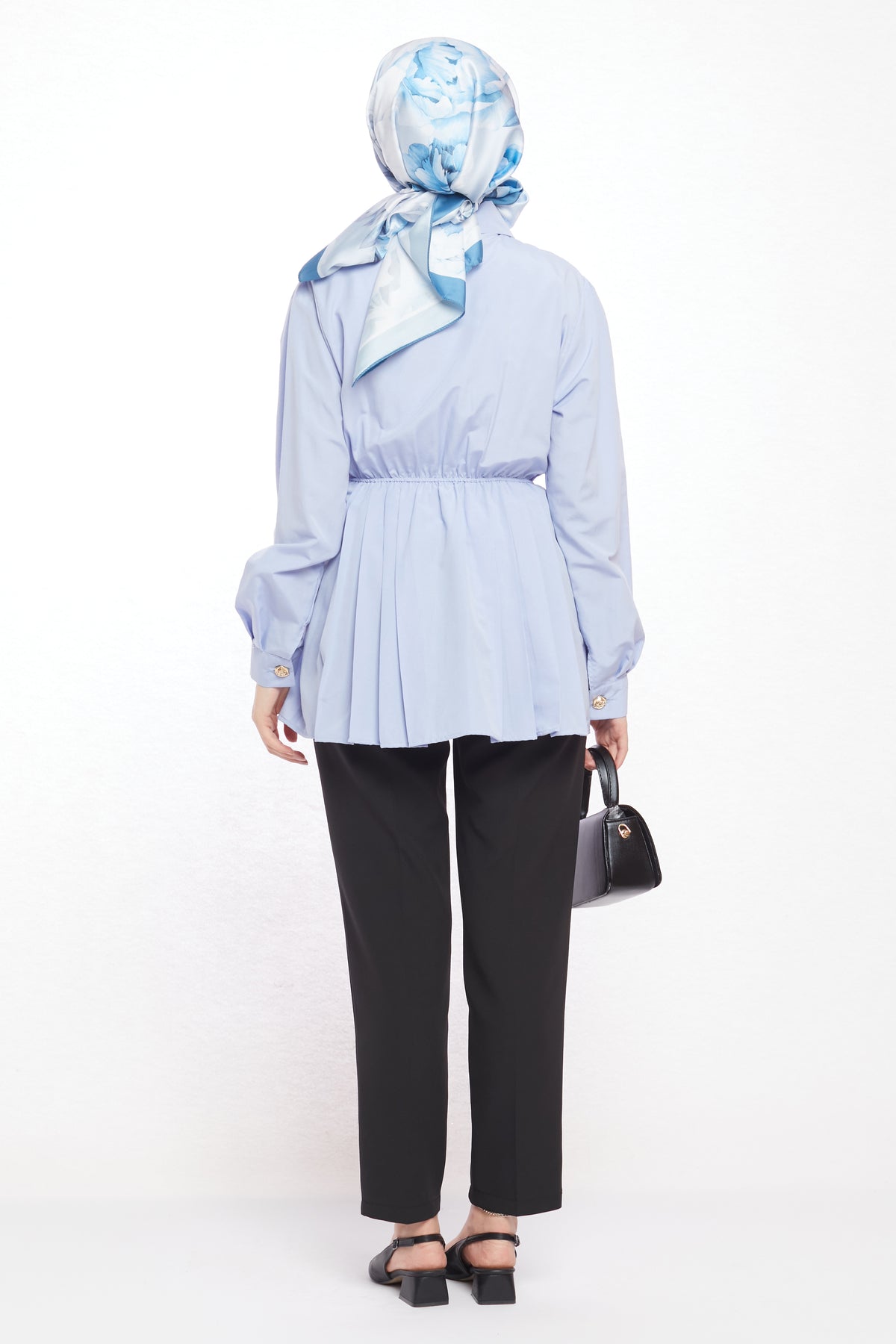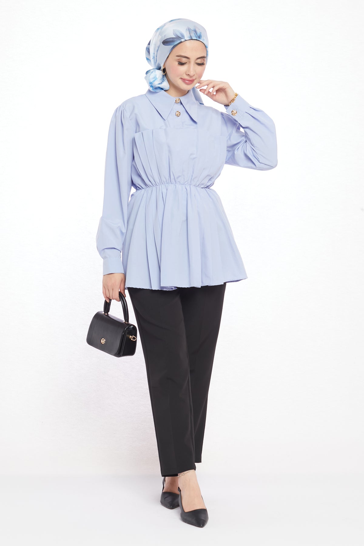 The ruched polo collar summer shirt stands out with its modern design and lightweight fabric, ensuring comfort during warm days. Featuring a half-button closure with two elegant gold buttons at the top, it adds a touch of sophistication. The ruched detailing enhances its dynamic and stylish look.