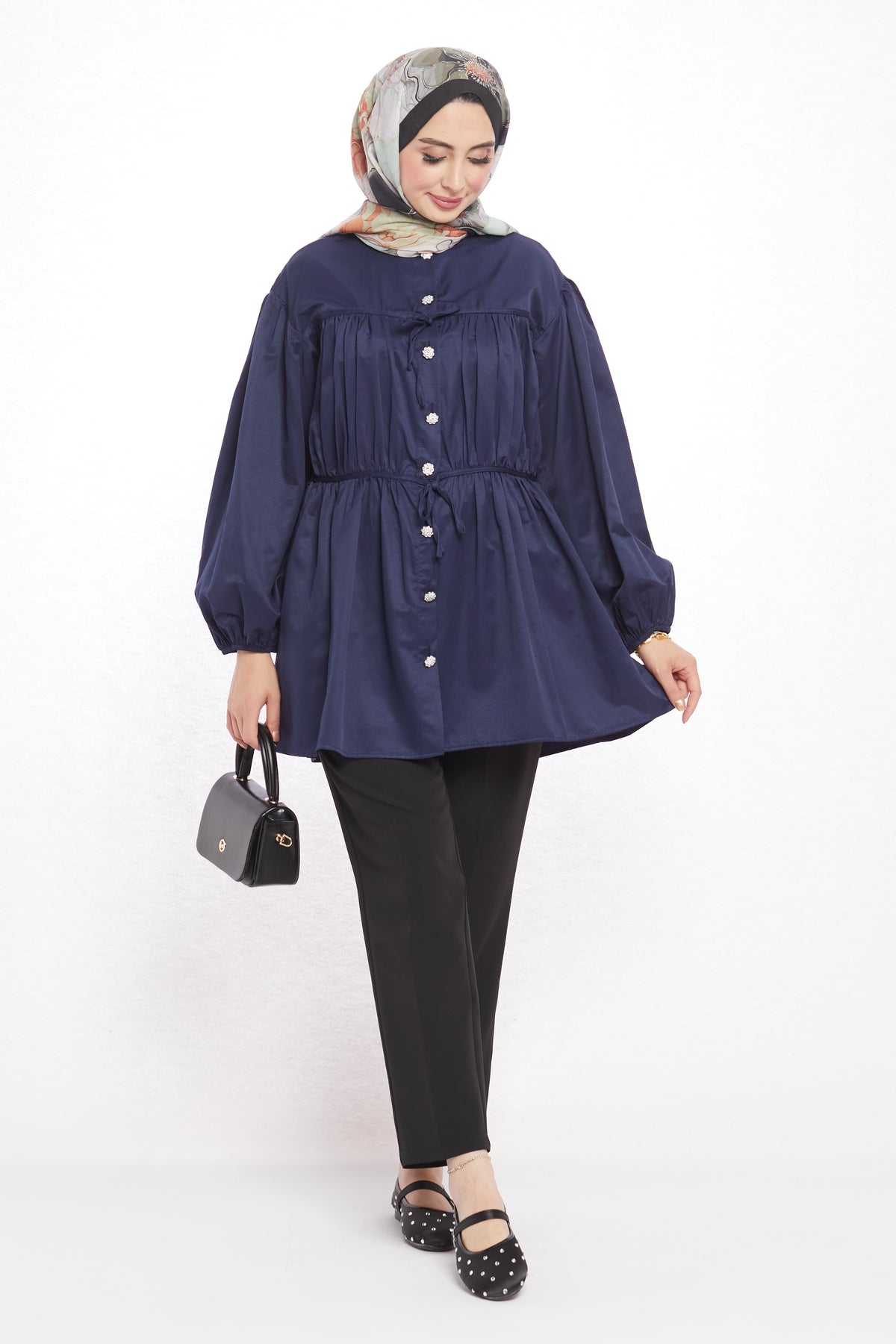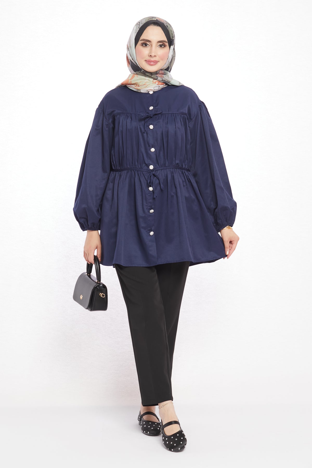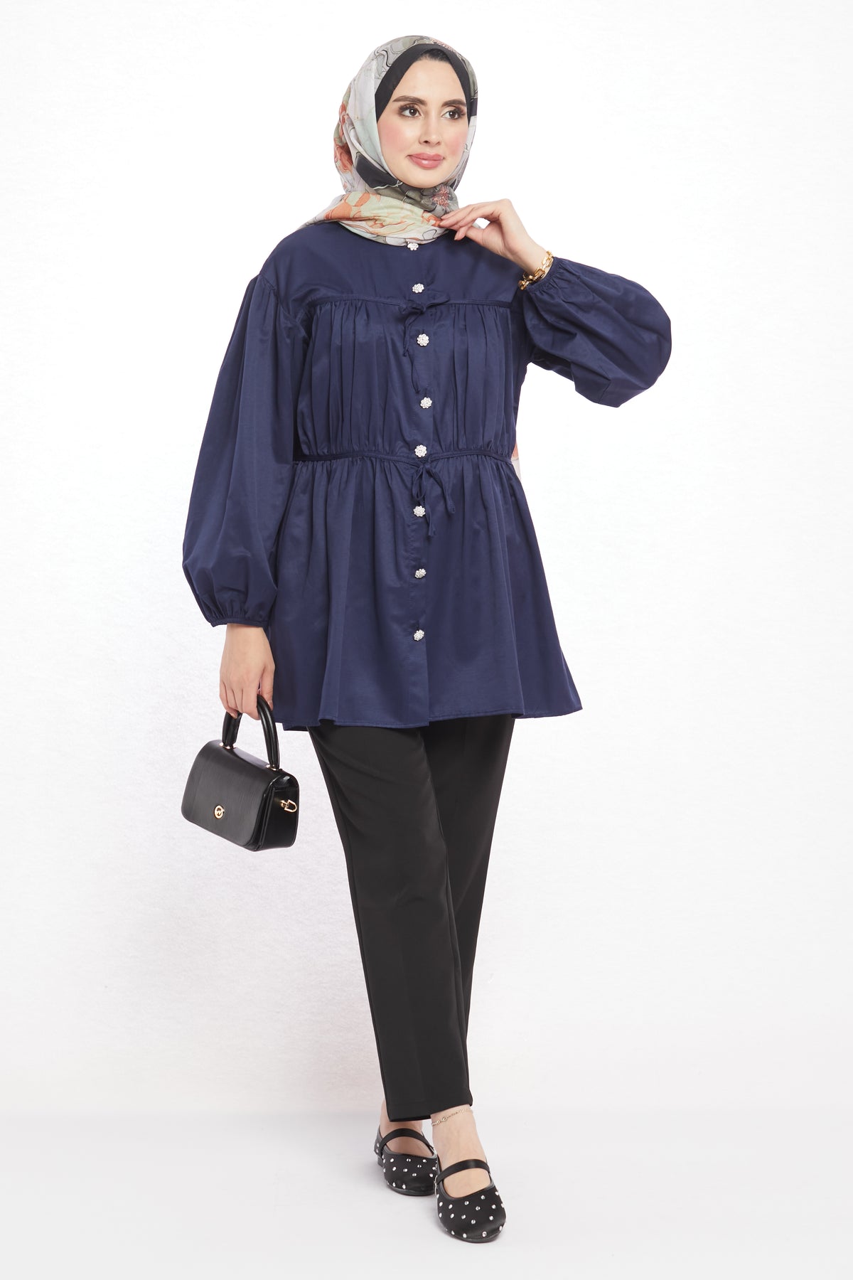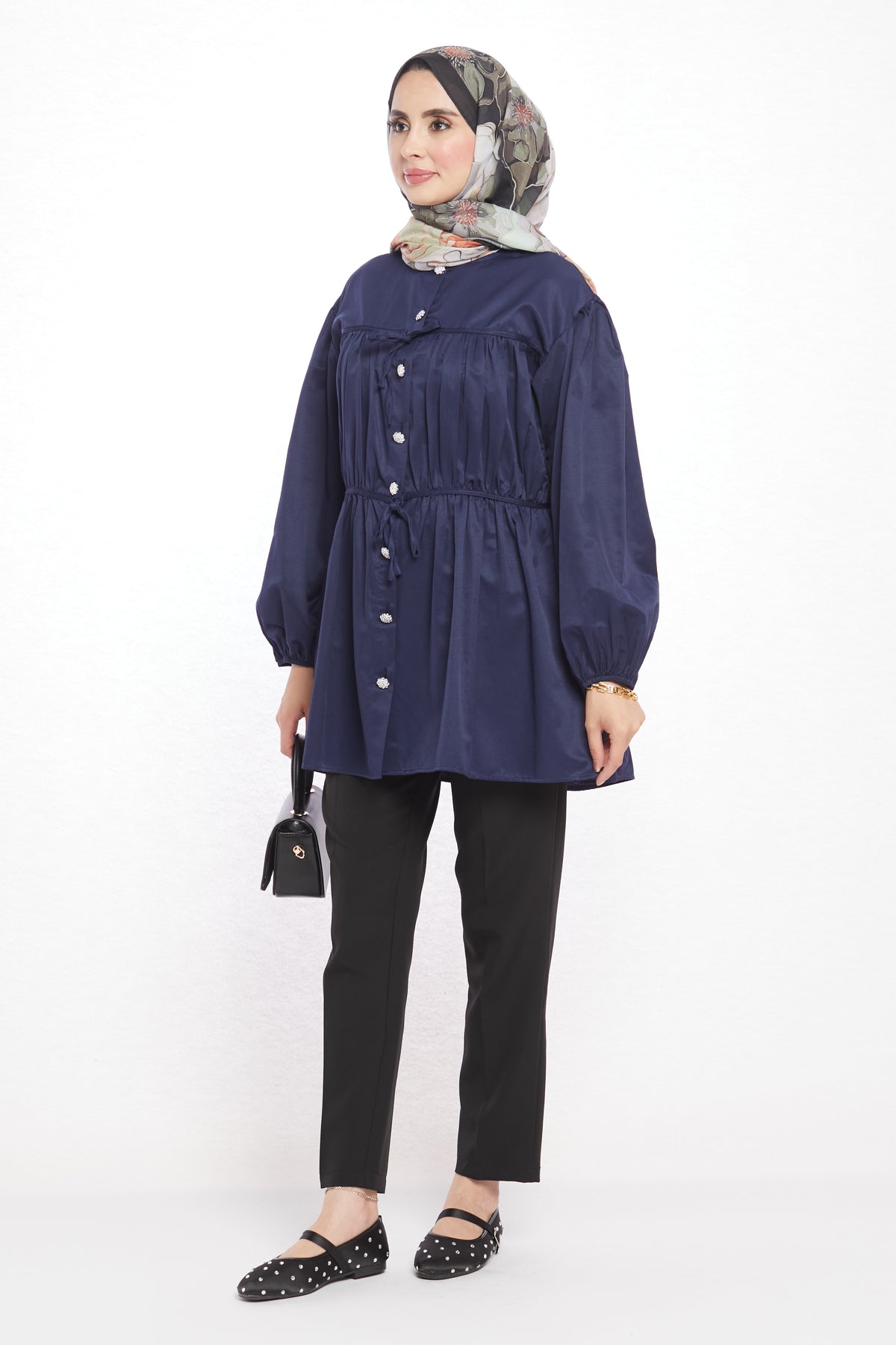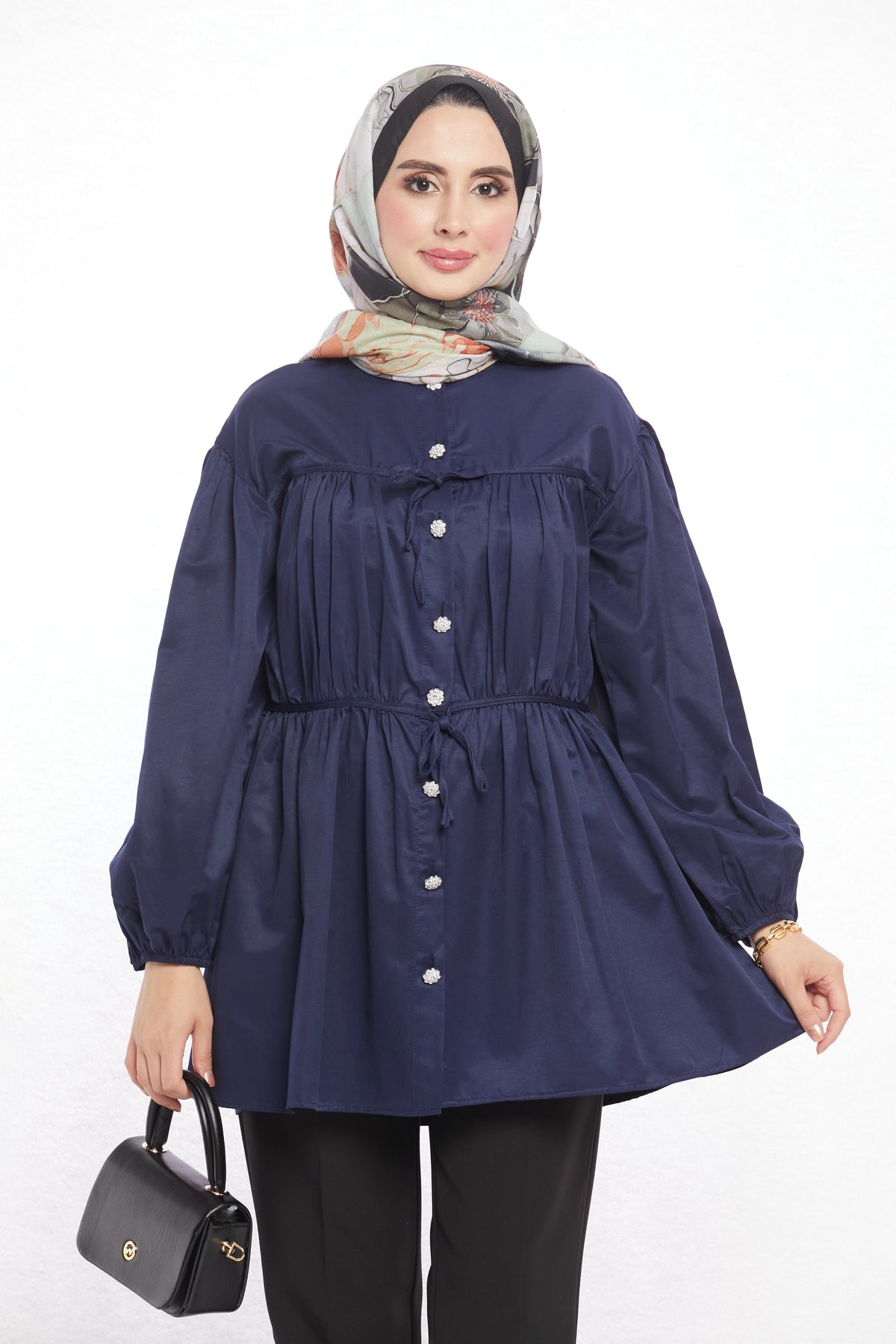 The ruched summer shirt with stone buttons combines everyday elegance with chic detailing. Featuring sparkling stone-embellished buttons on the front, it adds a touch of shine, while the two drawstring ties on the front create a feminine and stylish look. The ruched details complete the design, offering a flattering and graceful silhouette.