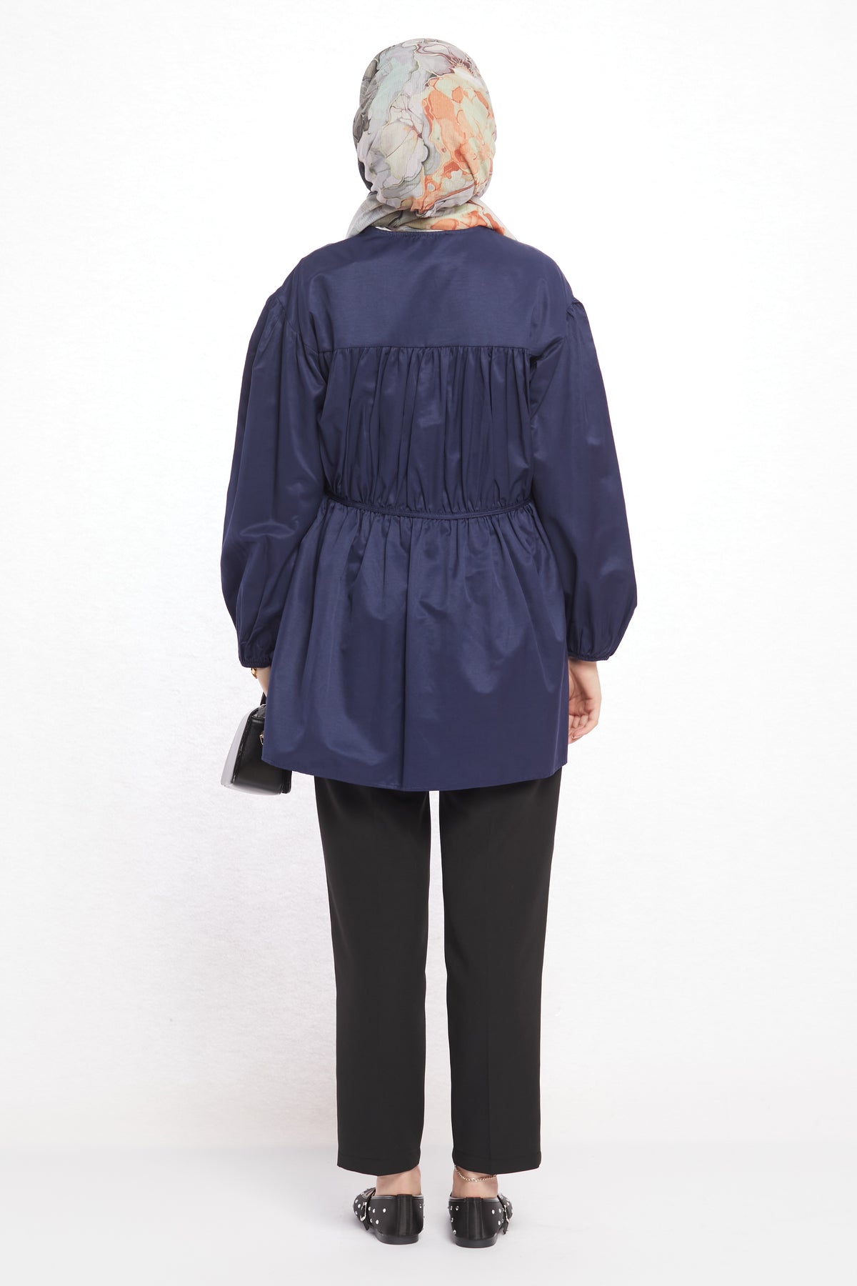 Details: Sparkling stone buttons, 2 front drawstrings, ruched details
