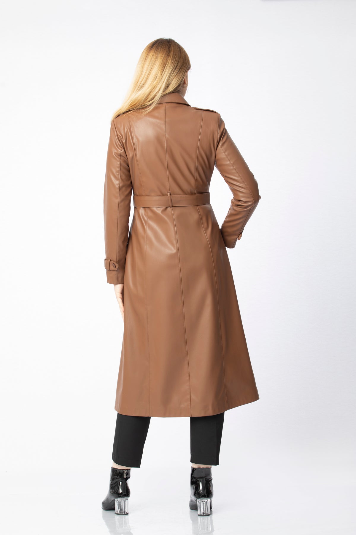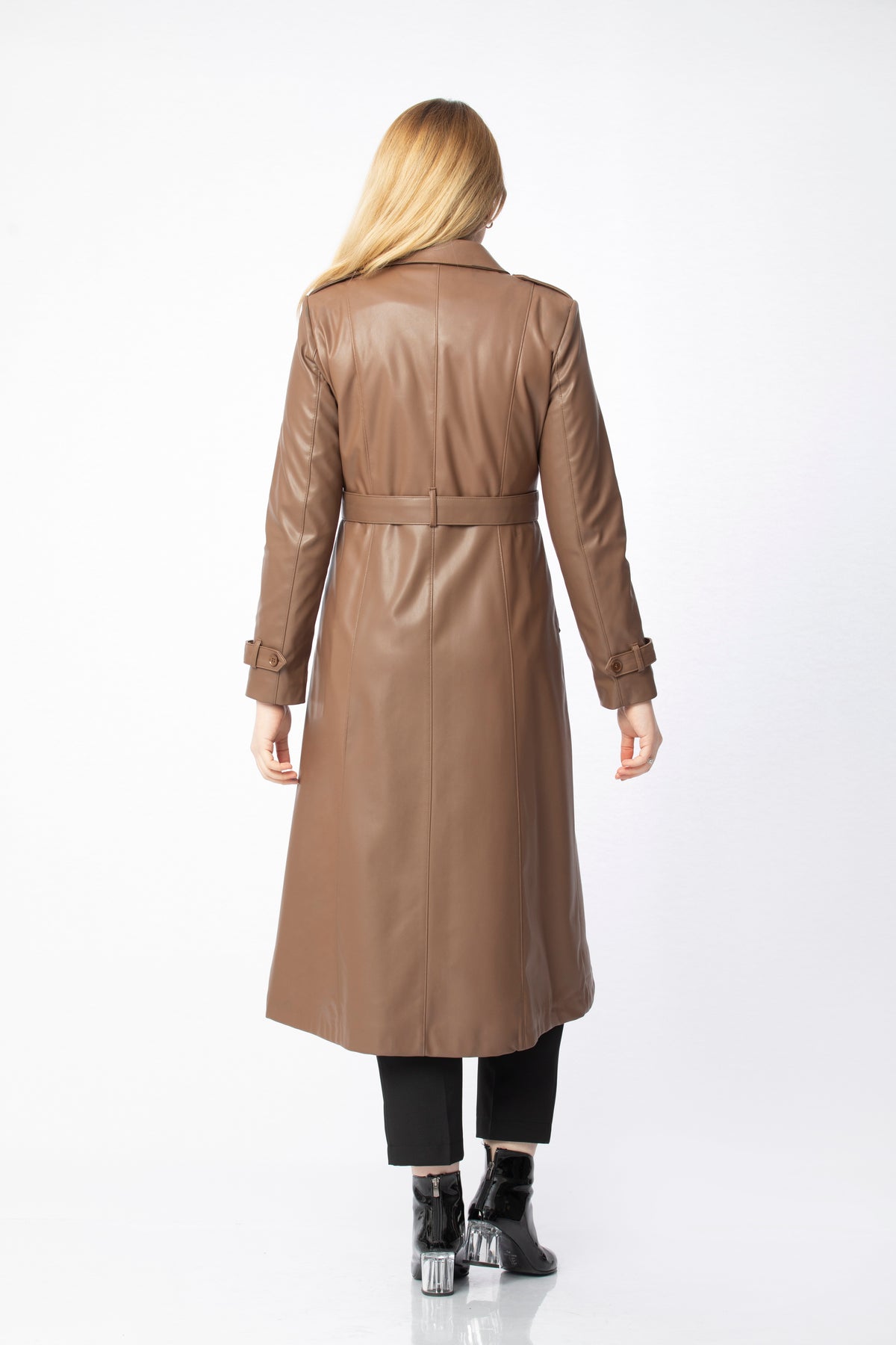 The Epaulette and Belt Detail Faux Leather Coat is a statement outerwear piece designed for those who appreciate a bold yet refined look. Made from faux leather, it offers a structured appearance and a polished finish while remaining durable and comfortable to wear. Epaulettes on the shoulders give the coat a confident and defined silhouette, while the belt at the waist gently shapes the body and allows you to adjust the fit as you wish. The belt is crafted from the same fabric to create a clean, harmonious look. On the front, six asymmetrically placed buttons bring a modern twist to the classic buttoned coat design. Two front pockets add practicality without disturbing the sleek overall line.