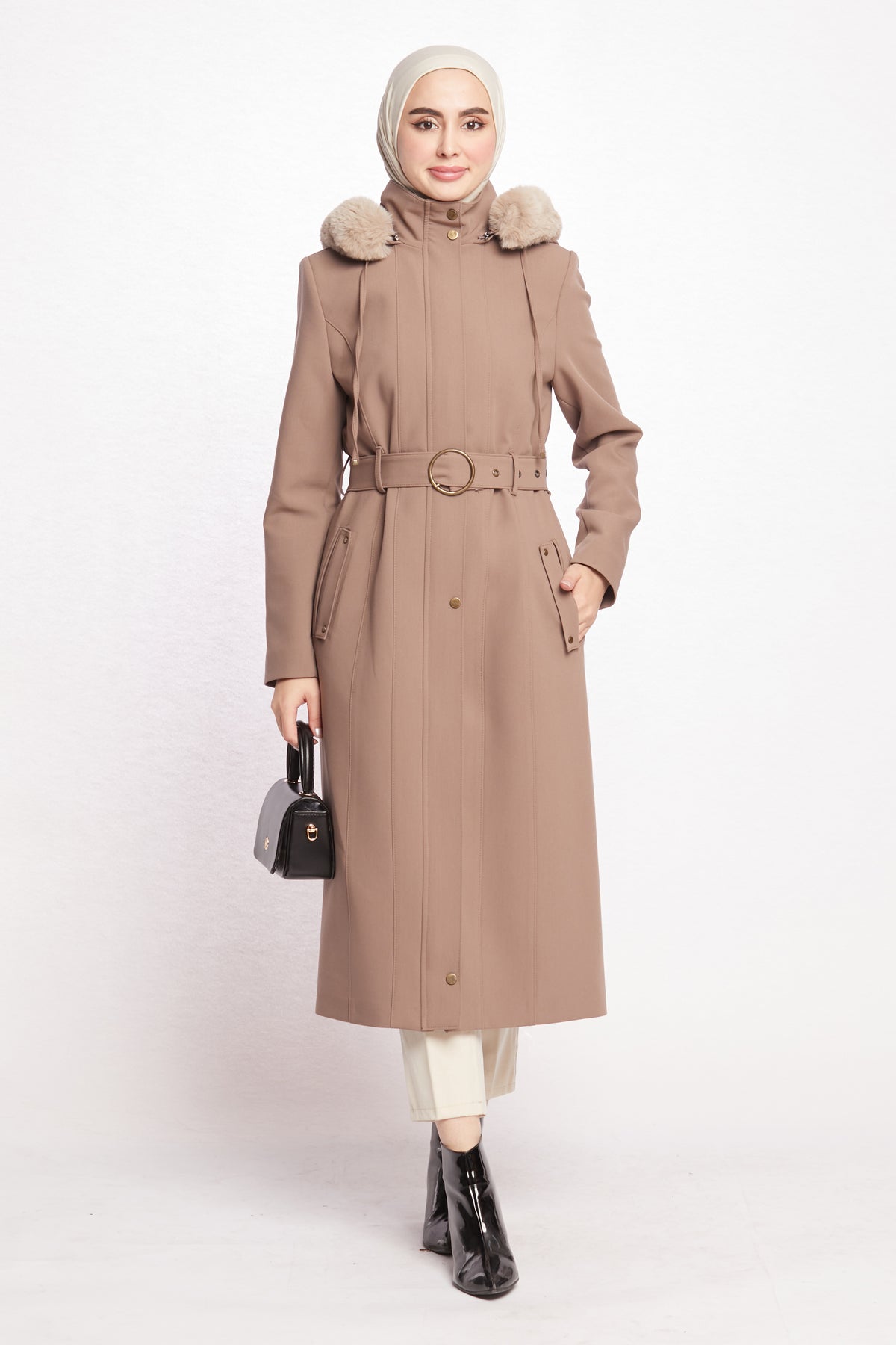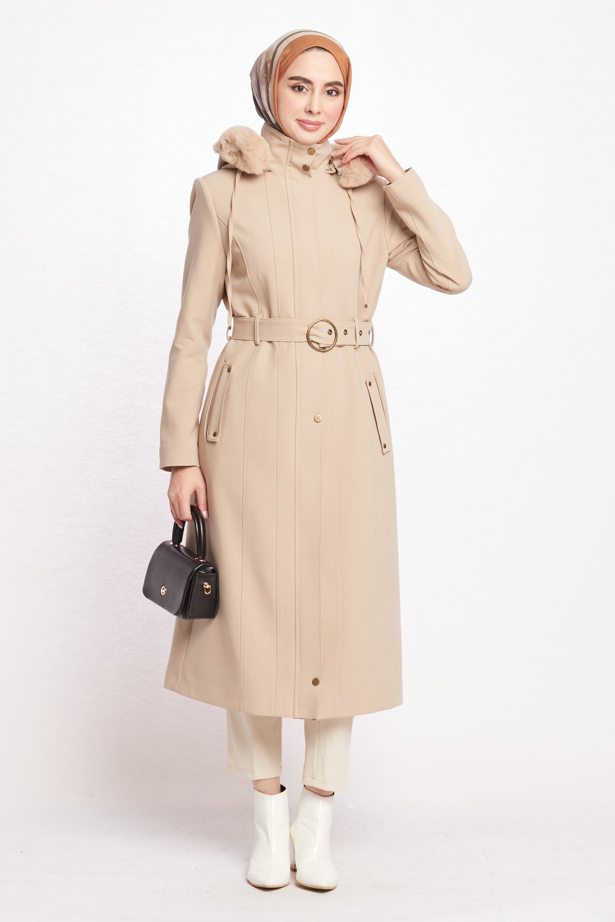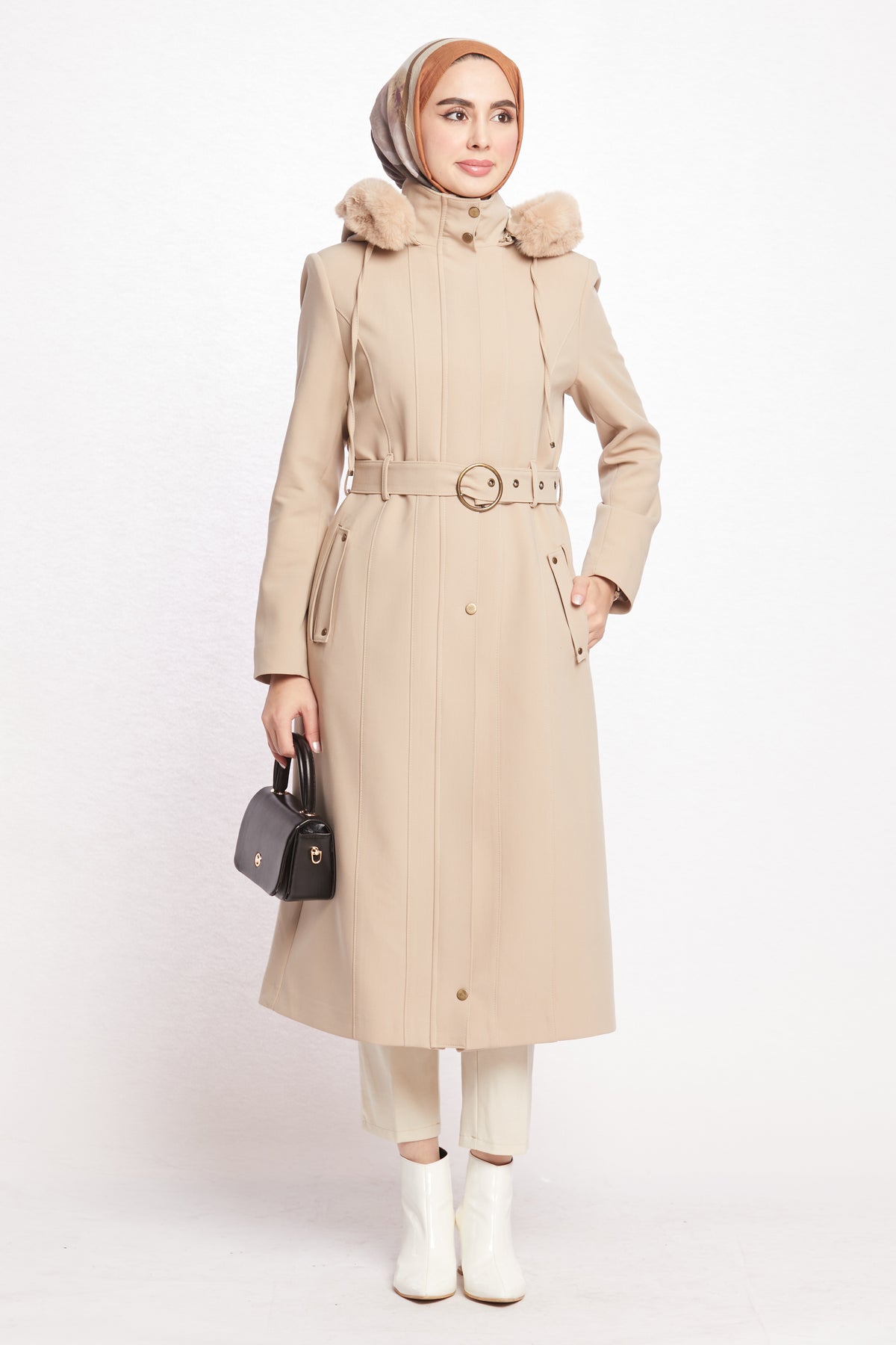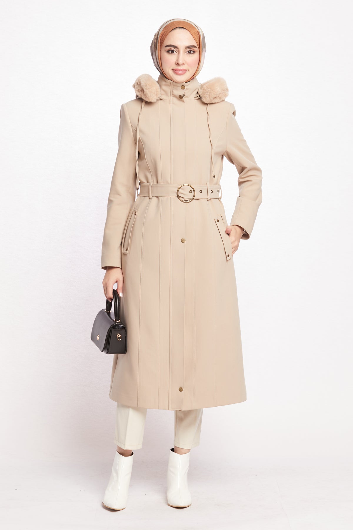Reflecting the Arabopy sporty-chic style, this coat works perfectly with casual city outfits as well as more dressed-up winter looks. Available in beige, camel, dusty rose, black, stone and grey, it pairs easily with jeans, knit dresses, tailored trousers and boots. The relaxed yet classic fit makes it ideal for layering over chunky sweaters without feeling too tight or bulky. Whether you’re heading to work, running everyday errands or enjoying a weekend in the city, the Hooded Coat with Fur Trim is a practical, modern and stylish outerwear option that keeps you warm in cold weather while completing your winter wardrobe.