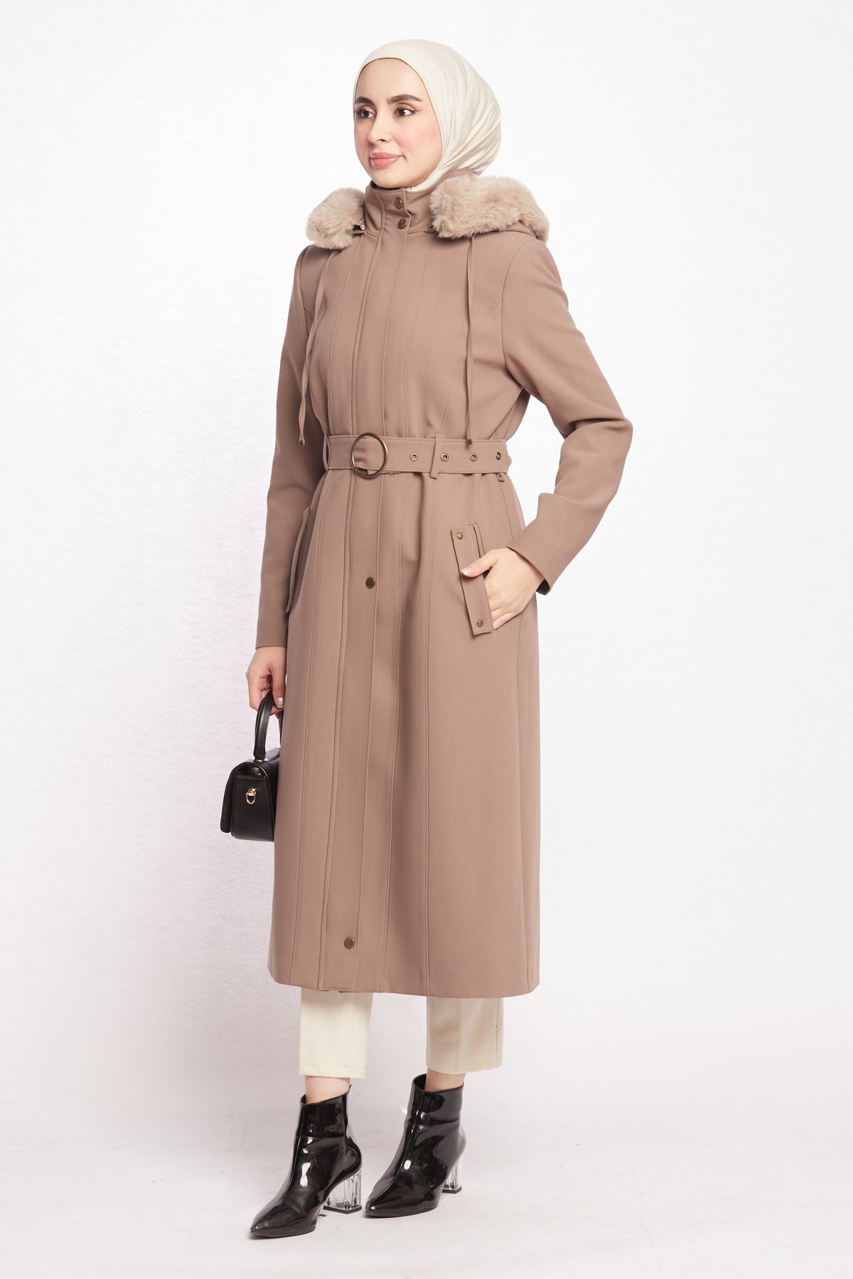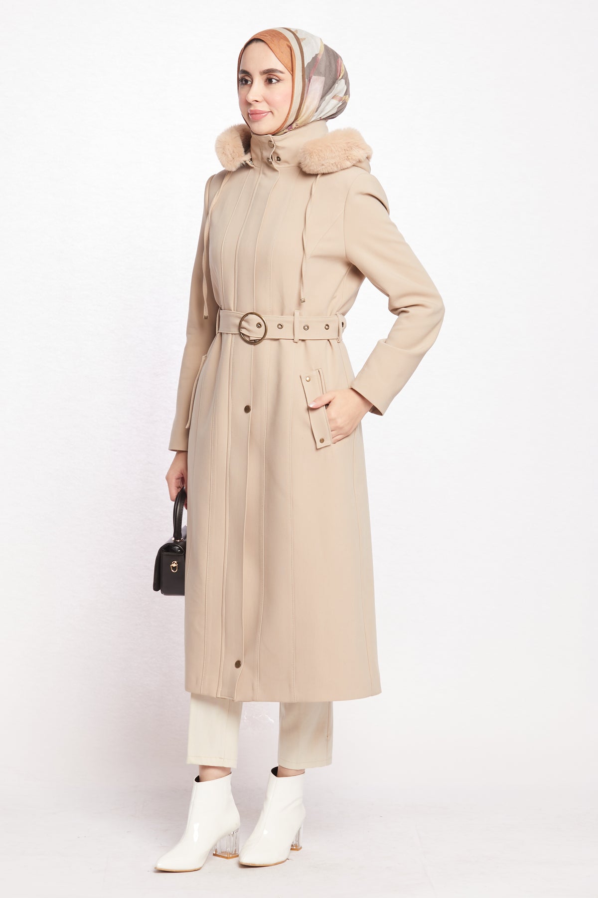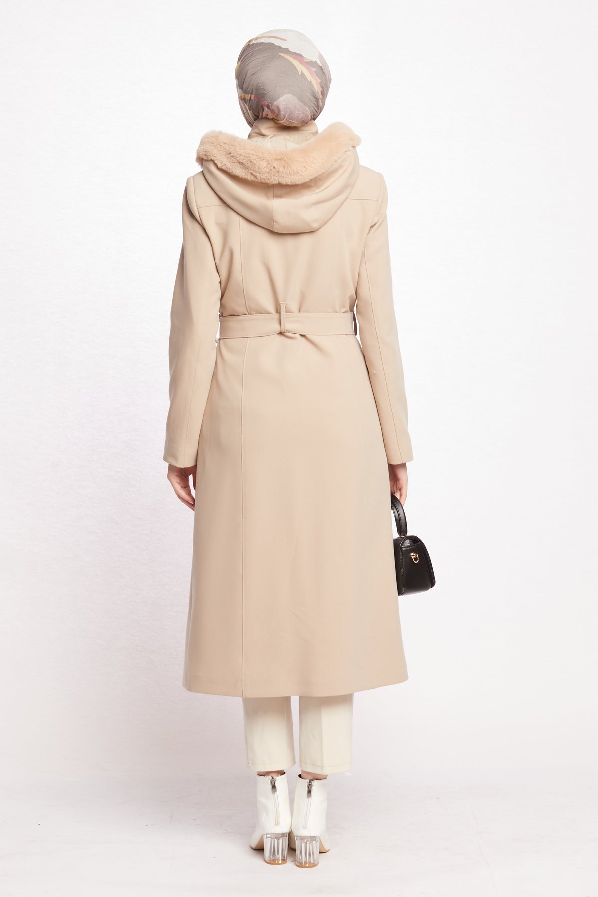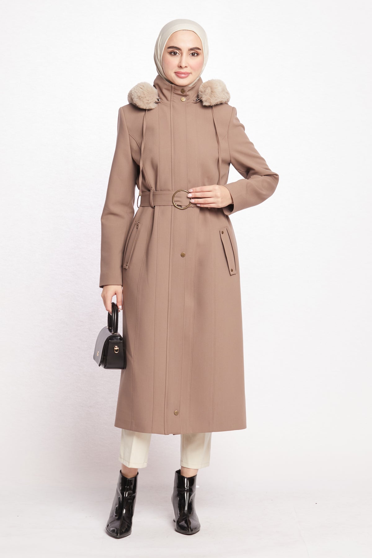 Reflecting the Arabopy sporty-chic style, this coat works perfectly with casual city outfits as well as more dressed-up winter looks. Available in beige, camel, dusty rose, black, stone and grey, it pairs easily with jeans, knit dresses, tailored trousers and boots. The relaxed yet classic fit makes it ideal for layering over chunky sweaters without feeling too tight or bulky. Whether you’re heading to work, running everyday errands or enjoying a weekend in the city, the Hooded Coat with Fur Trim is a practical, modern and stylish outerwear option that keeps you warm in cold weather while completing your winter wardrobe.
