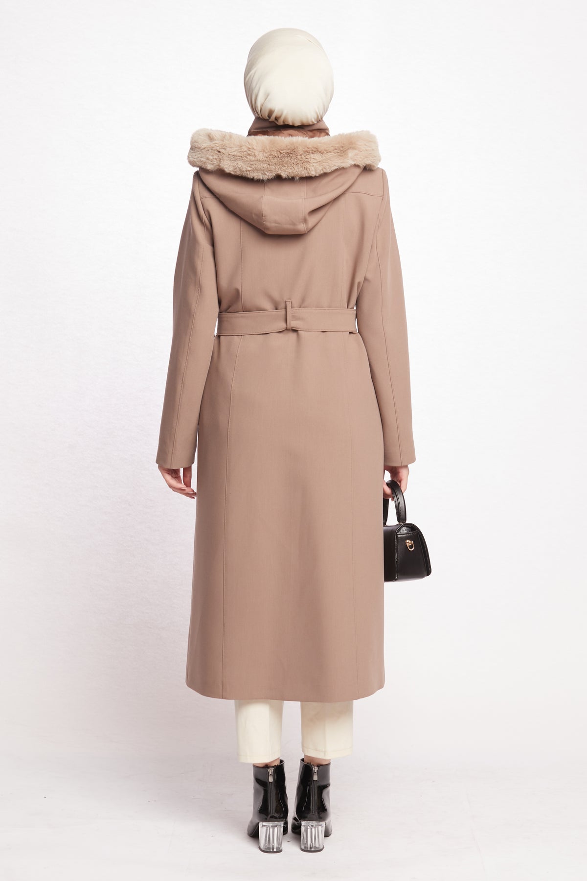 • Model: Long belted hooded coat with fur trim