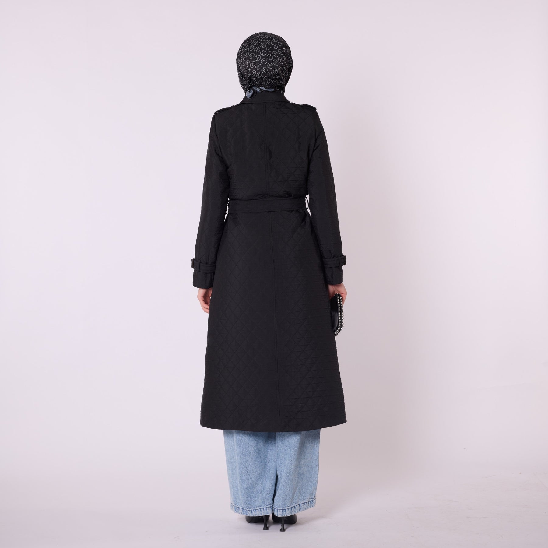 This quilted double-breasted coat combines warmth, durability and modern elegance, making it a standout winter essential. Crafted from 100% polyester, it provides reliable insulation against cold weather while maintaining a lightweight wear. The metallic-buckled belt enhances the waistline for a refined silhouette, and the polo collar adds a timeless touch. Its 120 cm length and full lining offer added comfort throughout the season. Featuring two practical front pockets, the coat pairs effortlessly with both casual and sophisticated winter outfits. Available in cream, brown, black and stone tones.