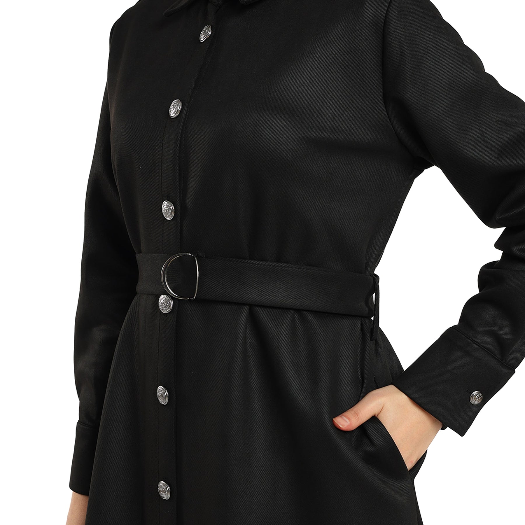 Details: Epaulettes on shoulders, engraved metal buttons, self-fabric belt