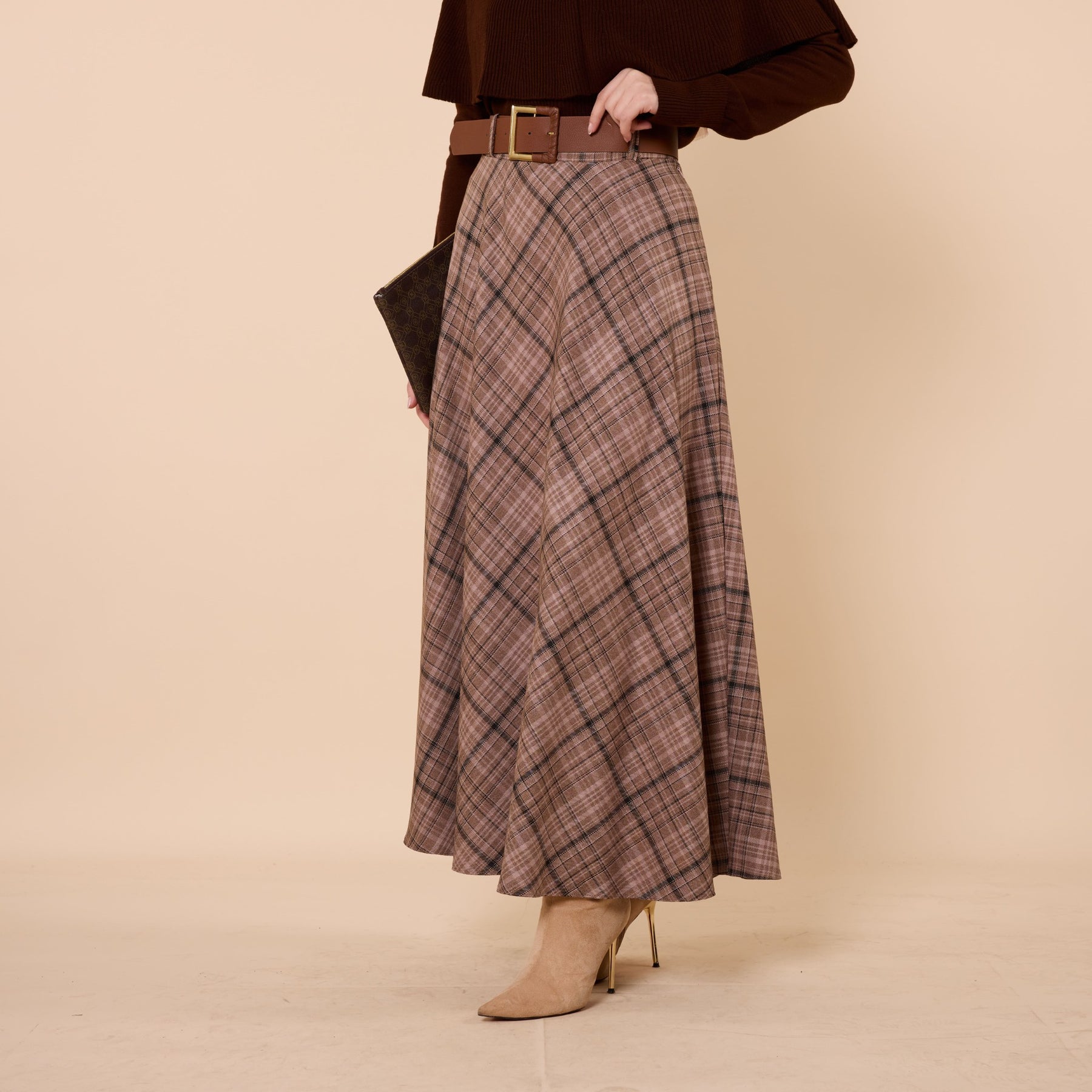 With its timeless brown plaid design, this skirt is suitable for both casual city wear and office-inspired outfits. When styled with simple tops, the pattern stands out beautifully, creating a balanced and effortless look.