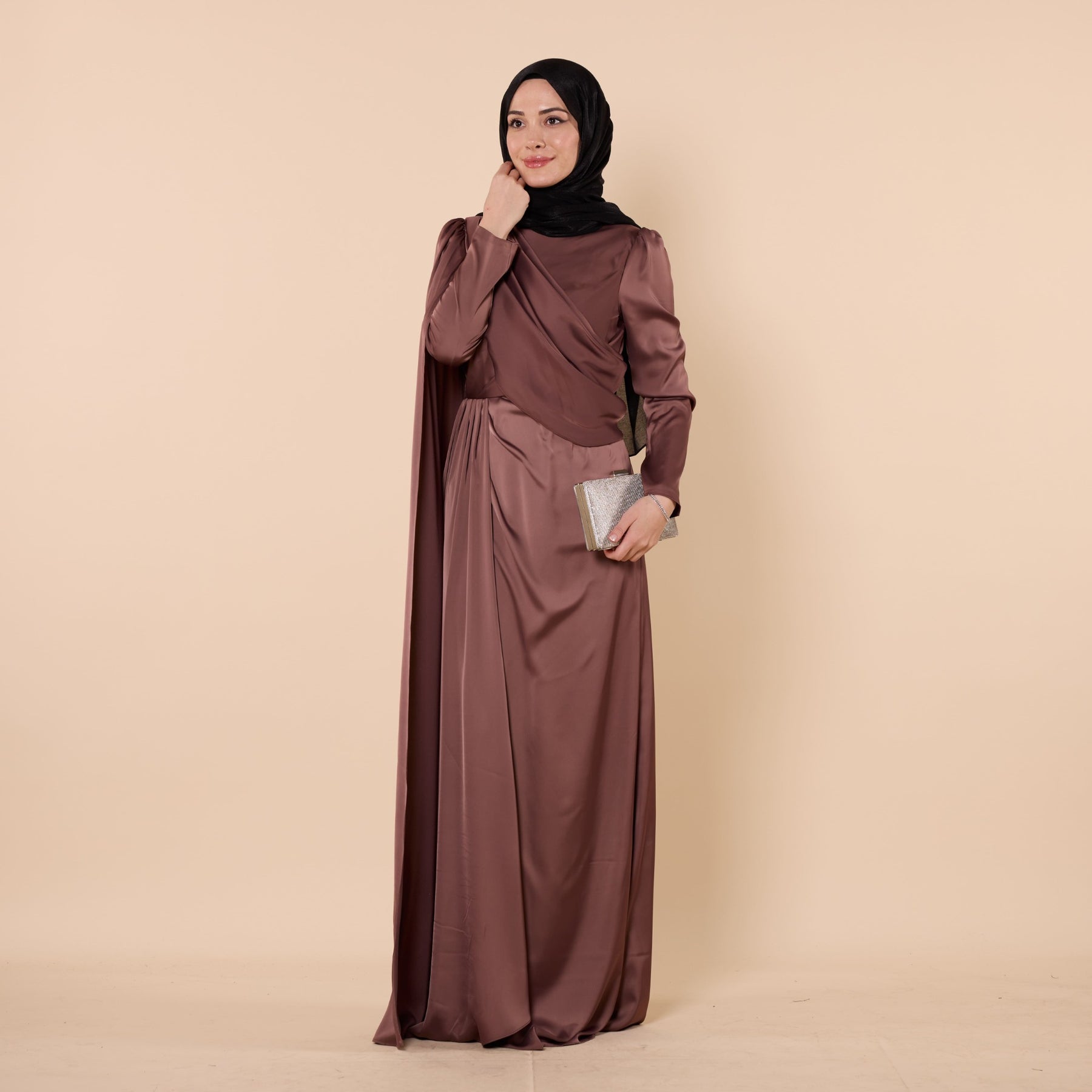 Featuring elegant cape sleeves and a cross belt design, this evening dress delivers a refined and striking look for special occasions. Its fluid silhouette drapes smoothly over the body, while the fully lined construction ensures comfortable and confident wear. The cape-style sleeves add movement and volume, creating a modern profile, and the cross belt detail defines the waist for a balanced, flattering fit.