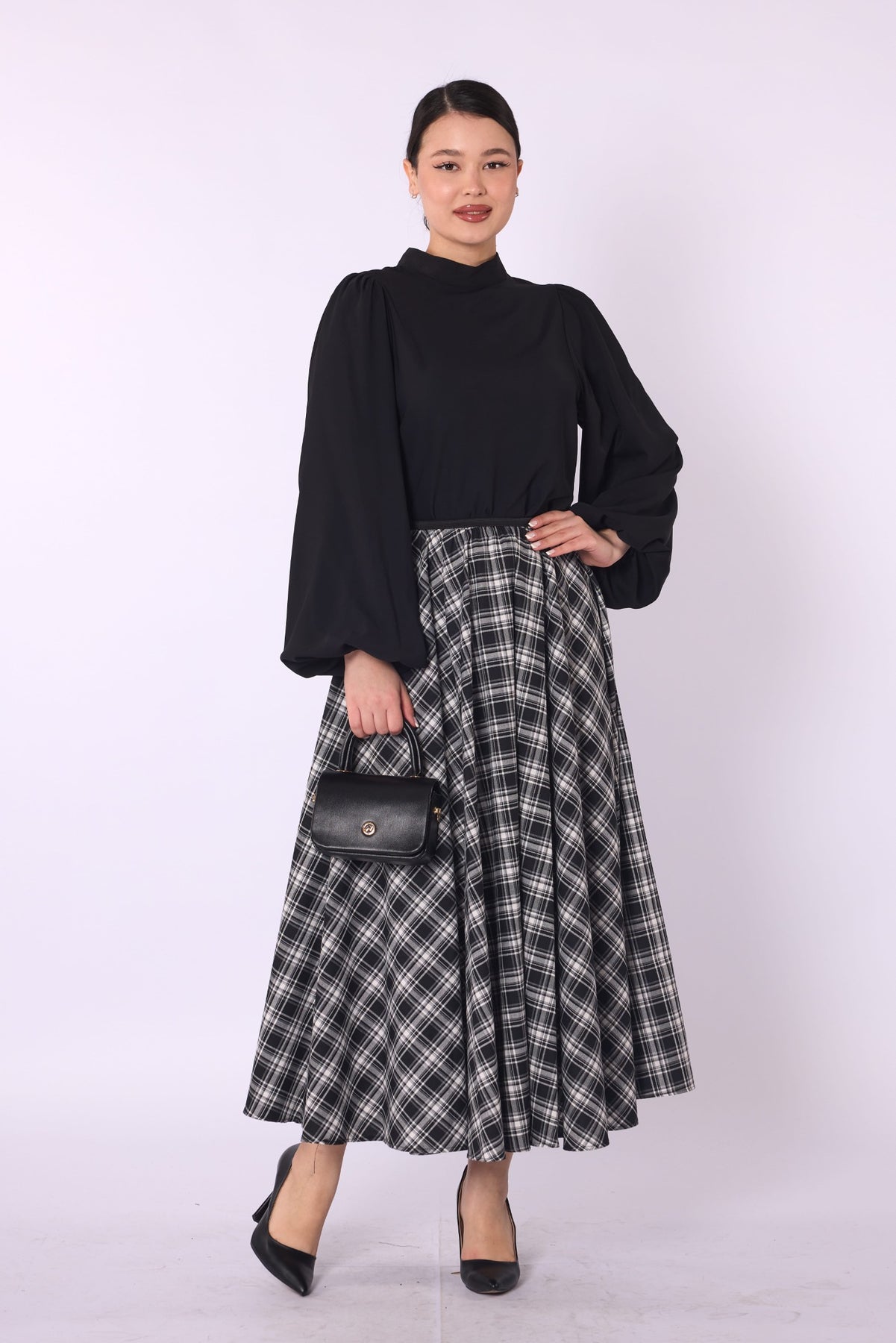 Model: Plaid A-line skirt with elastic waist