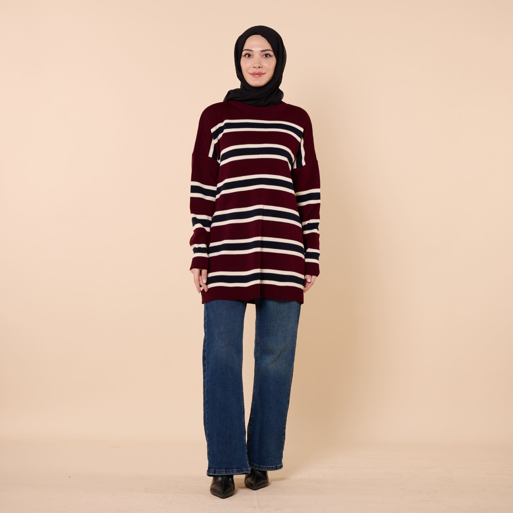 This long knit tunic stands out with its timeless striped pattern, offering a clean yet confident look ideal for everyday styling. The classic crew neckline provides a comfortable and modern feel, while the elongated silhouette drapes smoothly without clinging to the body. Its knit structure delivers warmth in cooler weather while maintaining all-day comfort.
