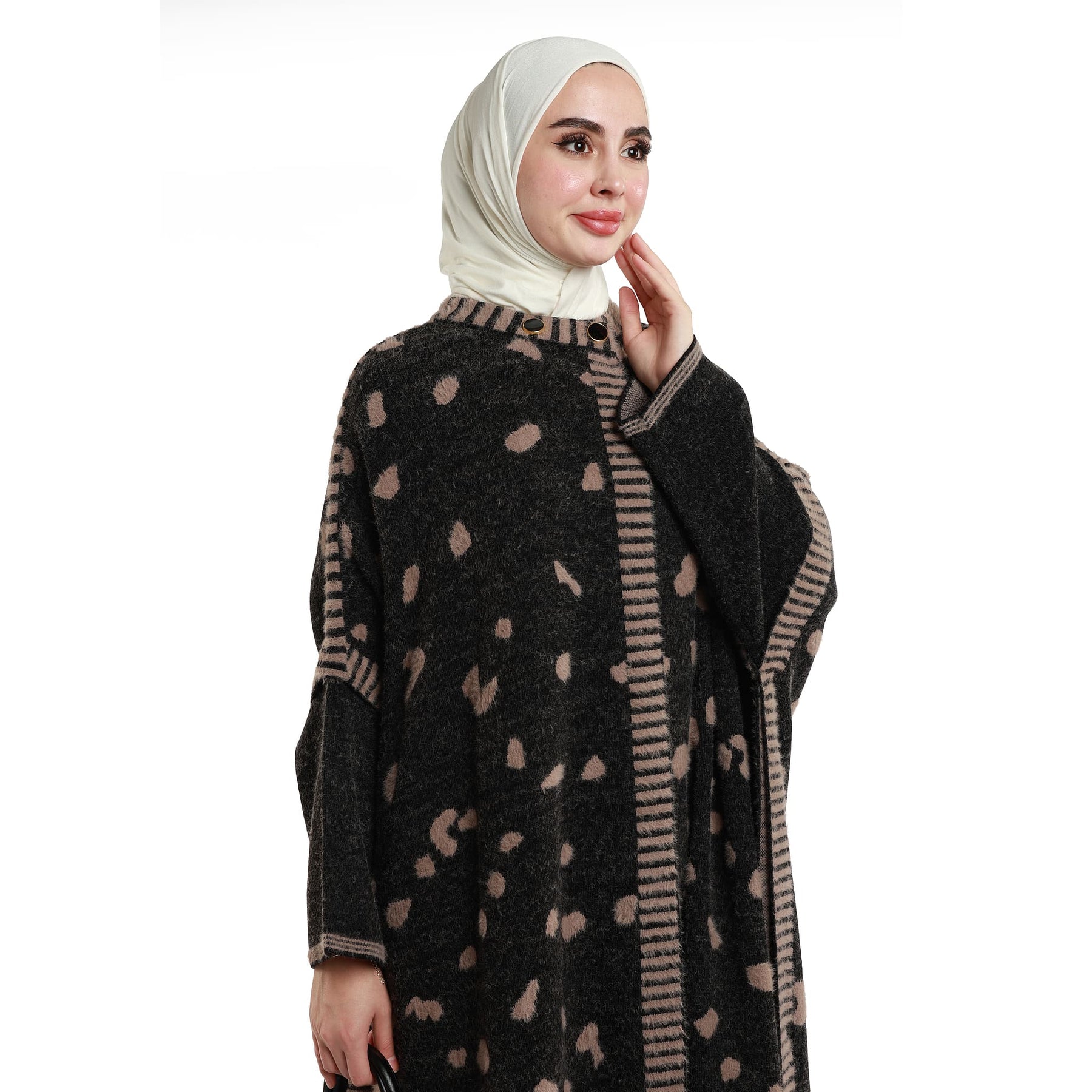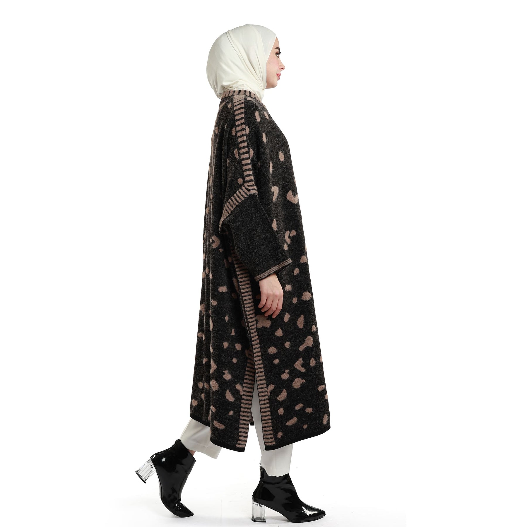 The mosaic pattern oversized long knit cardigan blends cosy warmth with a refined, modern look. Its wool-like textured fabric feels soft and insulating, while the relaxed, drapey cut falls loosely without clinging—perfect for effortless layering over dresses, knits or trousers. The elongated length adds polish and versatility, working seamlessly from workdays to weekend plans. Worn open, it delivers a clean, minimal line; add a slim belt to define the waist when you want a different silhouette. Offered in black-on-black and black-with-mink, the palette integrates easily into neutral wardrobes, creating understated yet eye-catching outfits. A reliable piece for transitional weather and colder days, it provides comfort, warmth and an instantly elevated finish.