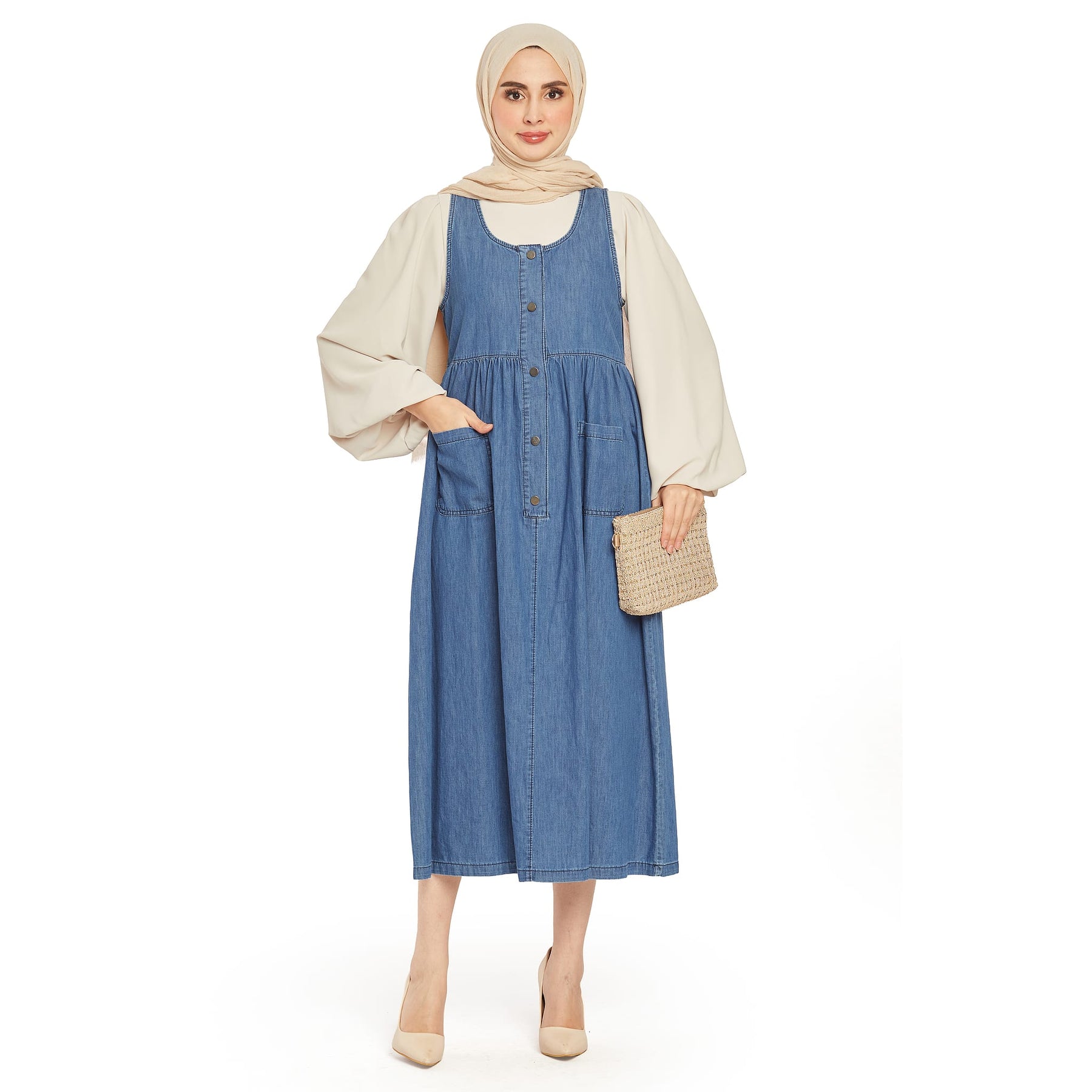 Designed for everyday wear, the pleated pocket detailed denim dress features a comfortable fit and stylish design. Made from 100% cotton, it is lightweight and breathable, ensuring all-day comfort. The two front pockets add practicality and style.