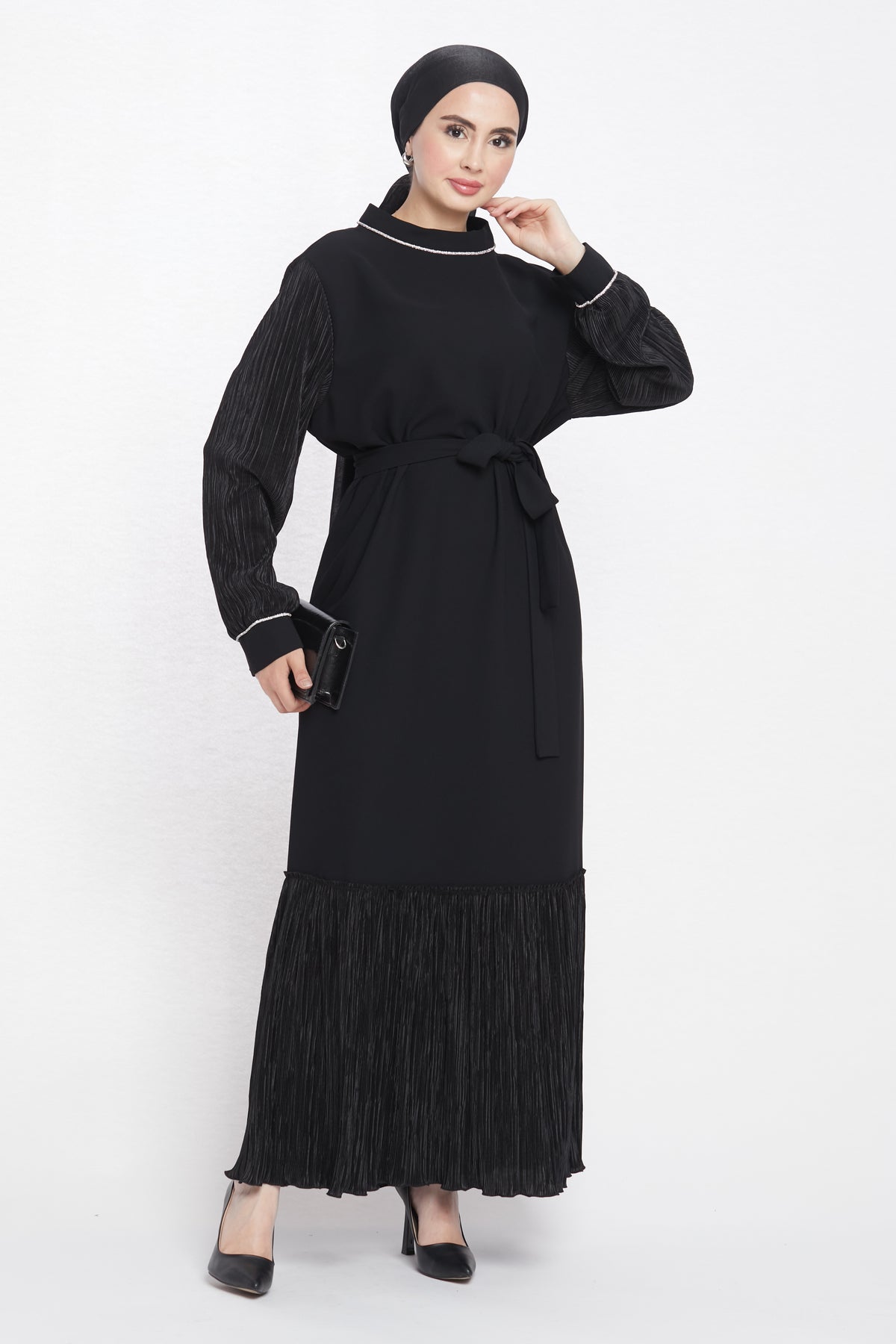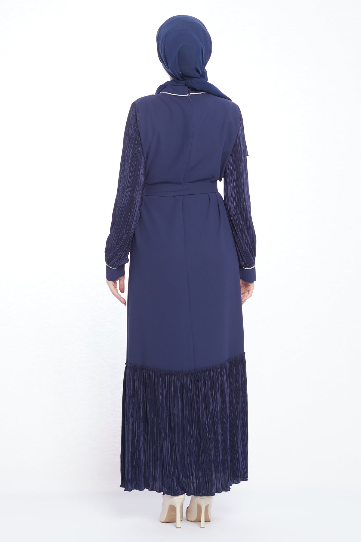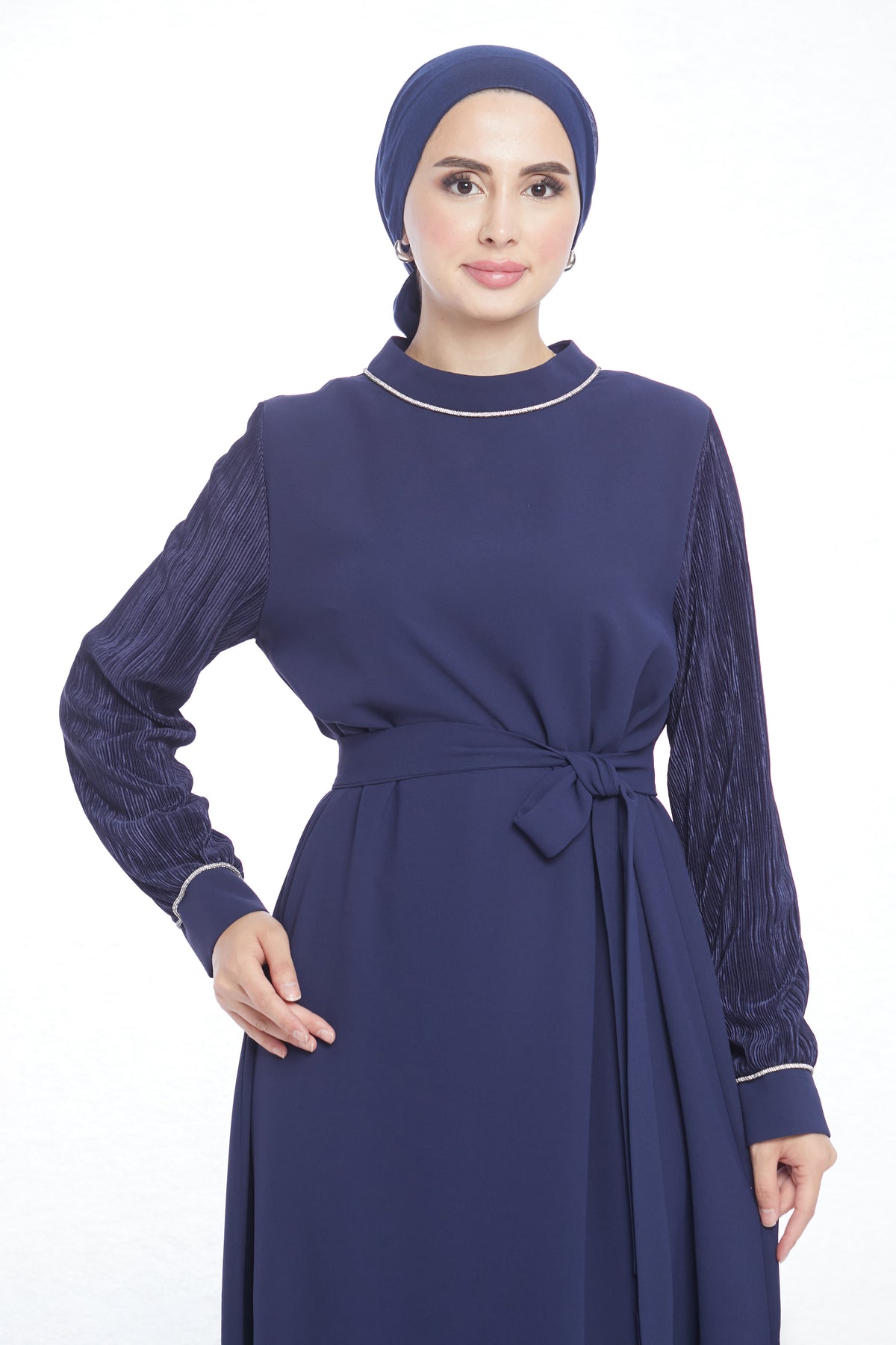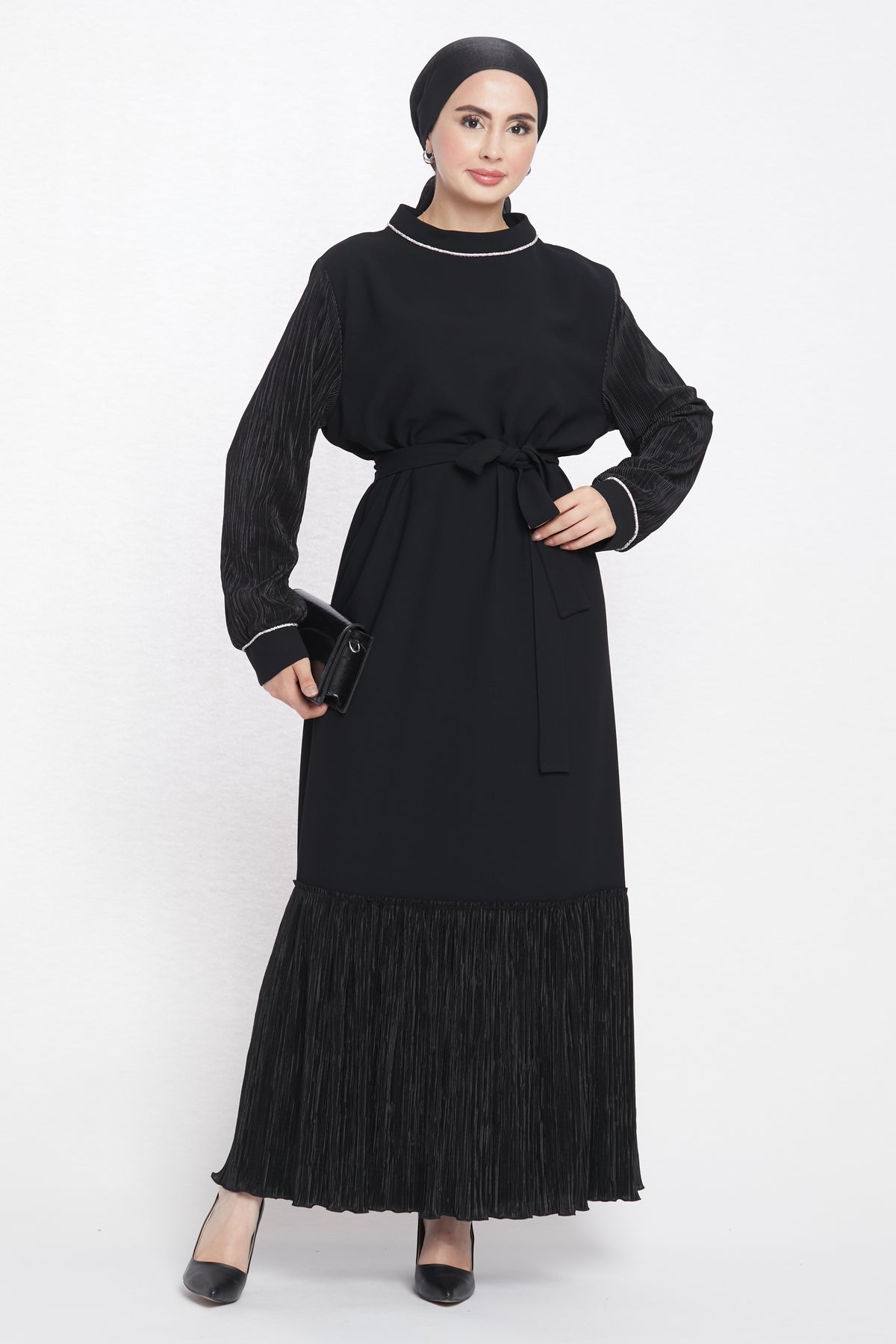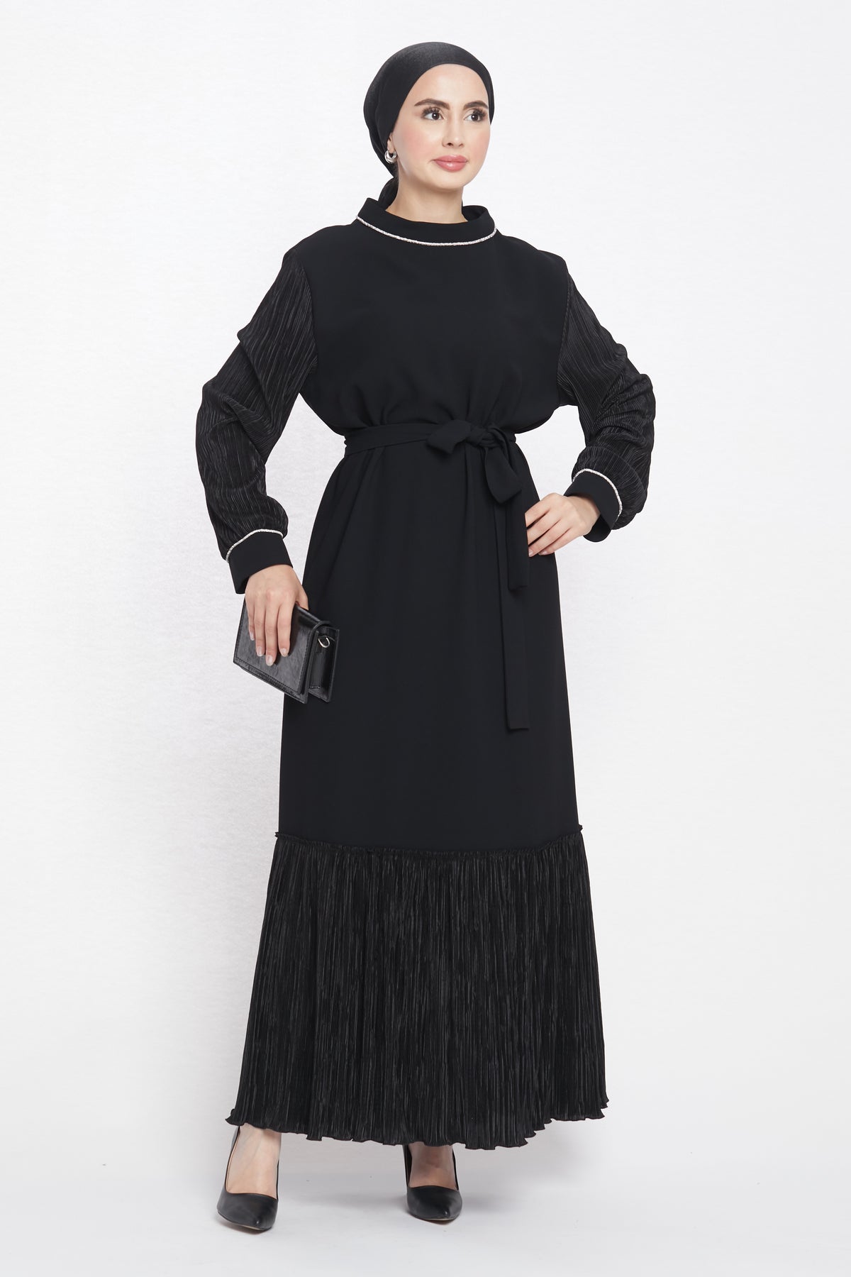 With its elegance and unique design, the special design dress with sleeve and hem details brings a sophisticated touch to your wardrobe. The ribbed contrasting fabric used on the sleeves and hem adds a refined texture to the design. Sparkling stone details around the neckline and sleeve openings enhance its modern appeal. The matching belt accentuates the waist gracefully, making this dress a striking choice for both special events and stylish gatherings.