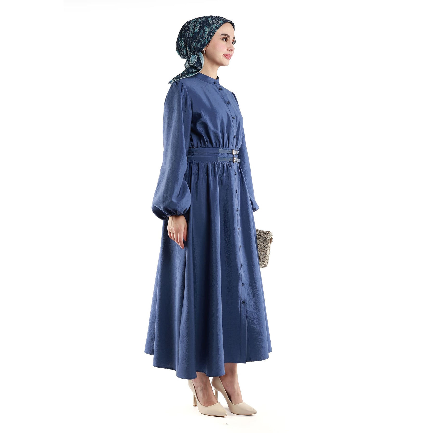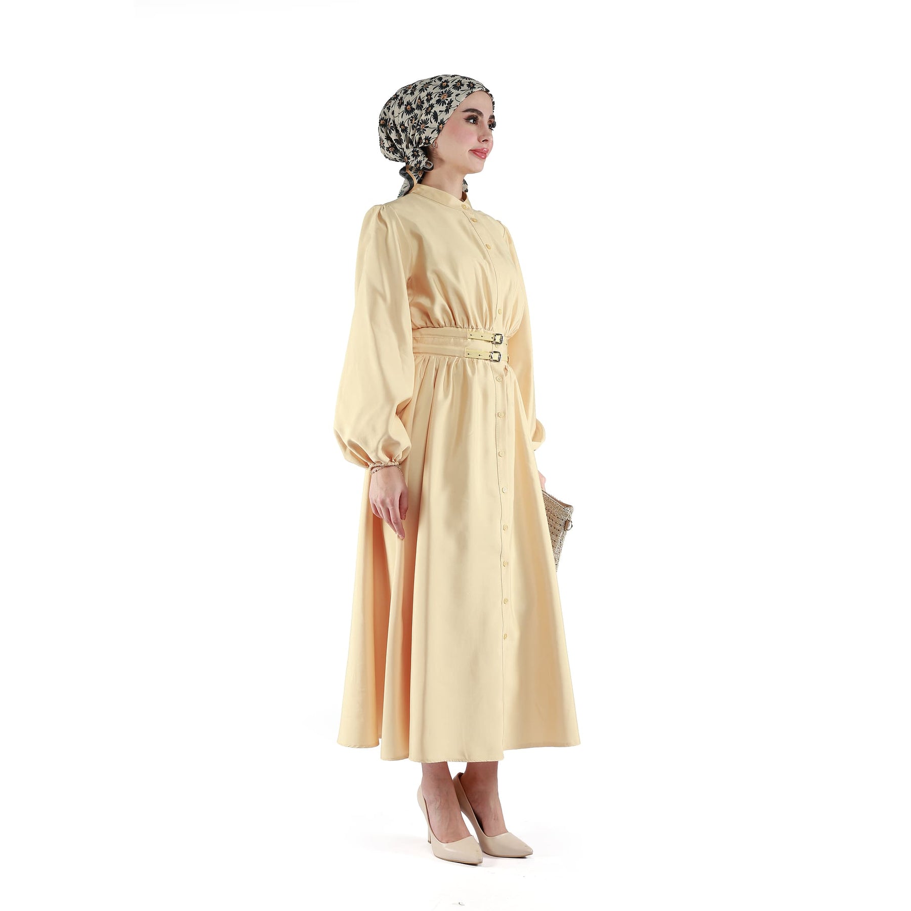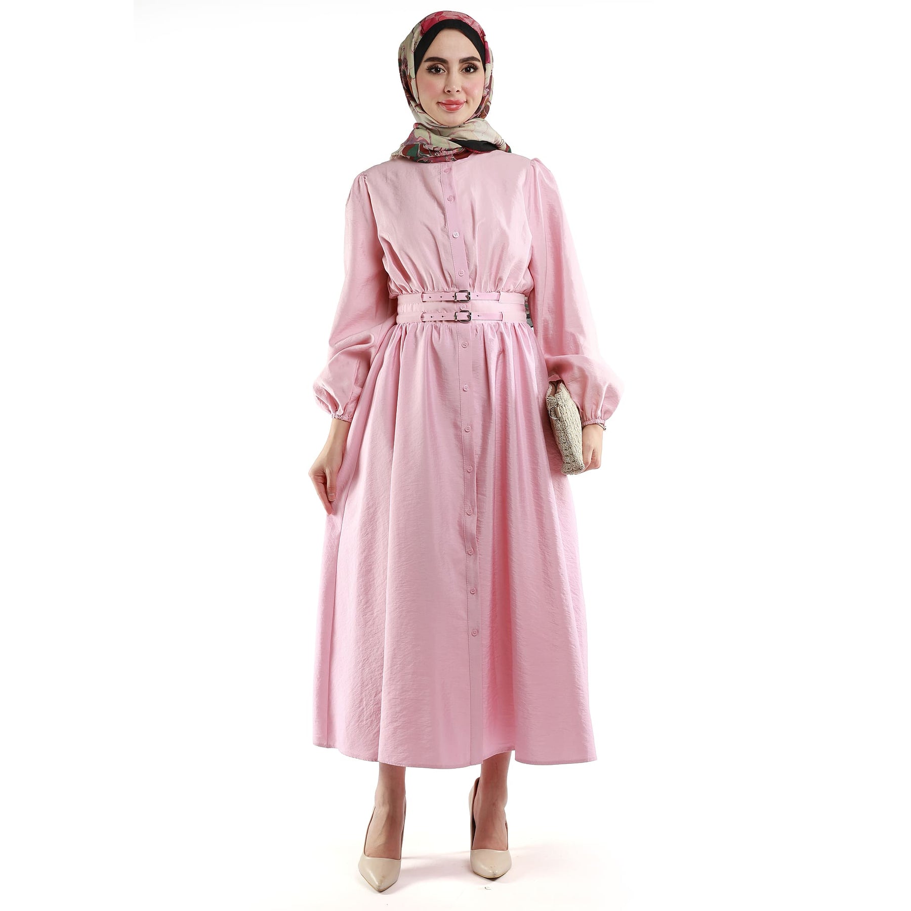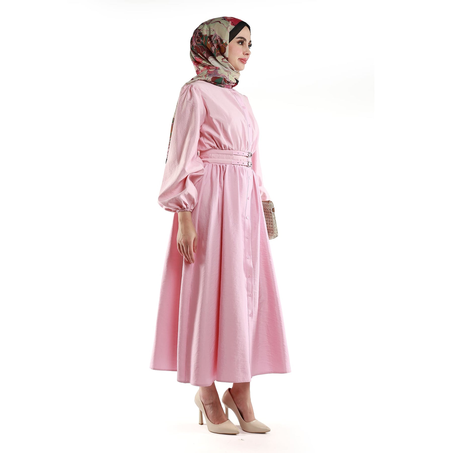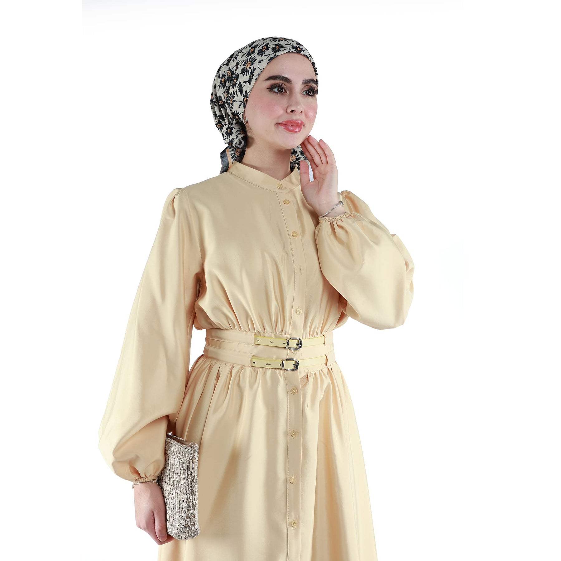 This round-neck dress with double belt details features a lightweight, summer-appropriate design. The double belts at the waist add a stylish touch, while the buttoned front and gathered sleeves enhance its elegance and comfort. Ideal for daily wear.