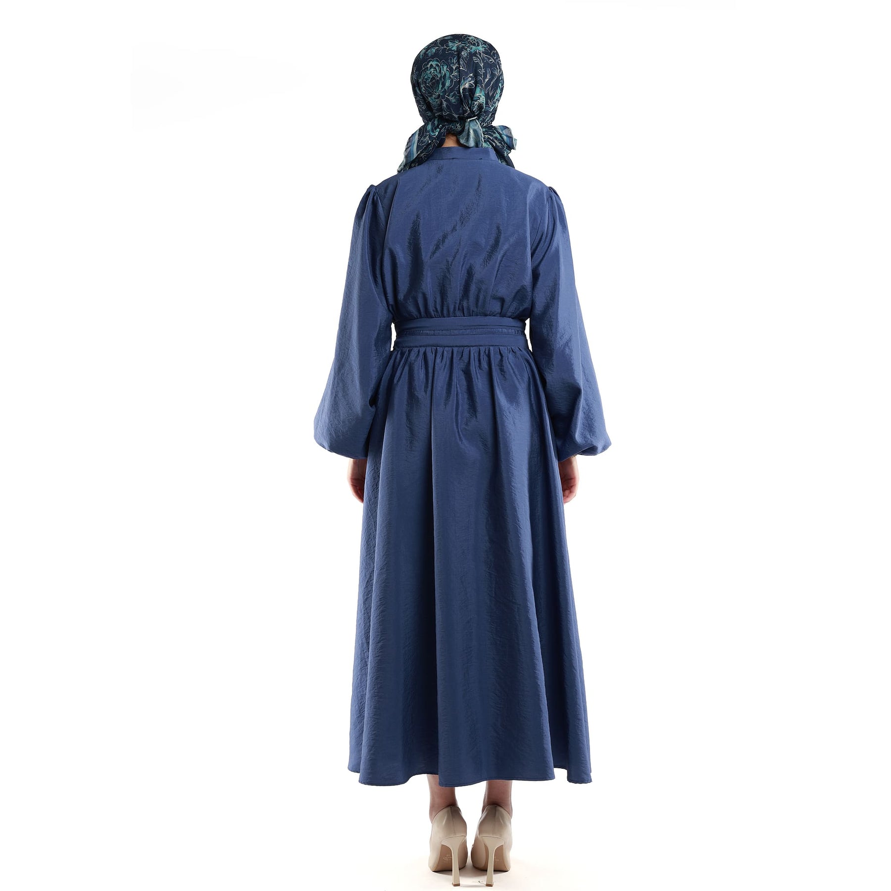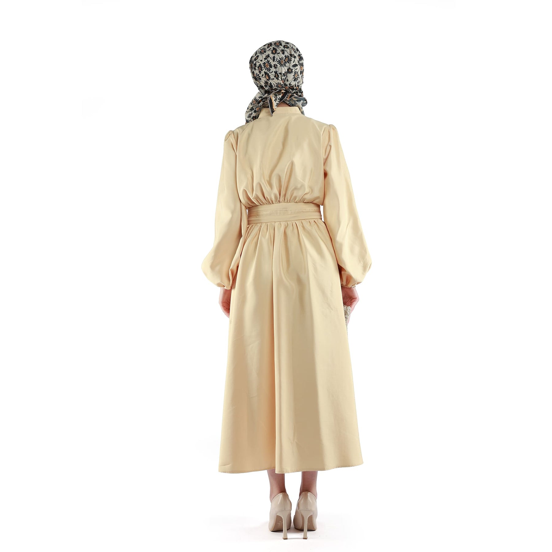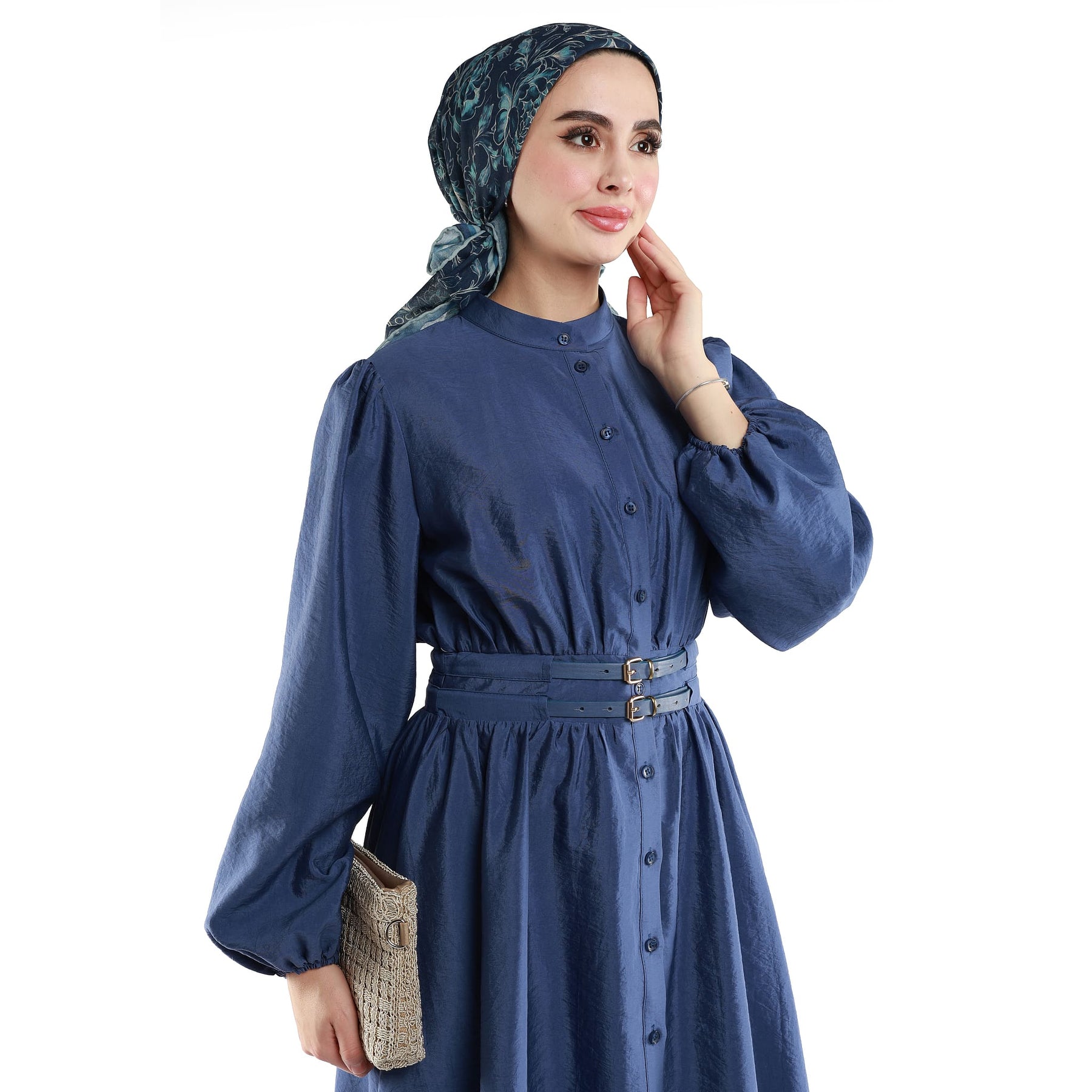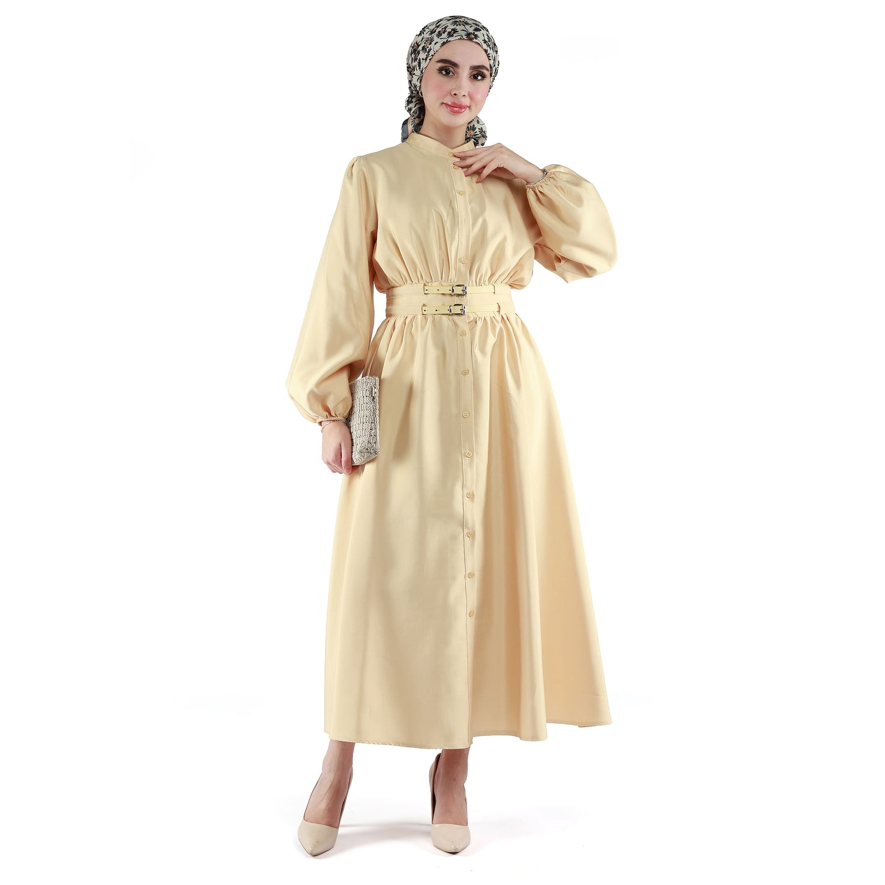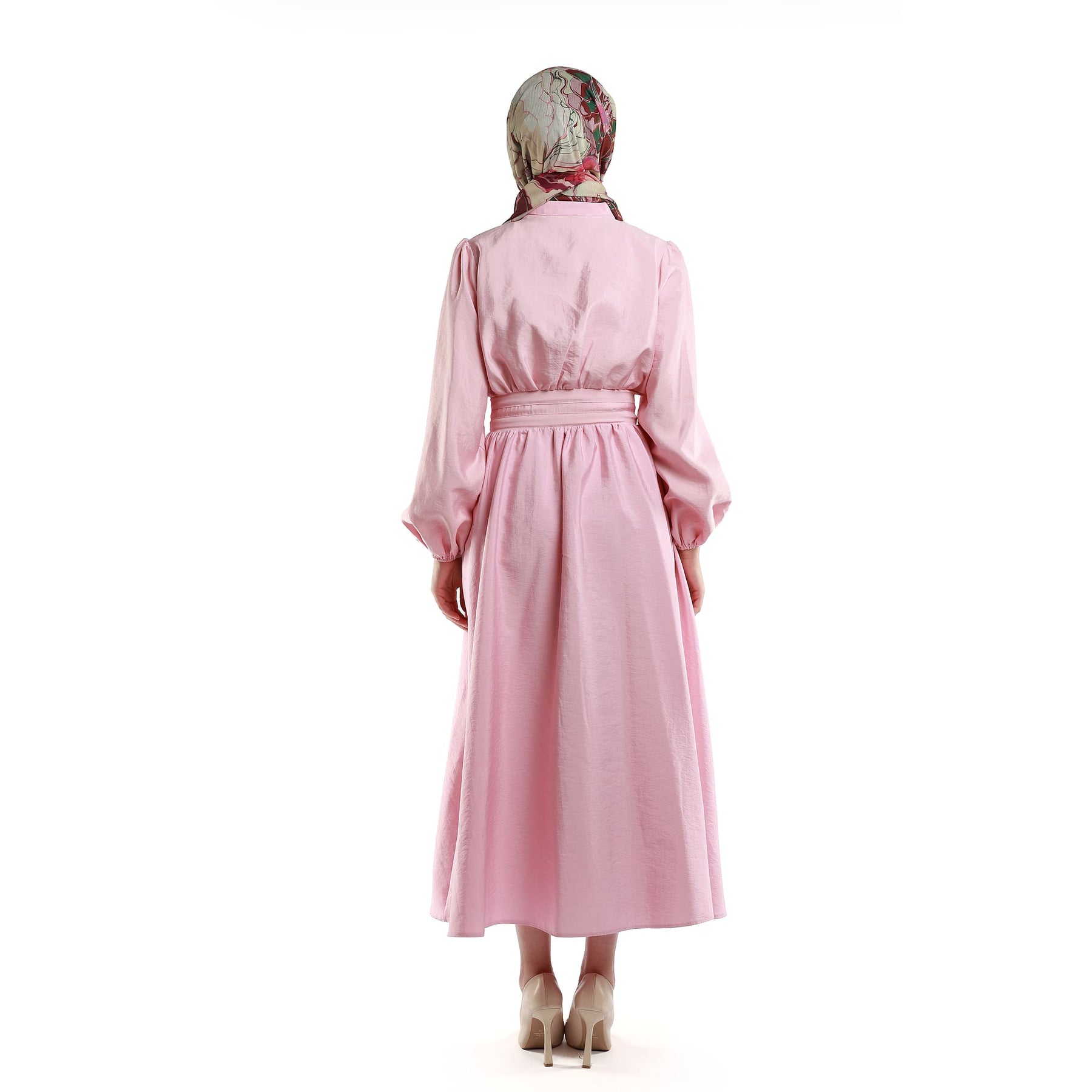 This round-neck dress with double belt details features a lightweight, summer-appropriate design. The double belts at the waist add a stylish touch, while the buttoned front and gathered sleeves enhance its elegance and comfort. Ideal for daily wear.
