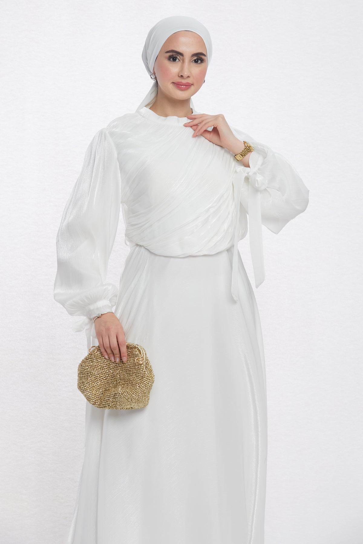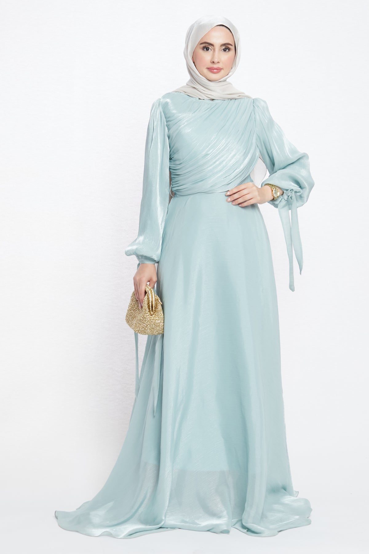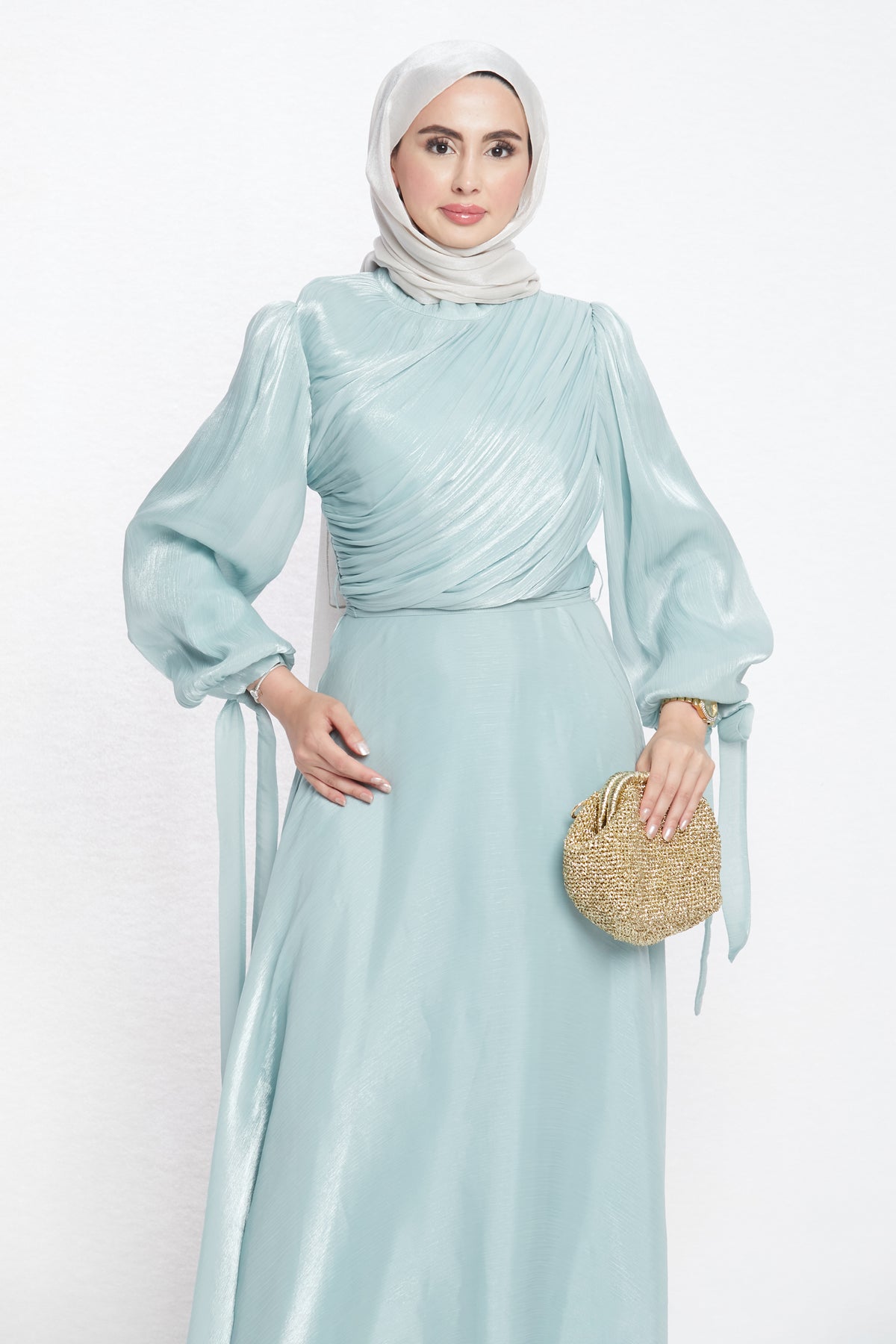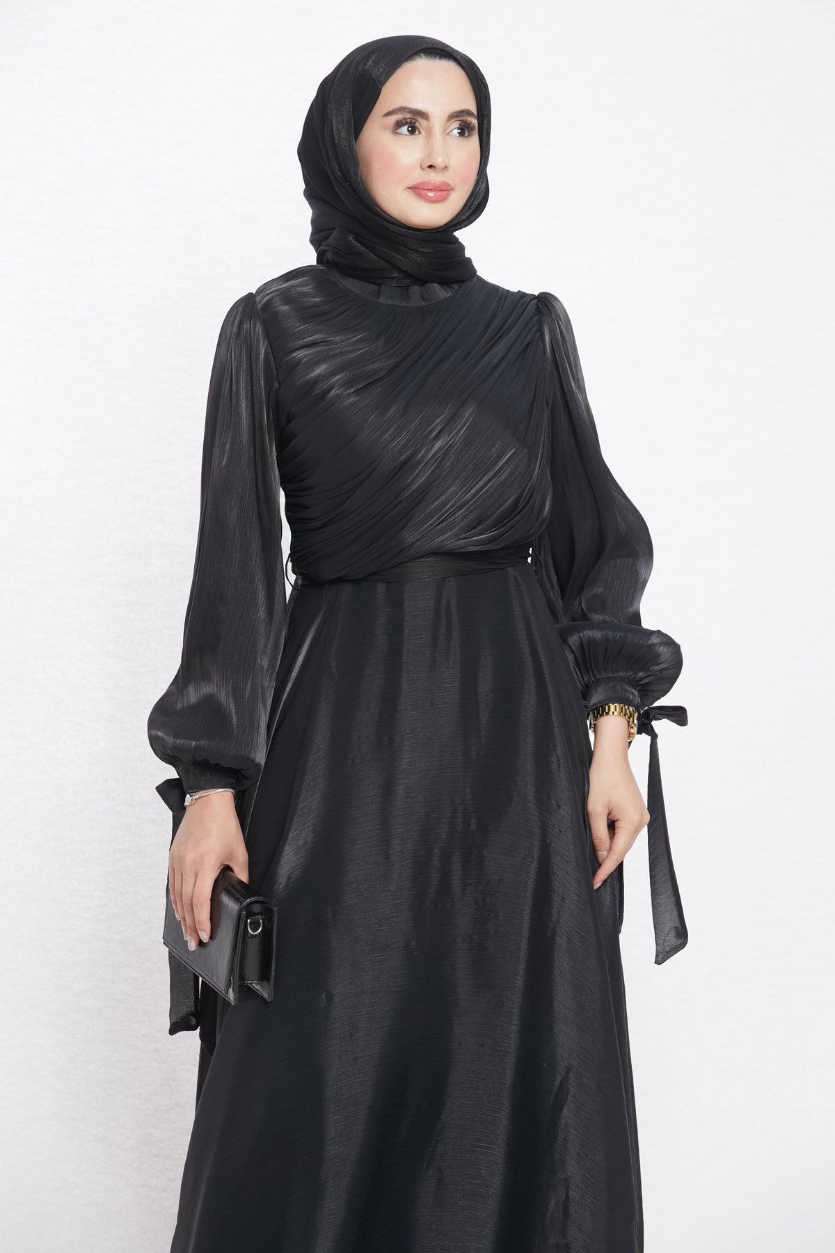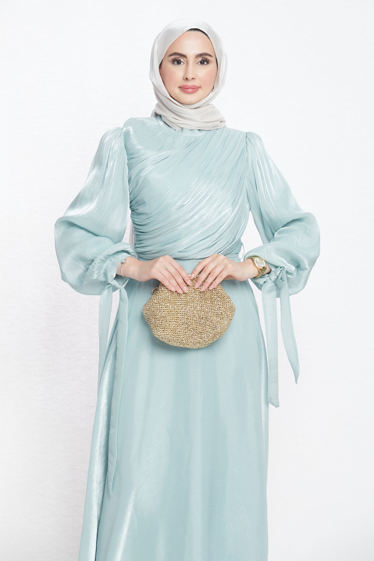 The ruched lined dress stands out with its elegant details, making it a perfect choice for both everyday wear and special occasions. The tied ruched detail on the sleeves creates a voluminous and flowing effect, adding a romantic touch. The twisted-style design on the upper part harmonizes with the sleeves, while the straight-cut lower part offers a simple yet chic balance.
