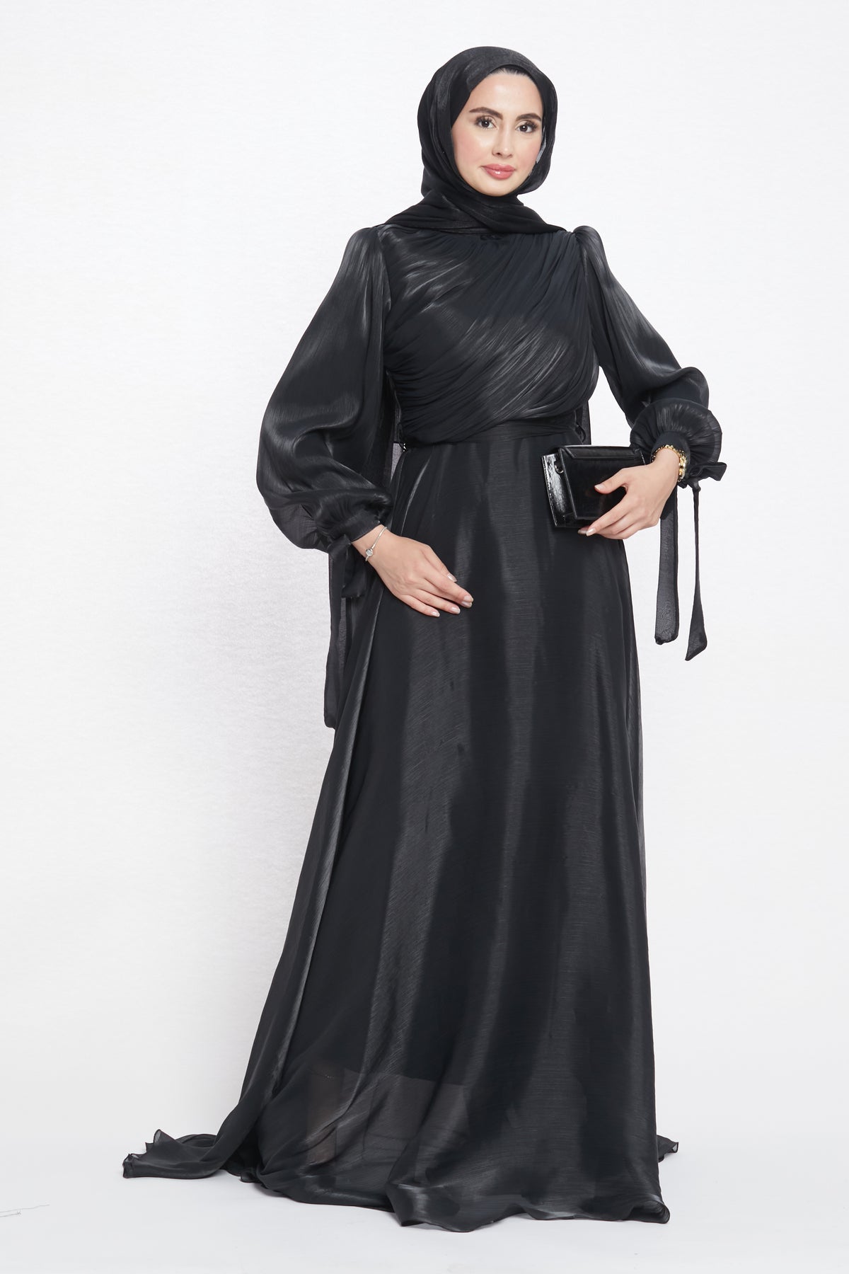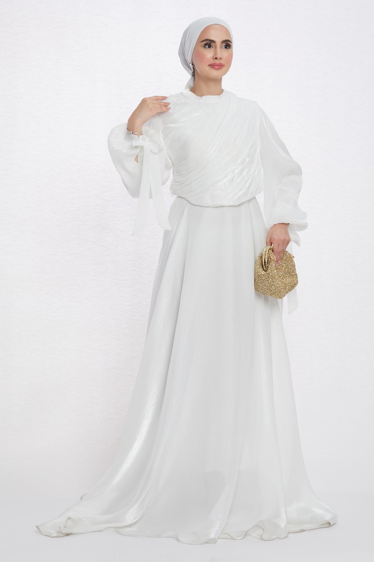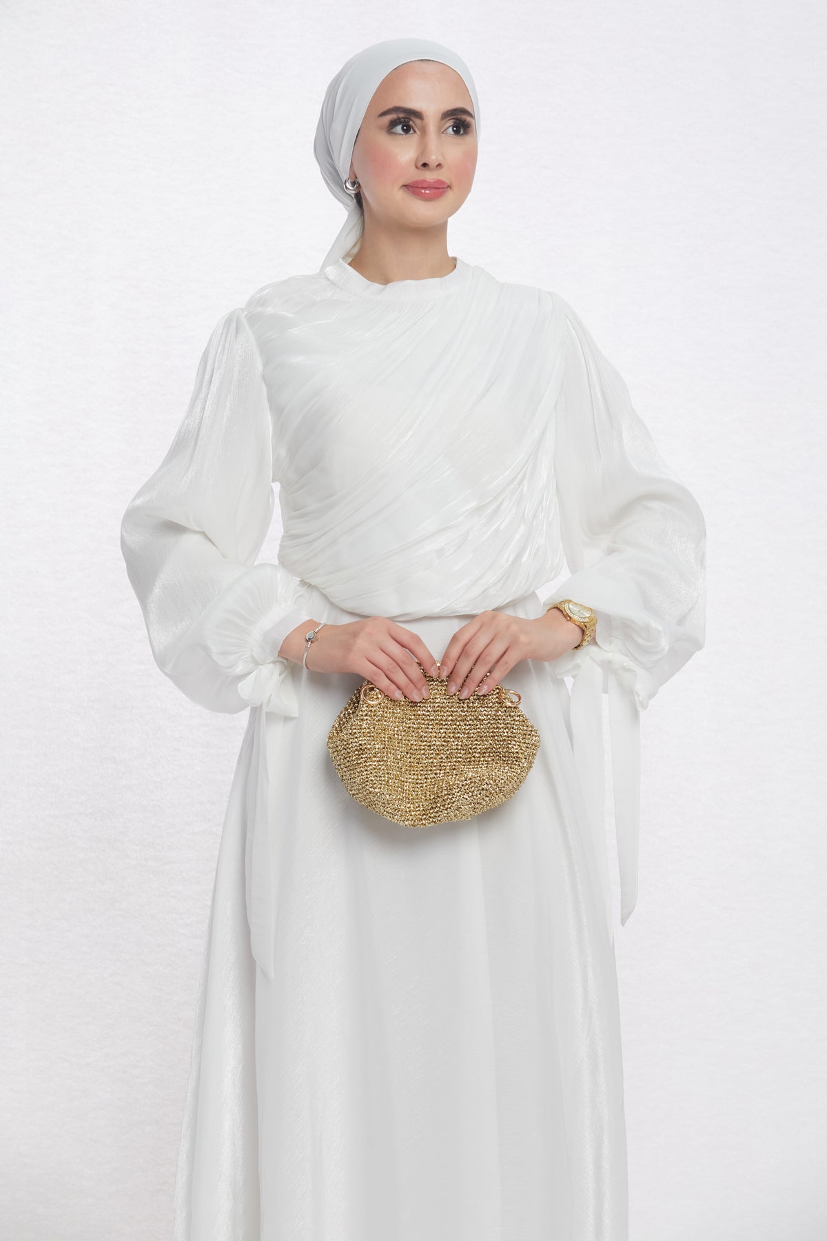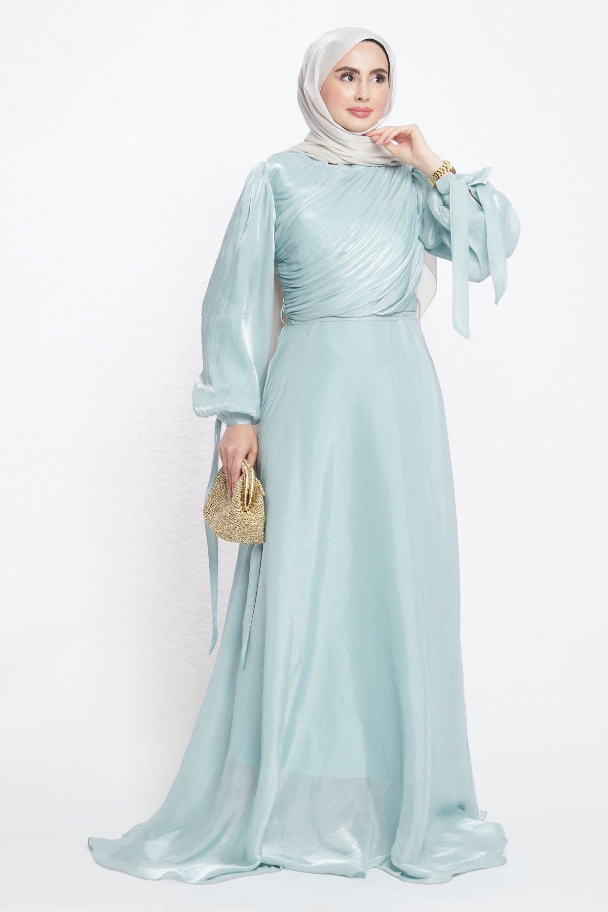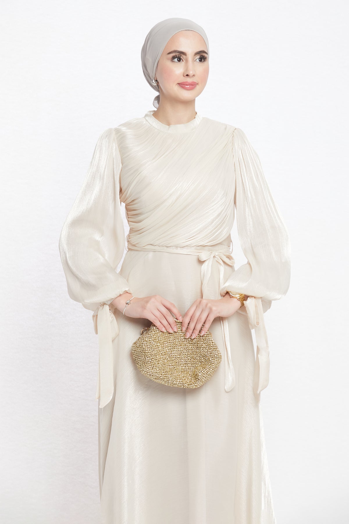 The ruched lined dress stands out with its elegant details, making it a perfect choice for both everyday wear and special occasions. The tied ruched detail on the sleeves creates a voluminous and flowing effect, adding a romantic touch. The twisted-style design on the upper part harmonizes with the sleeves, while the straight-cut lower part offers a simple yet chic balance.