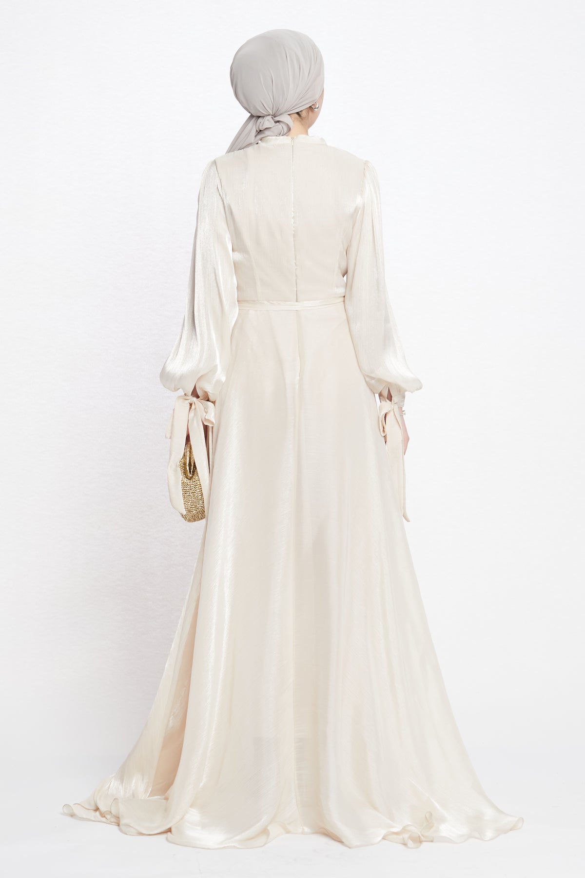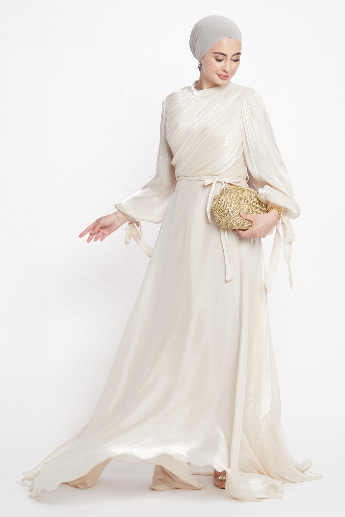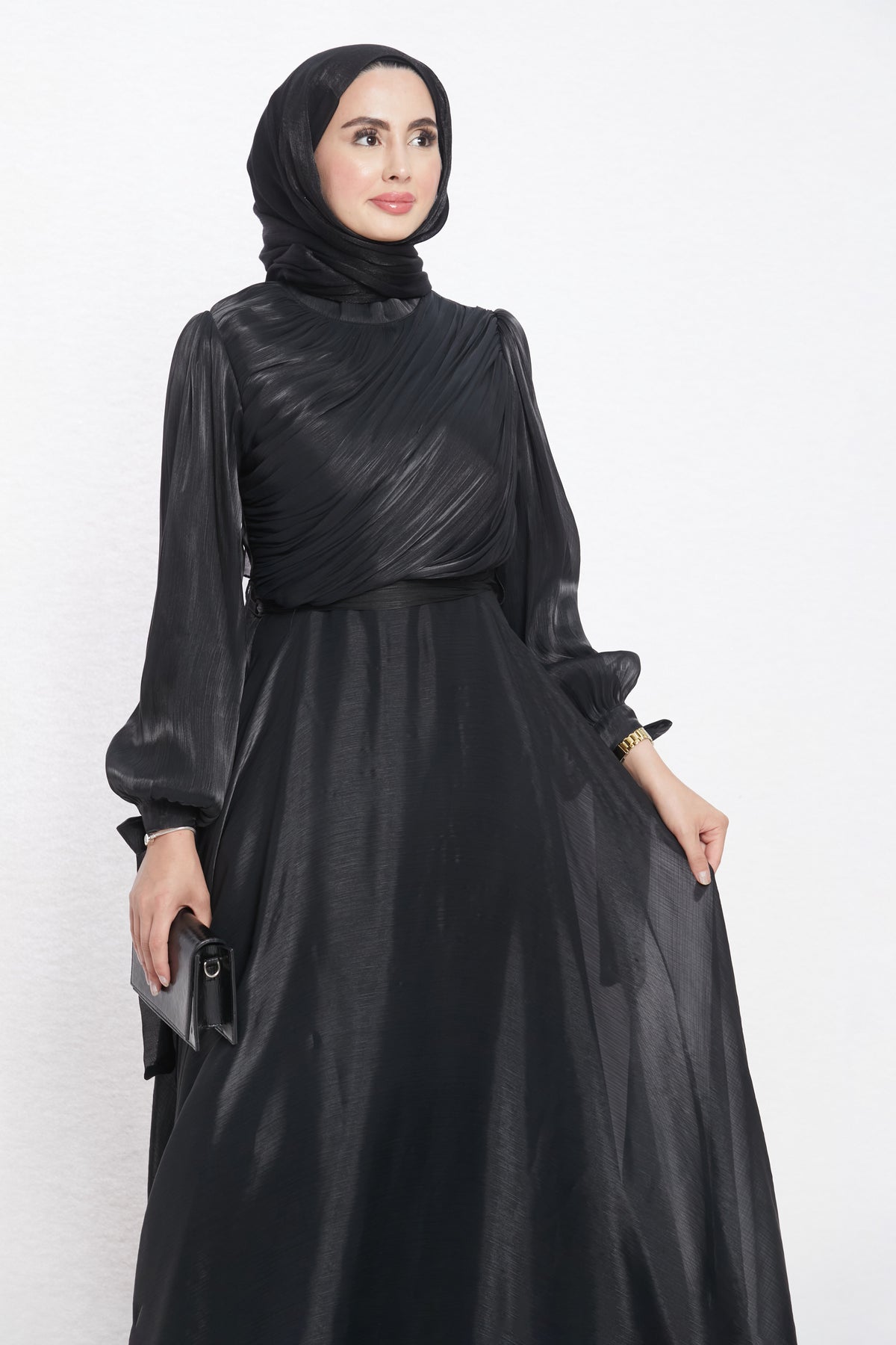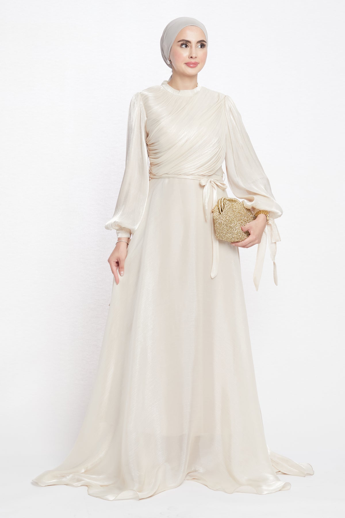 The ruched lined dress stands out with its elegant details, making it a perfect choice for both everyday wear and special occasions. The tied ruched detail on the sleeves creates a voluminous and flowing effect, adding a romantic touch. The twisted-style design on the upper part harmonizes with the sleeves, while the straight-cut lower part offers a simple yet chic balance.