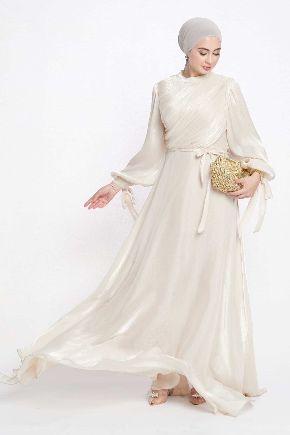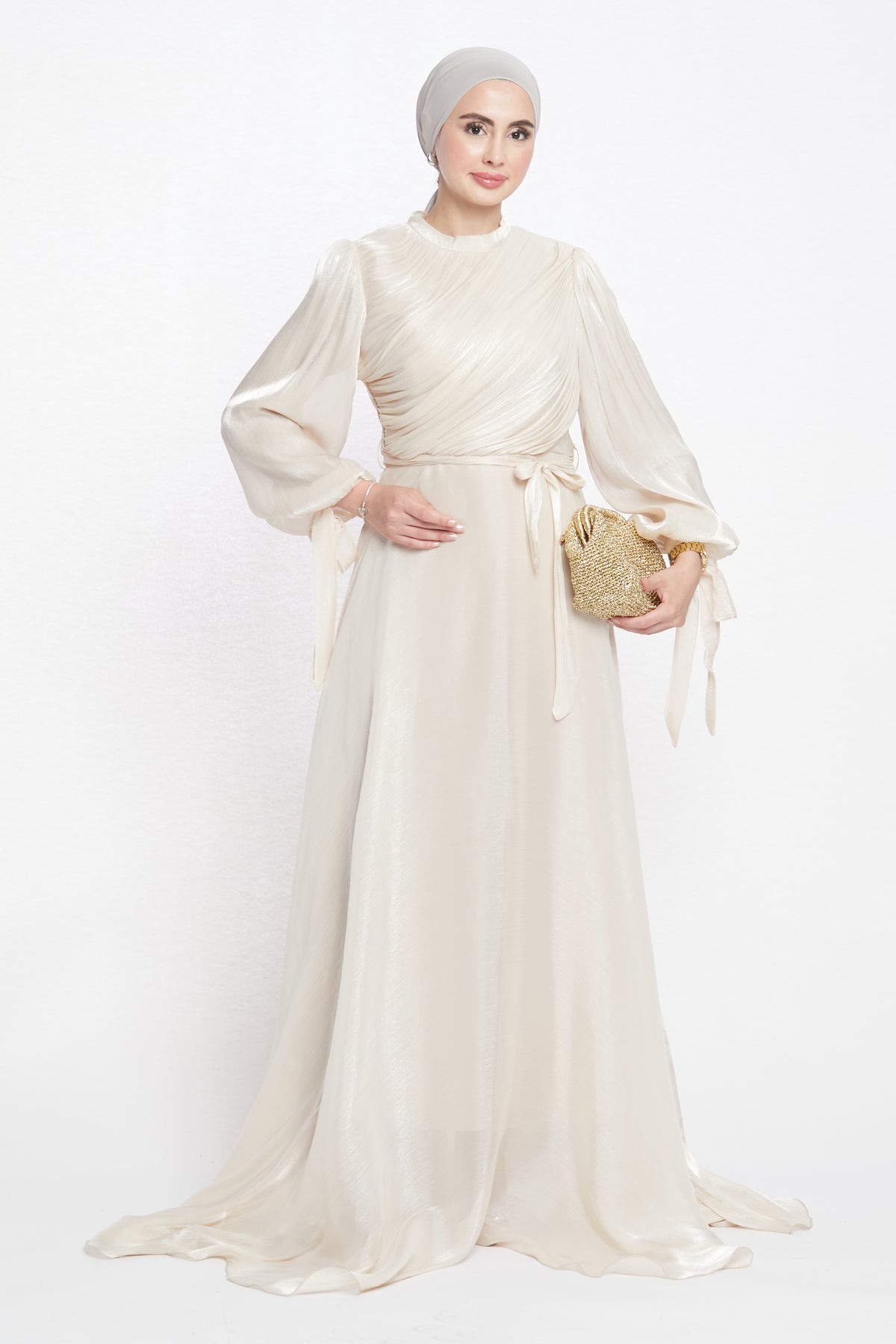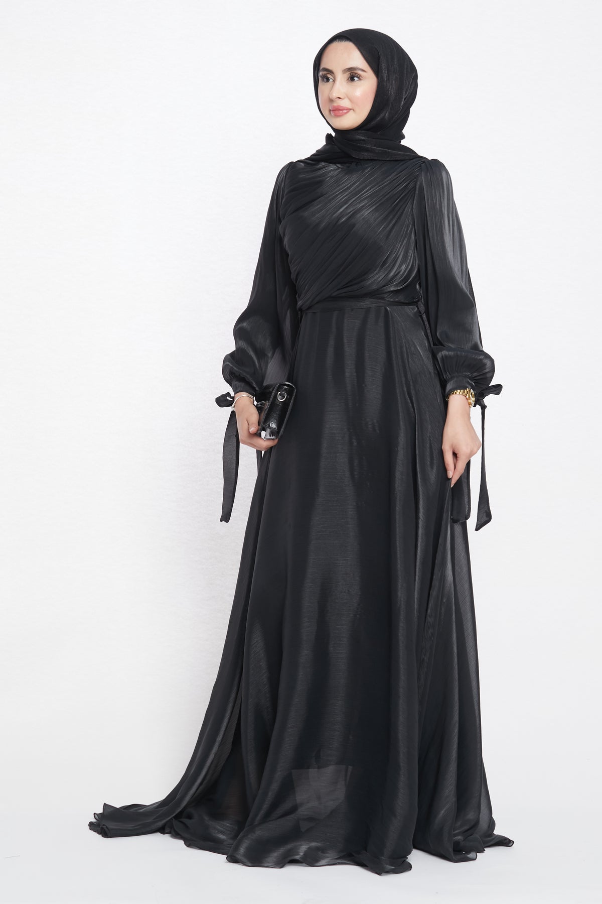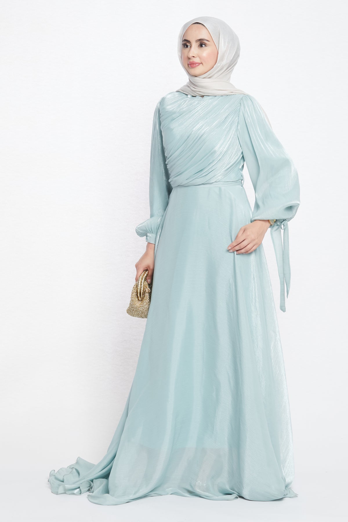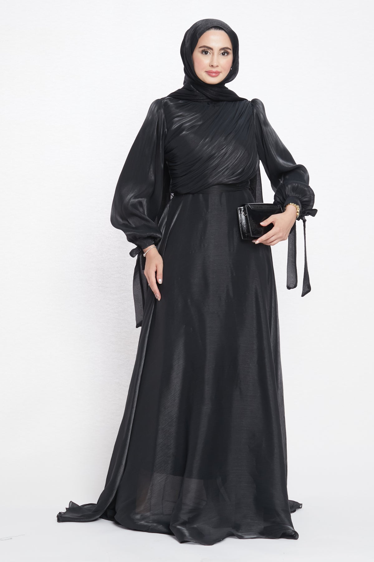 The ruched lined dress stands out with its elegant details, making it a perfect choice for both everyday wear and special occasions. The tied ruched detail on the sleeves creates a voluminous and flowing effect, adding a romantic touch. The twisted-style design on the upper part harmonizes with the sleeves, while the straight-cut lower part offers a simple yet chic balance.