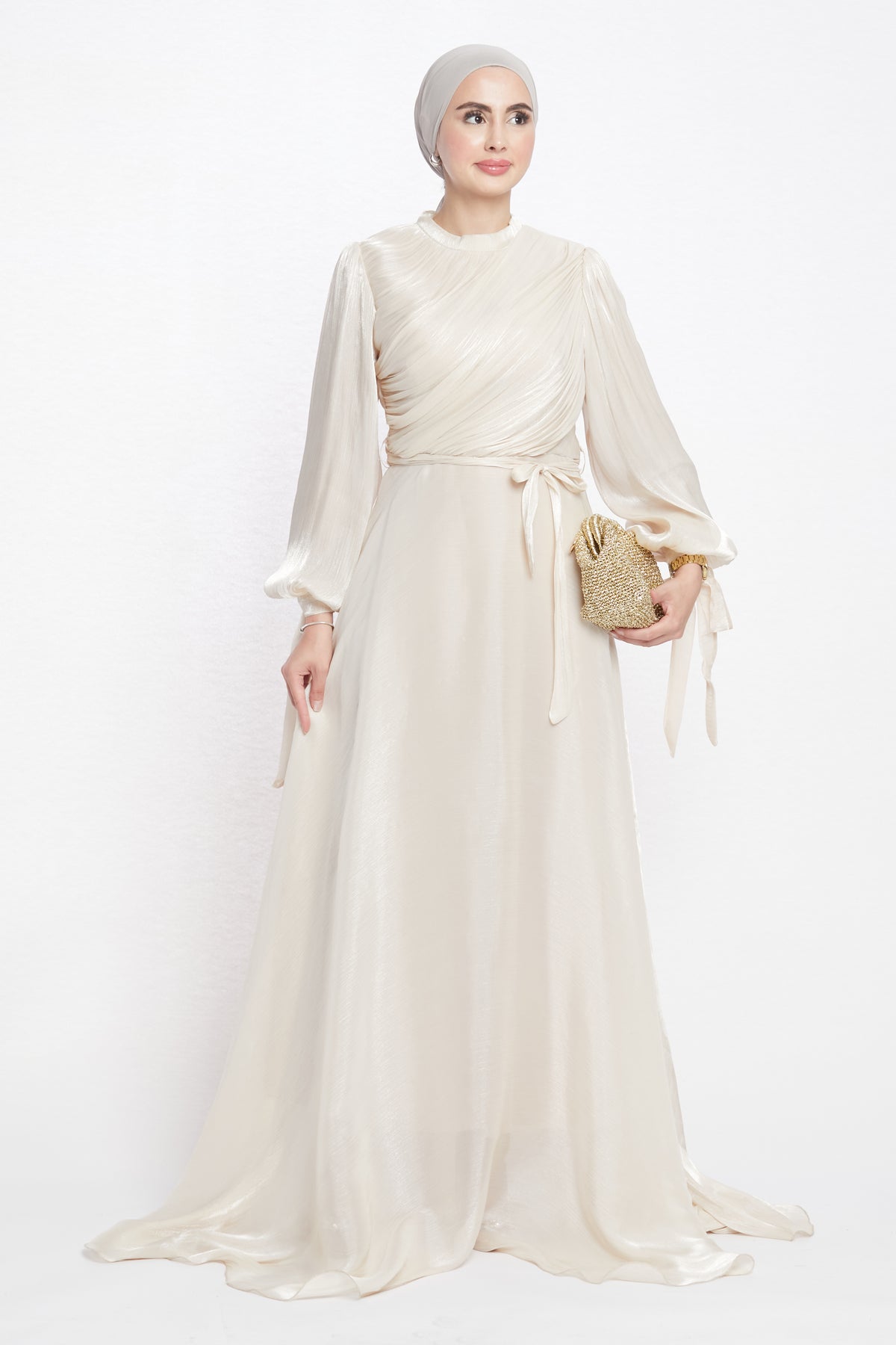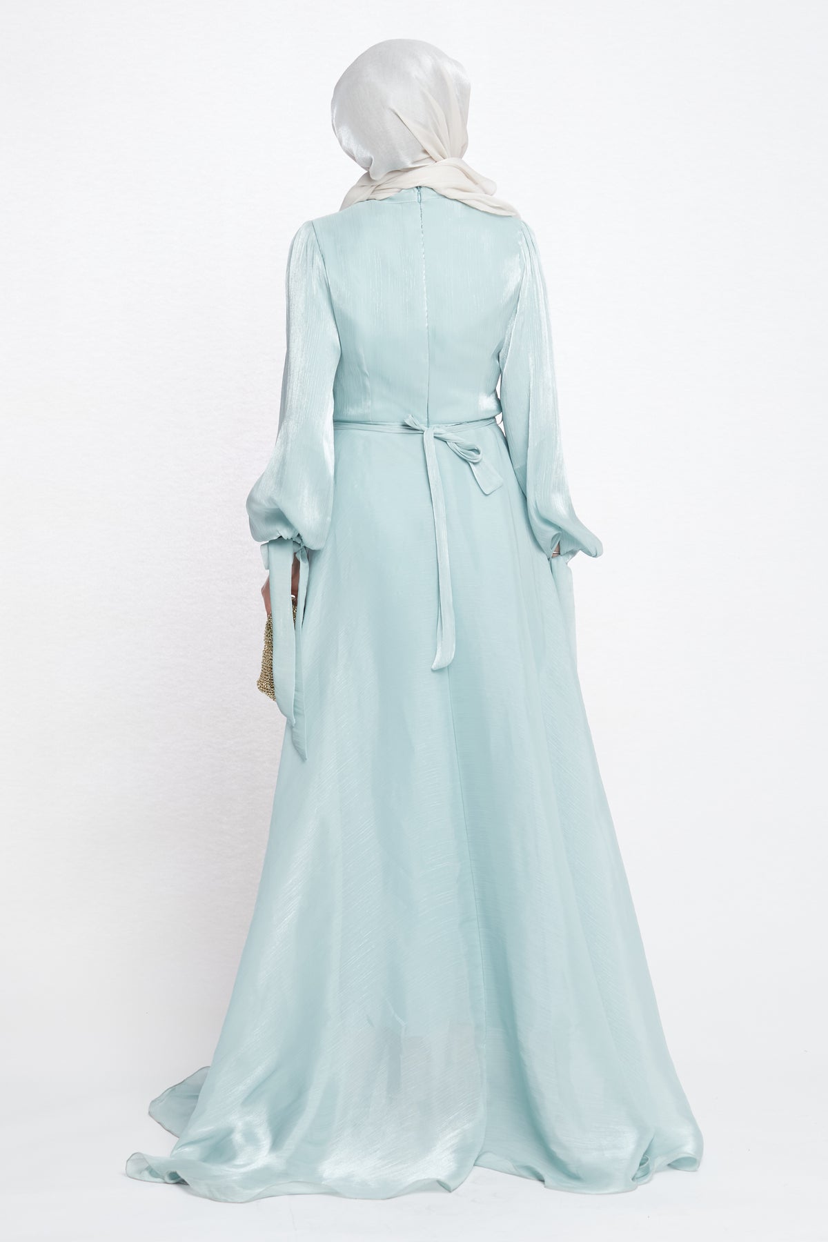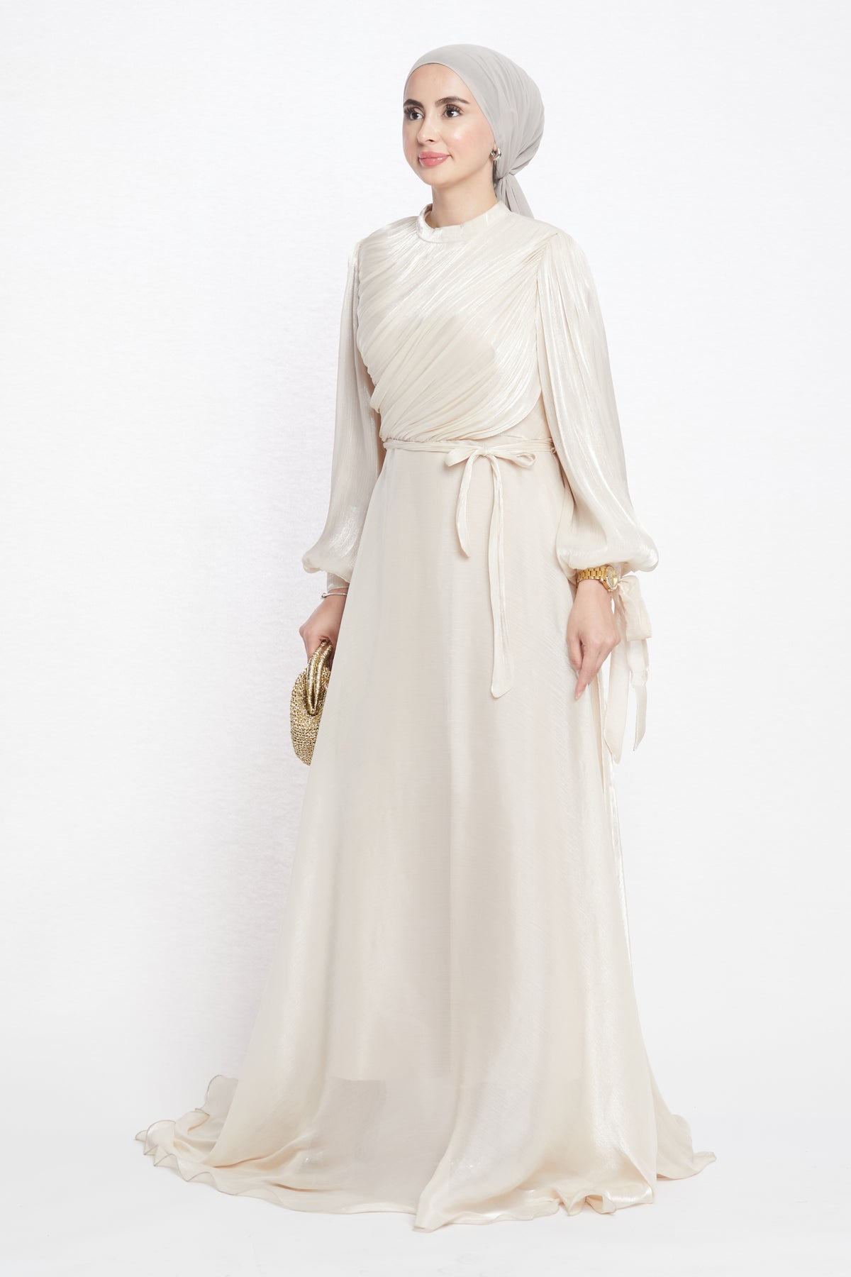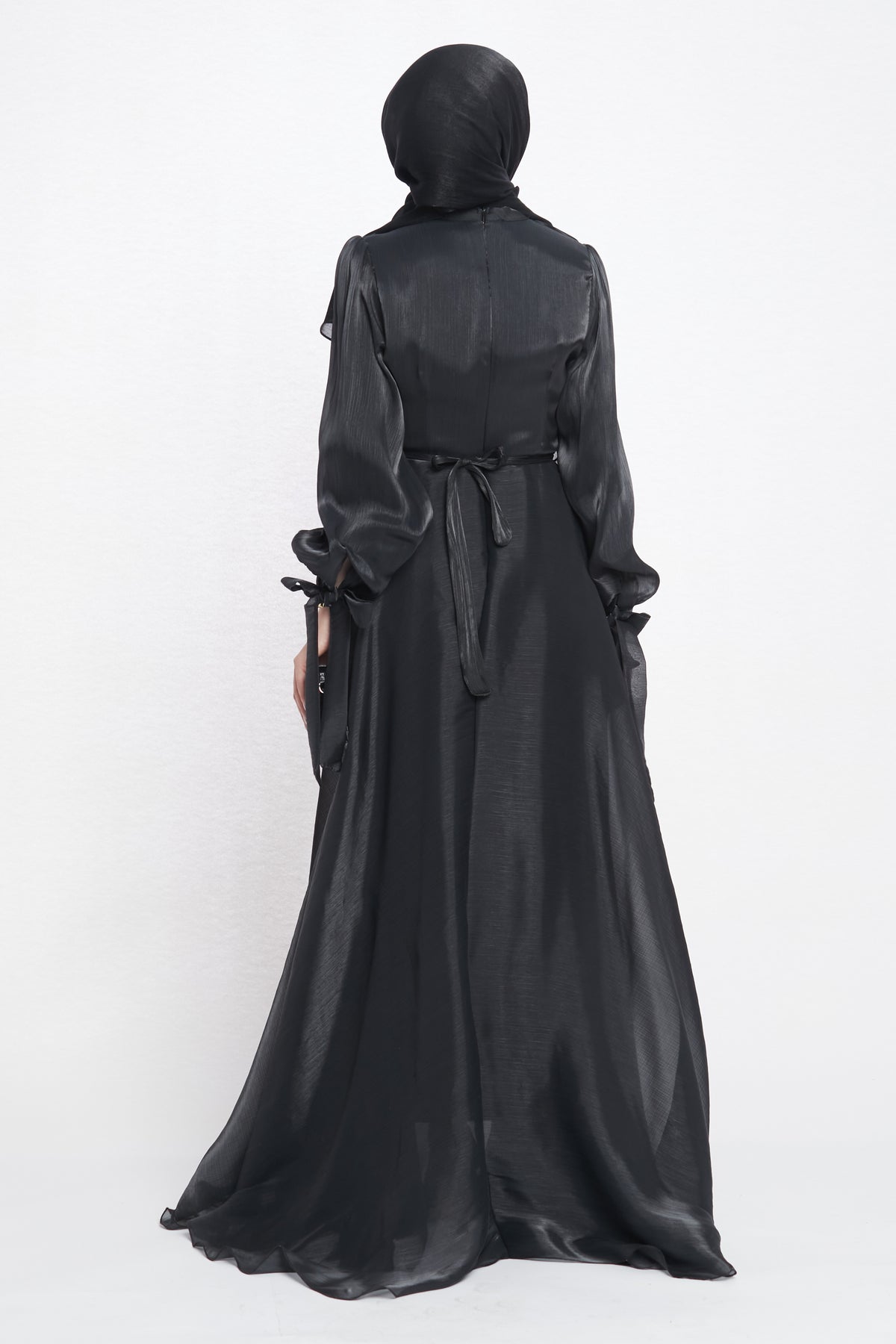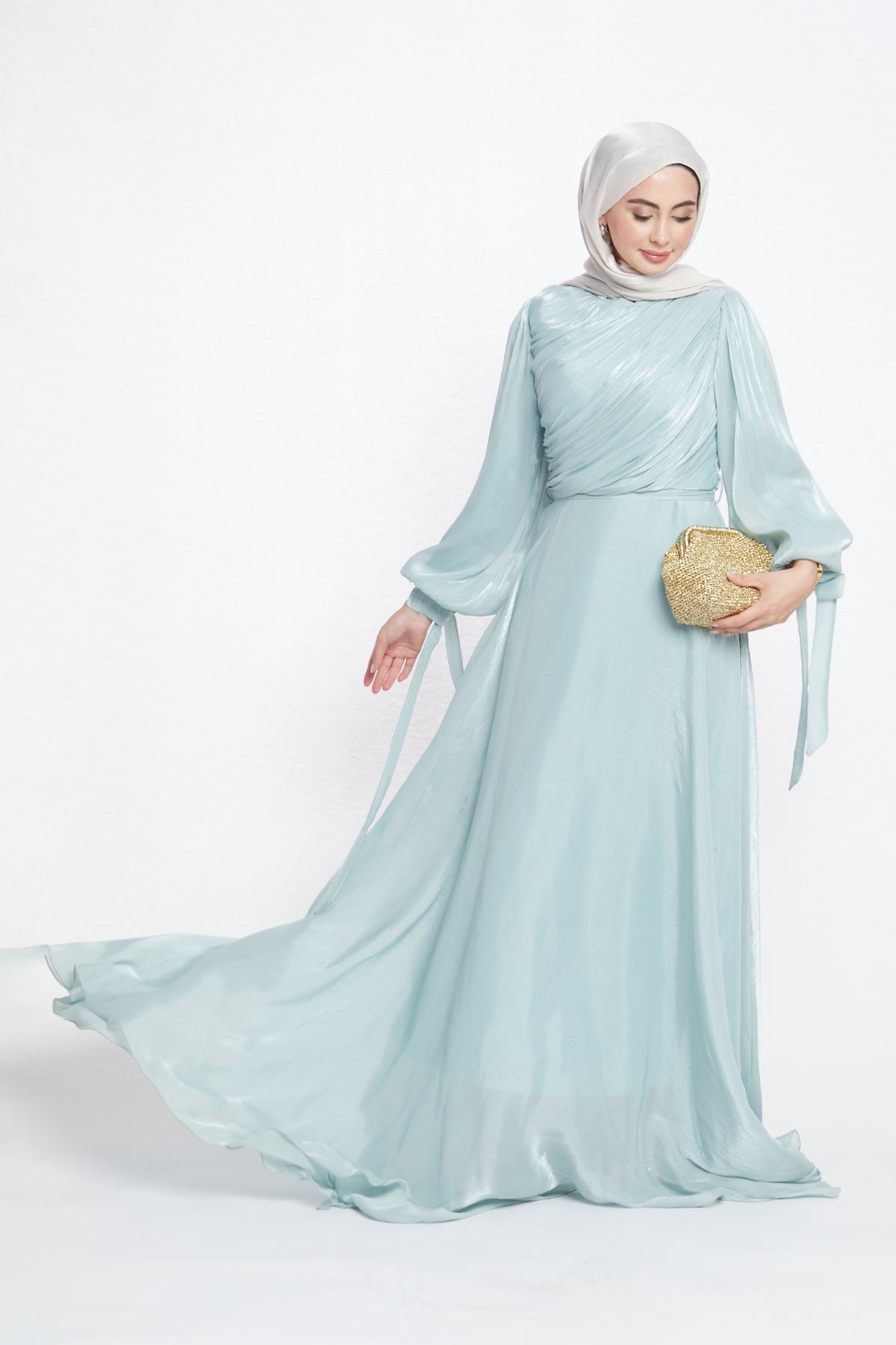 The ruched lined dress stands out with its elegant details, making it a perfect choice for both everyday wear and special occasions. The tied ruched detail on the sleeves creates a voluminous and flowing effect, adding a romantic touch. The twisted-style design on the upper part harmonizes with the sleeves, while the straight-cut lower part offers a simple yet chic balance.