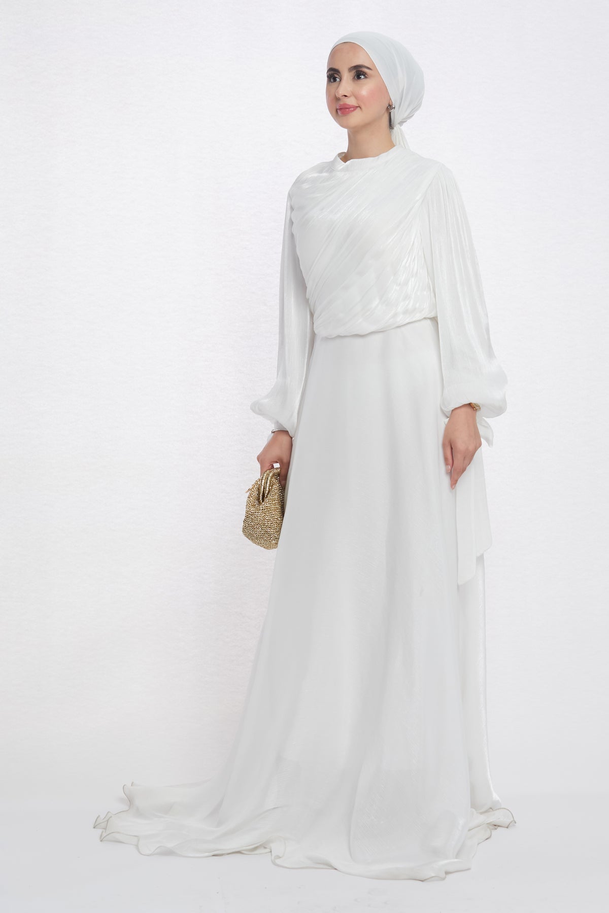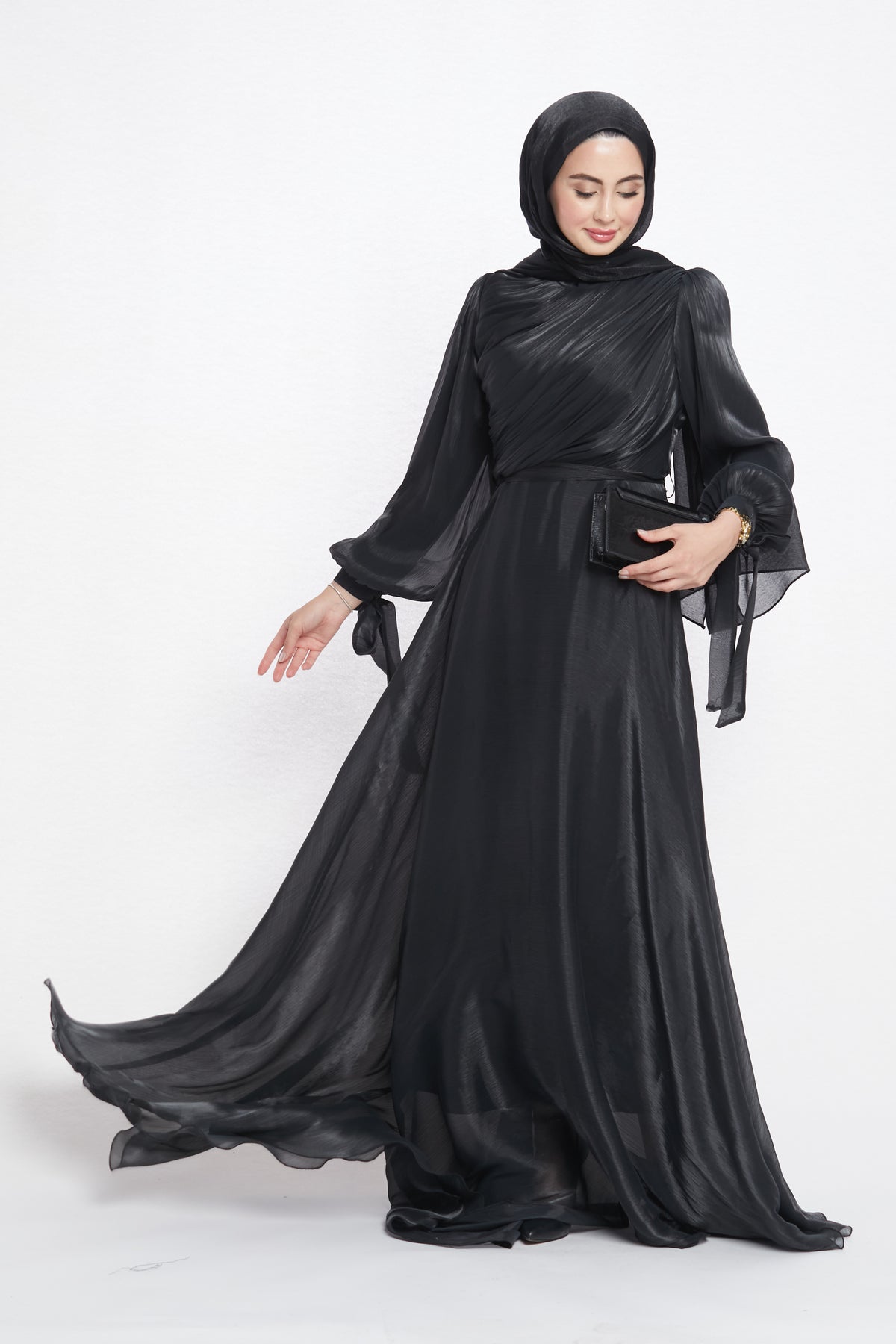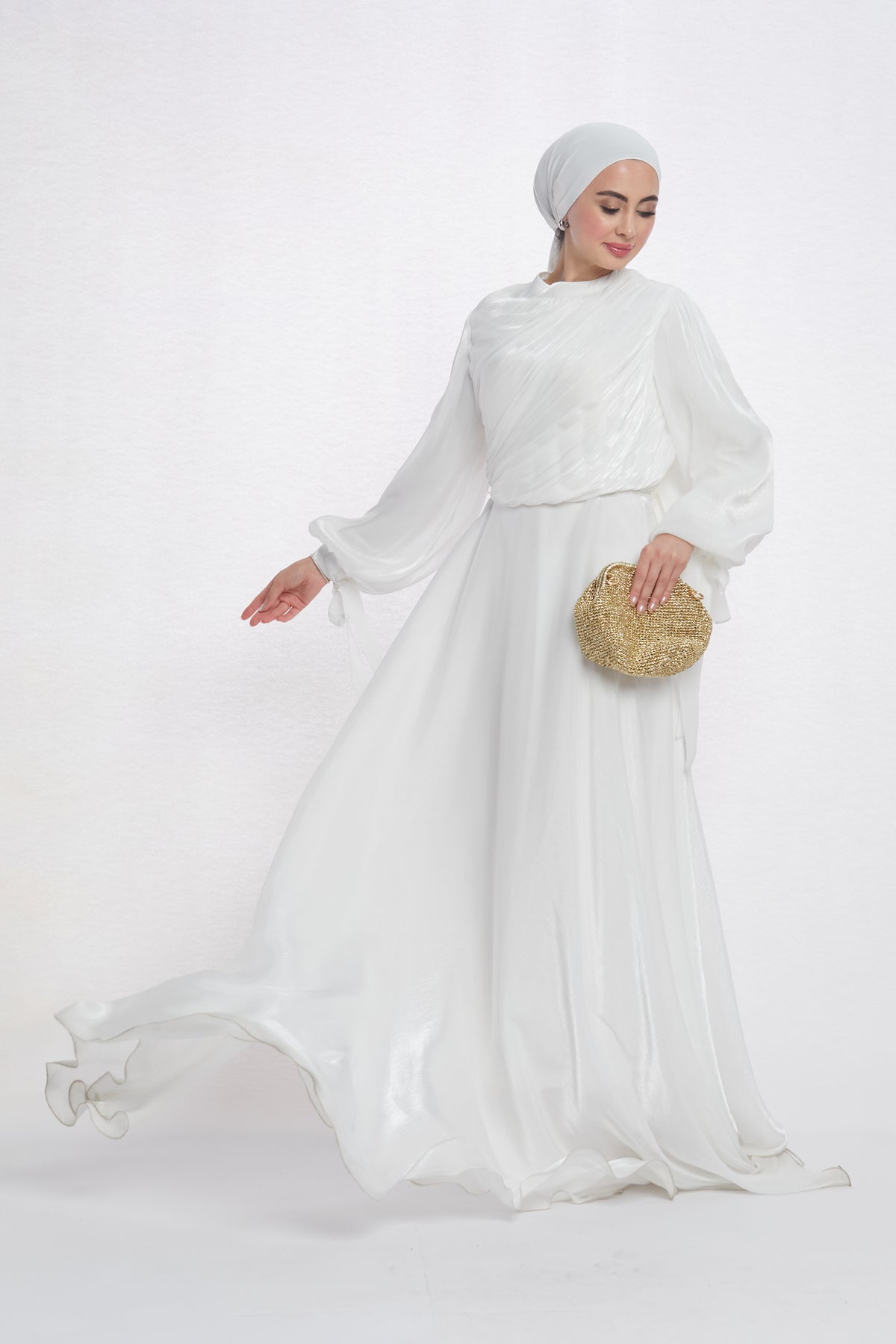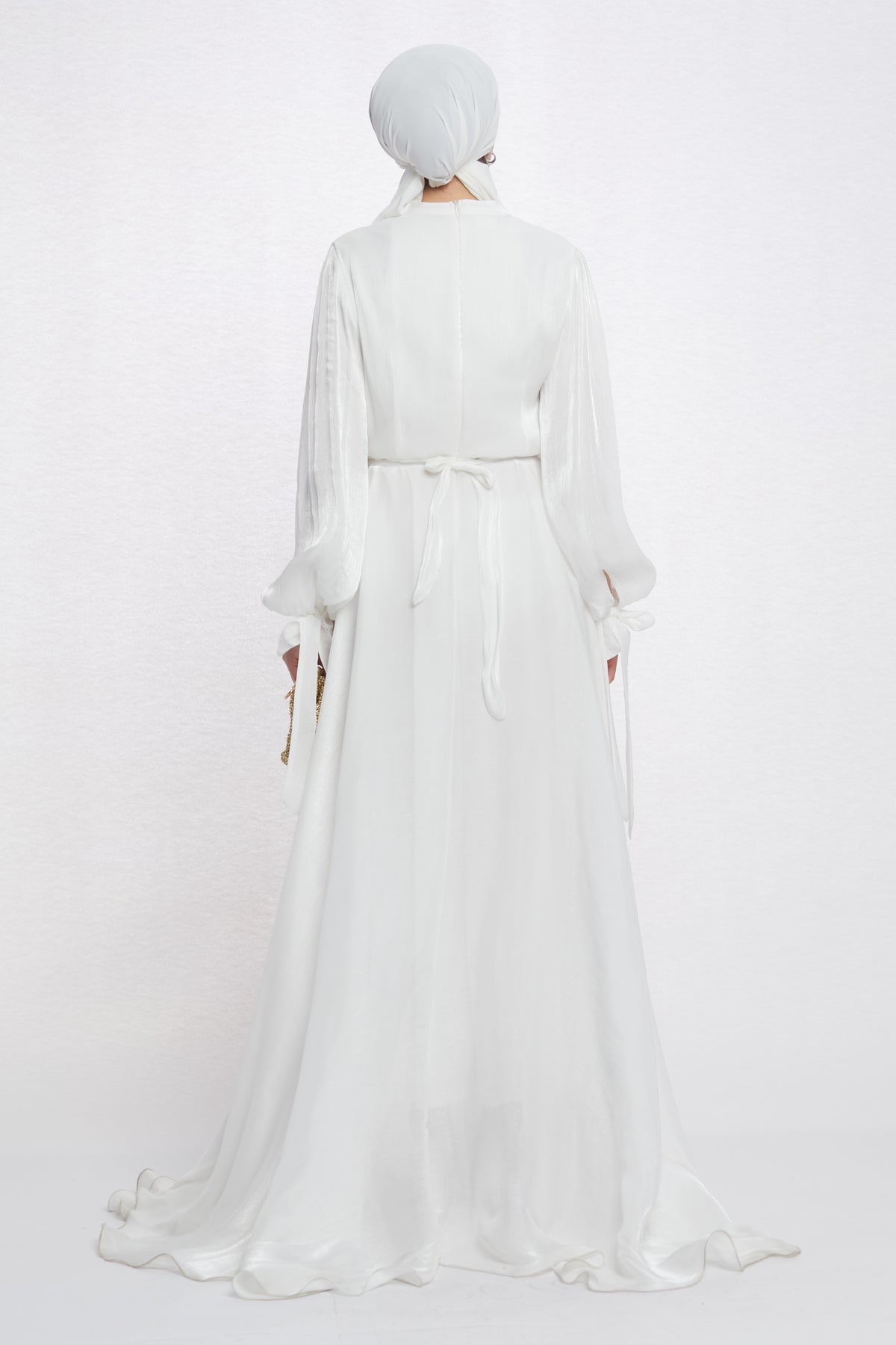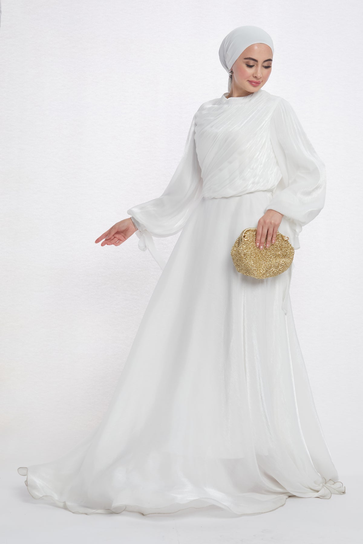 The ruched lined dress stands out with its elegant details, making it a perfect choice for both everyday wear and special occasions. The tied ruched detail on the sleeves creates a voluminous and flowing effect, adding a romantic touch. The twisted-style design on the upper part harmonizes with the sleeves, while the straight-cut lower part offers a simple yet chic balance.