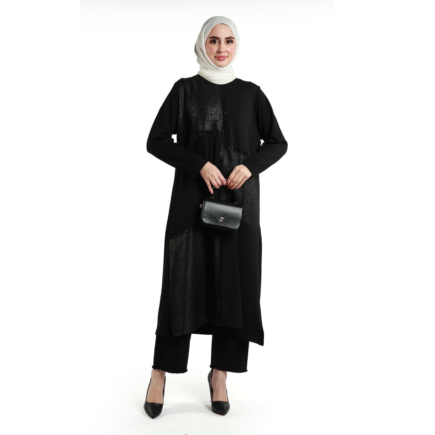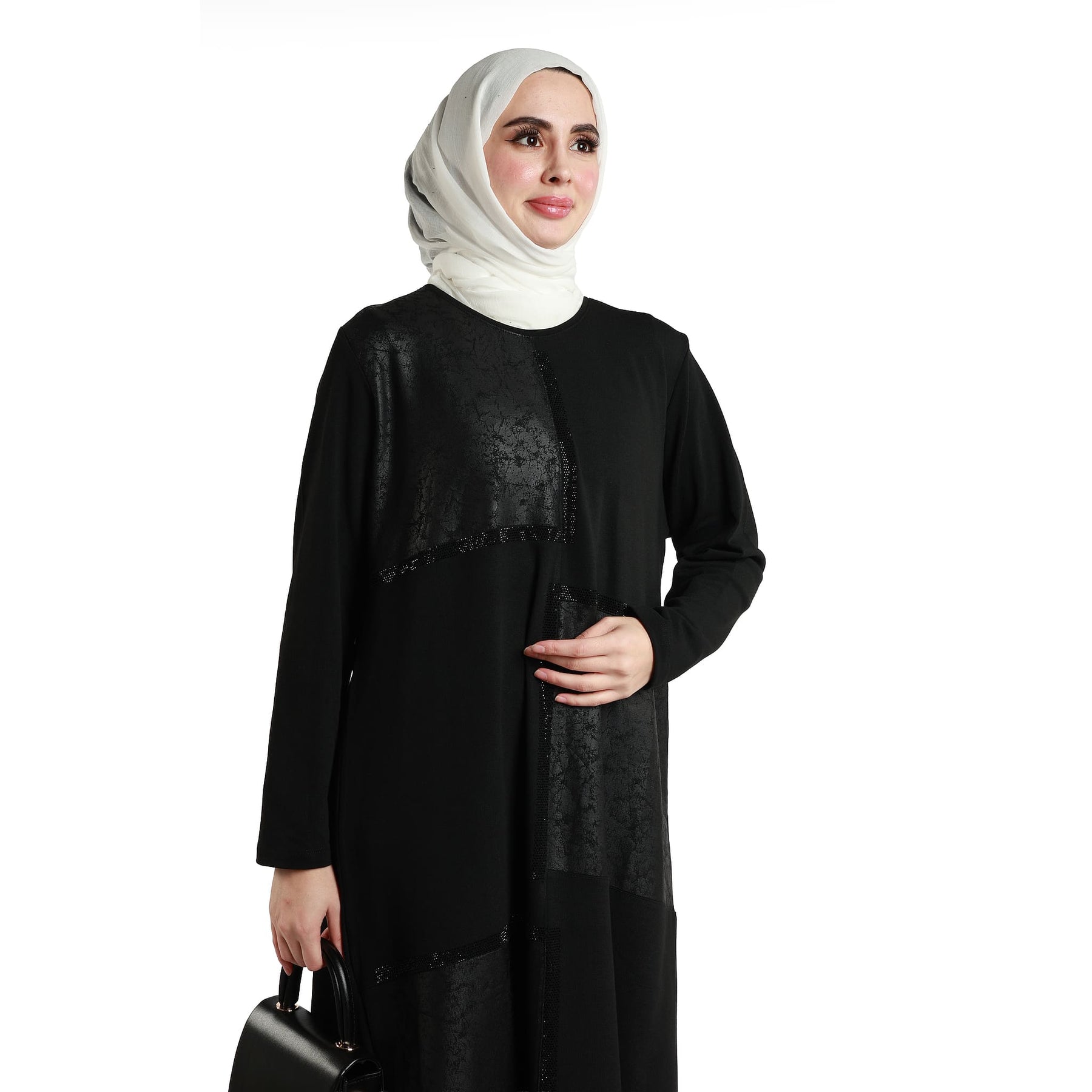 The stone embellished asymmetric dress stands out with elegant stone details, perfect for winter wear. Its asymmetric cut and crew neckline provide a modern and refined style. Available in two print variants (black and leopard), it offers options for different tastes.
