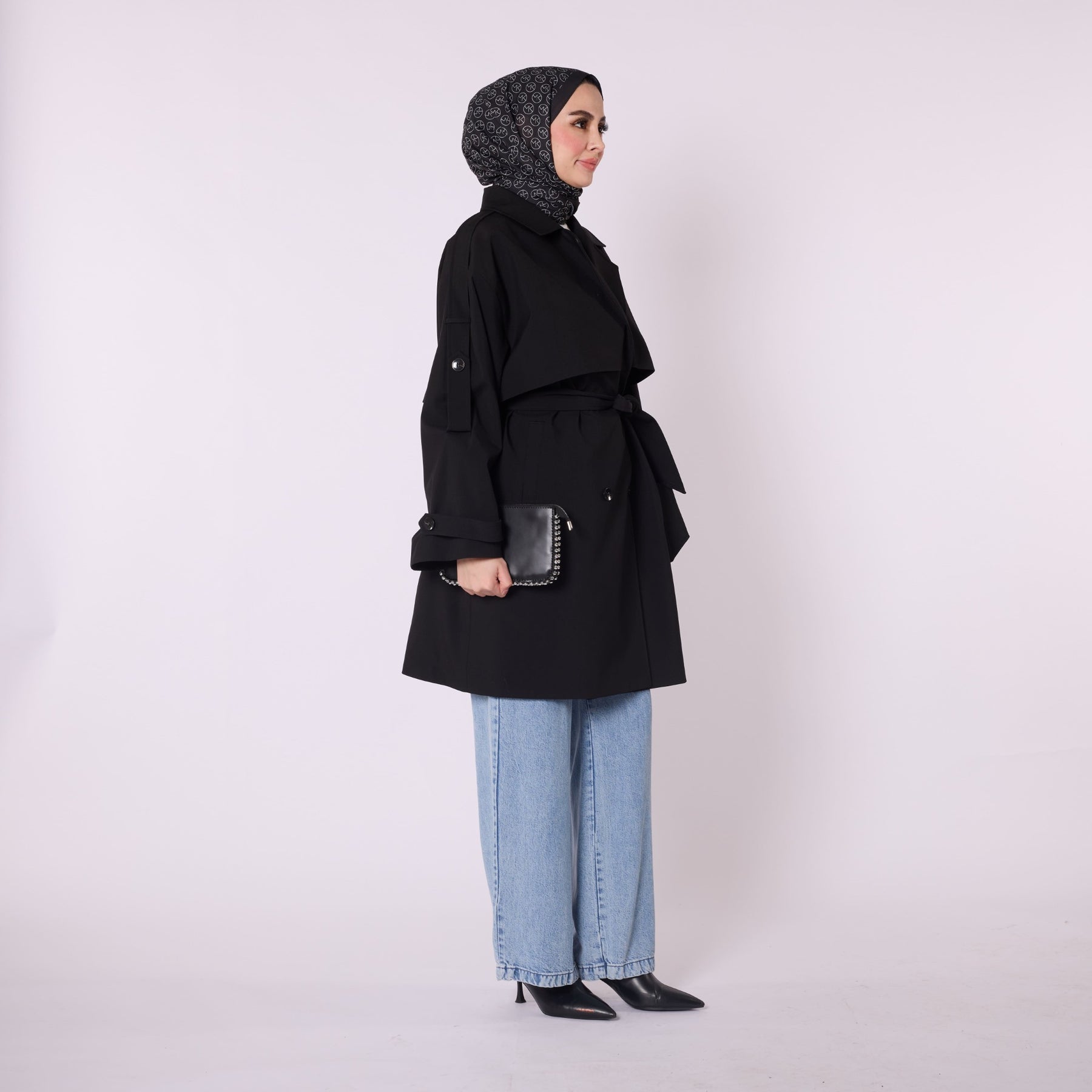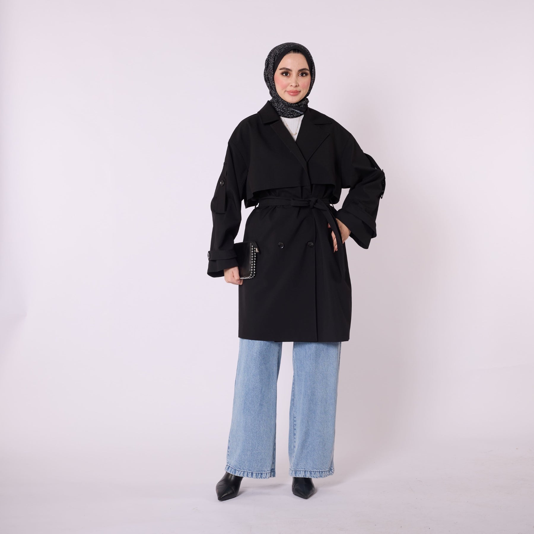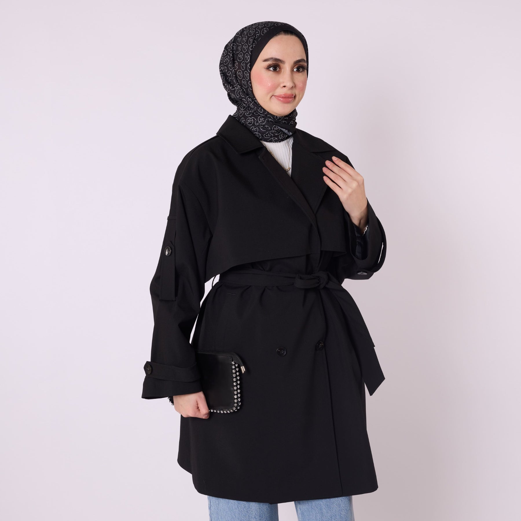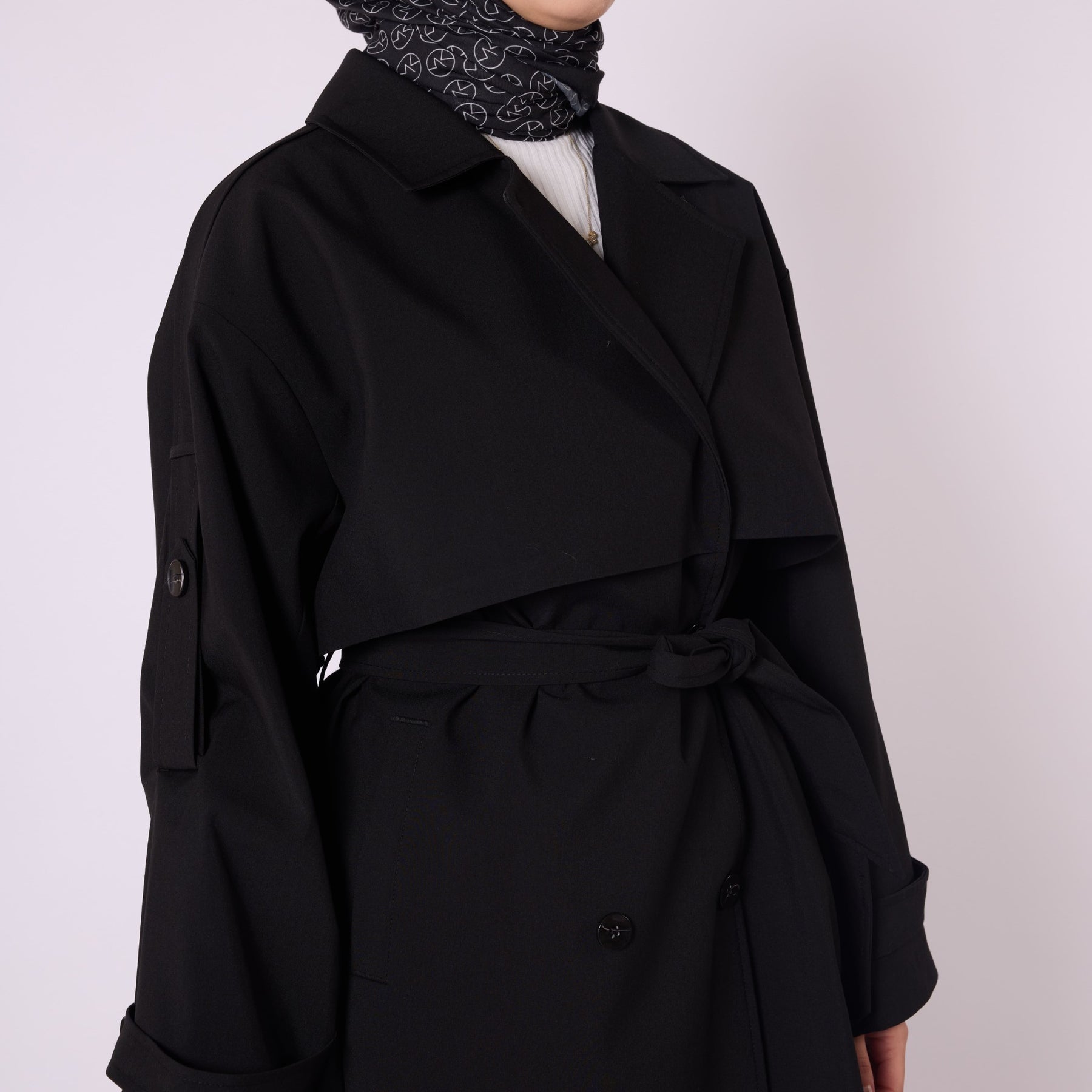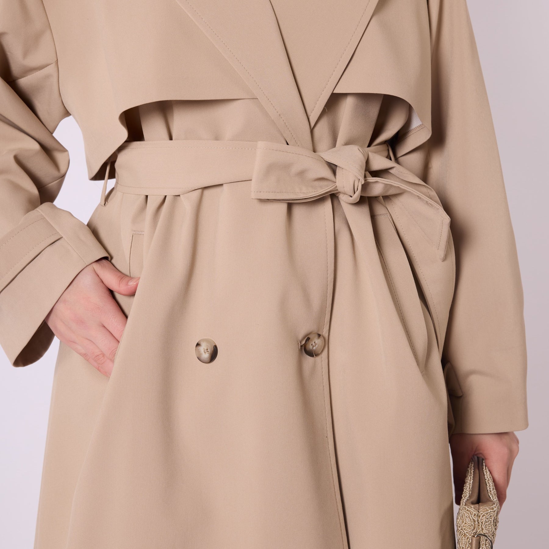 • Model: Double-breasted belted trench coat with dropped shoulders