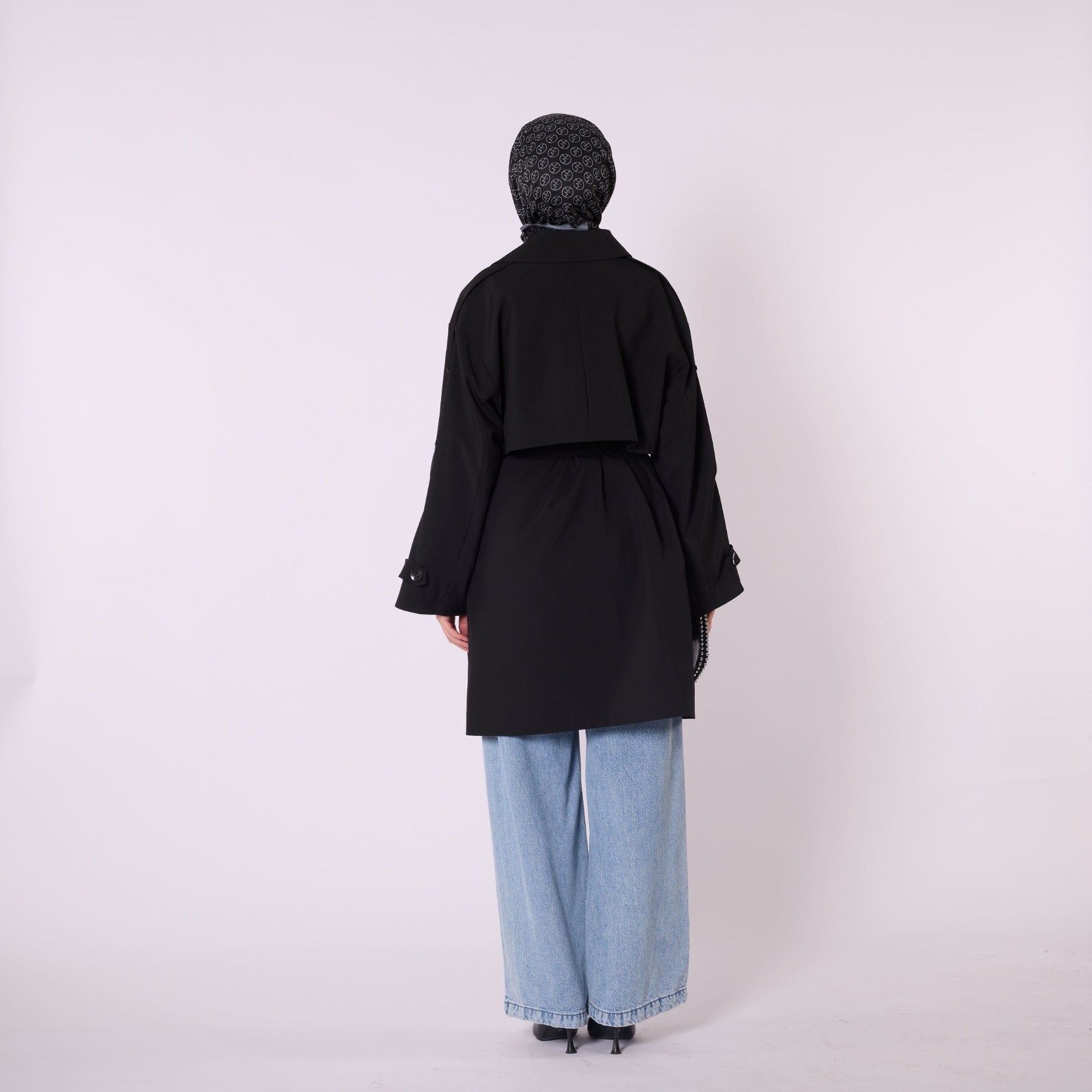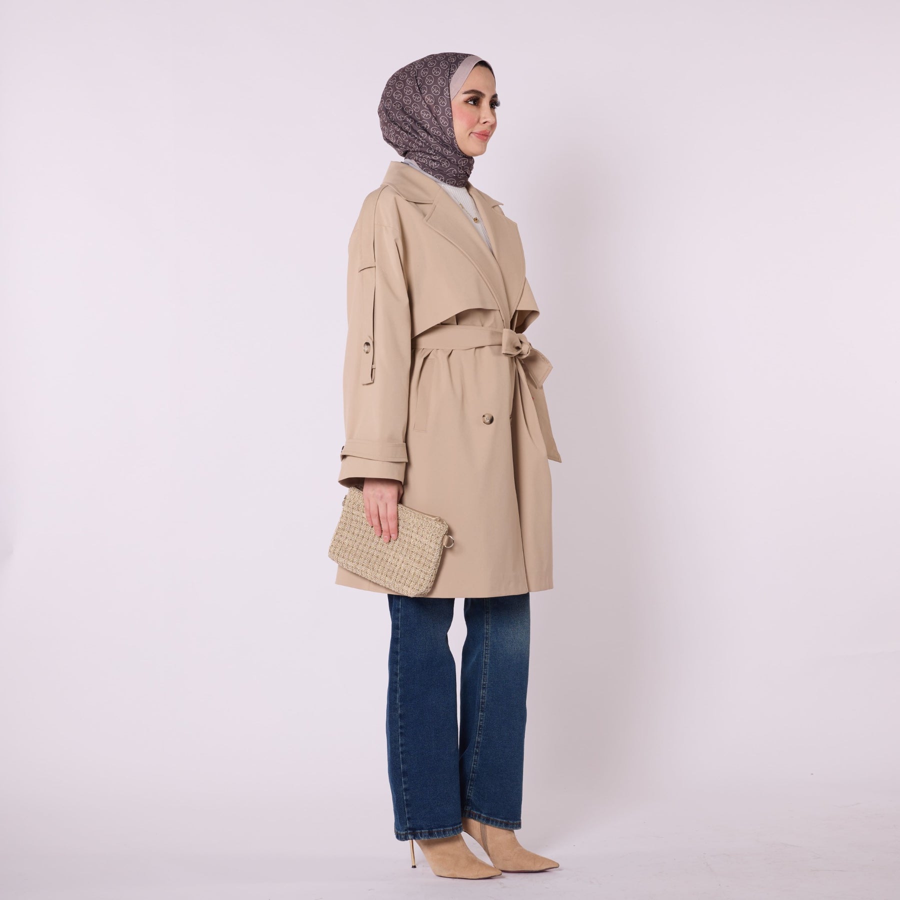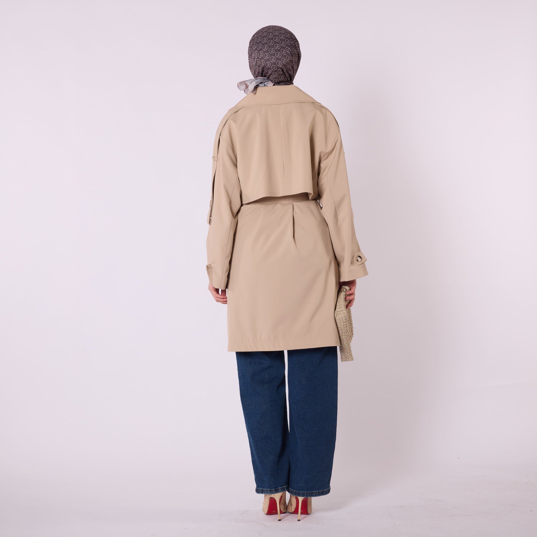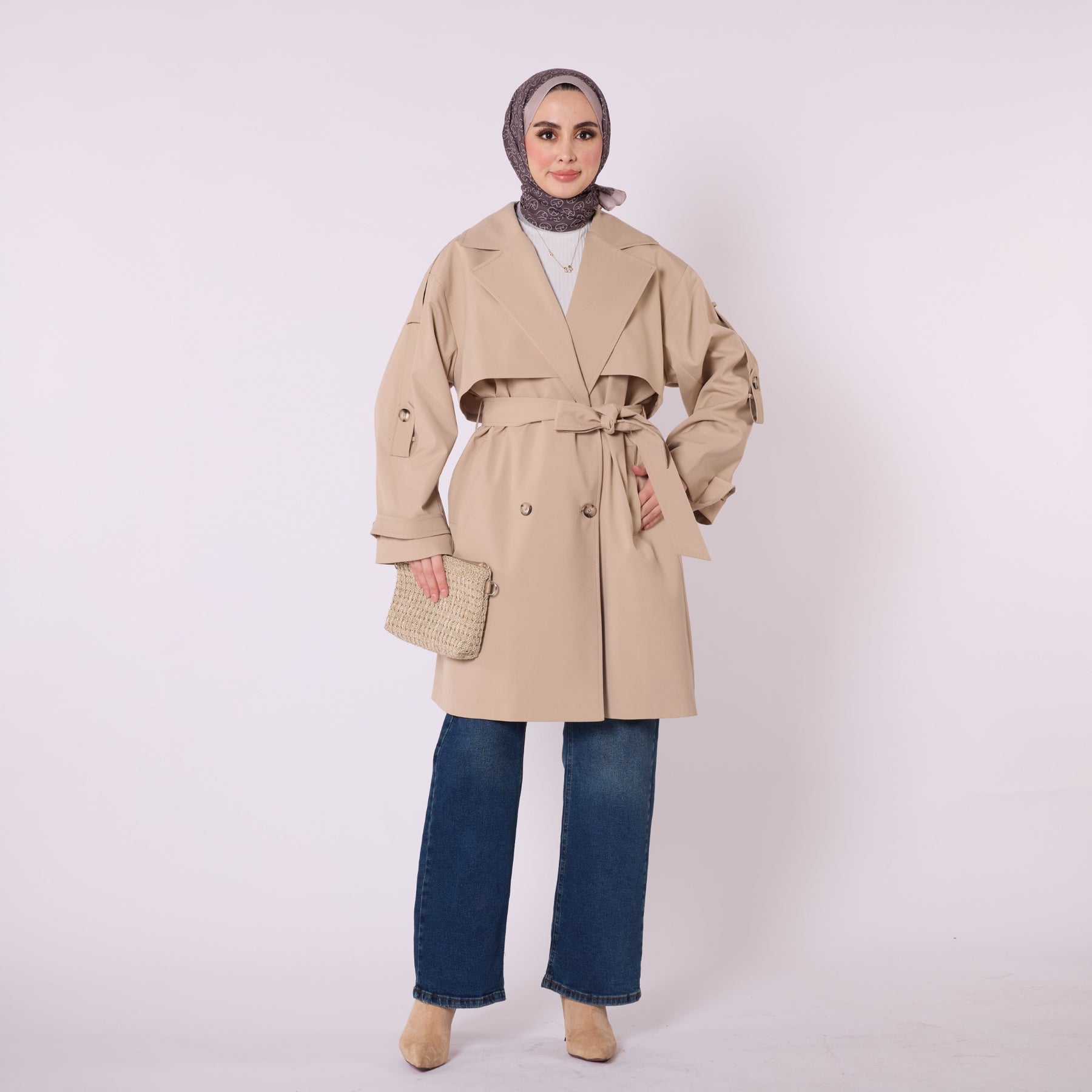 Combining elegance with a contemporary silhouette, this double-breasted belted trench coat offers a refined look suitable for both daily wear and urban styling. Its fully lined interior ensures comfortable use throughout the day, while the dropped-shoulder design and fluid drape create a relaxed yet polished appearance. The waist belt enhances the silhouette, adding structure to the classic double-breasted front. Measuring 120 cm in length, it provides an ideal mid-length fit.