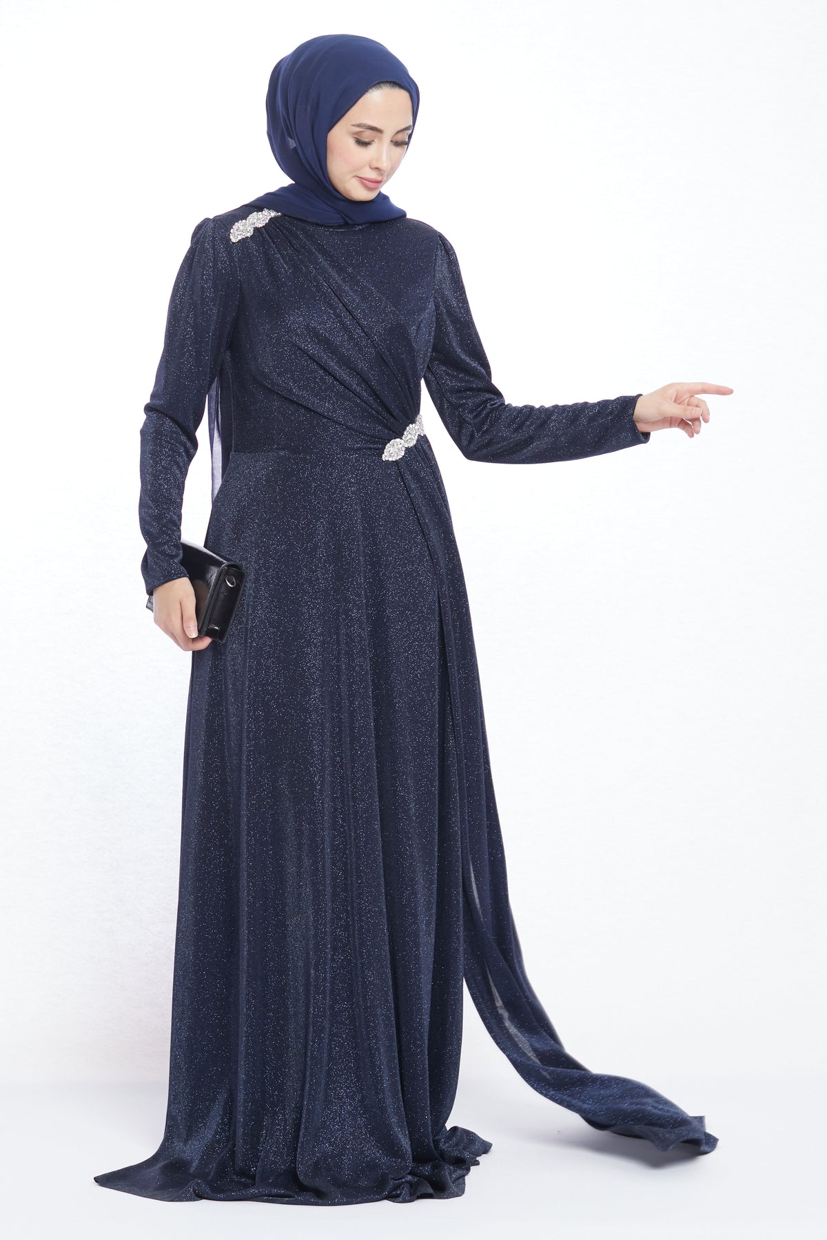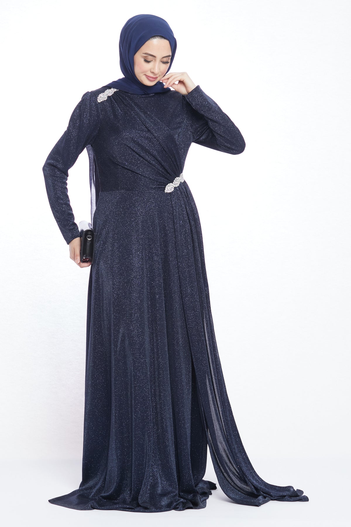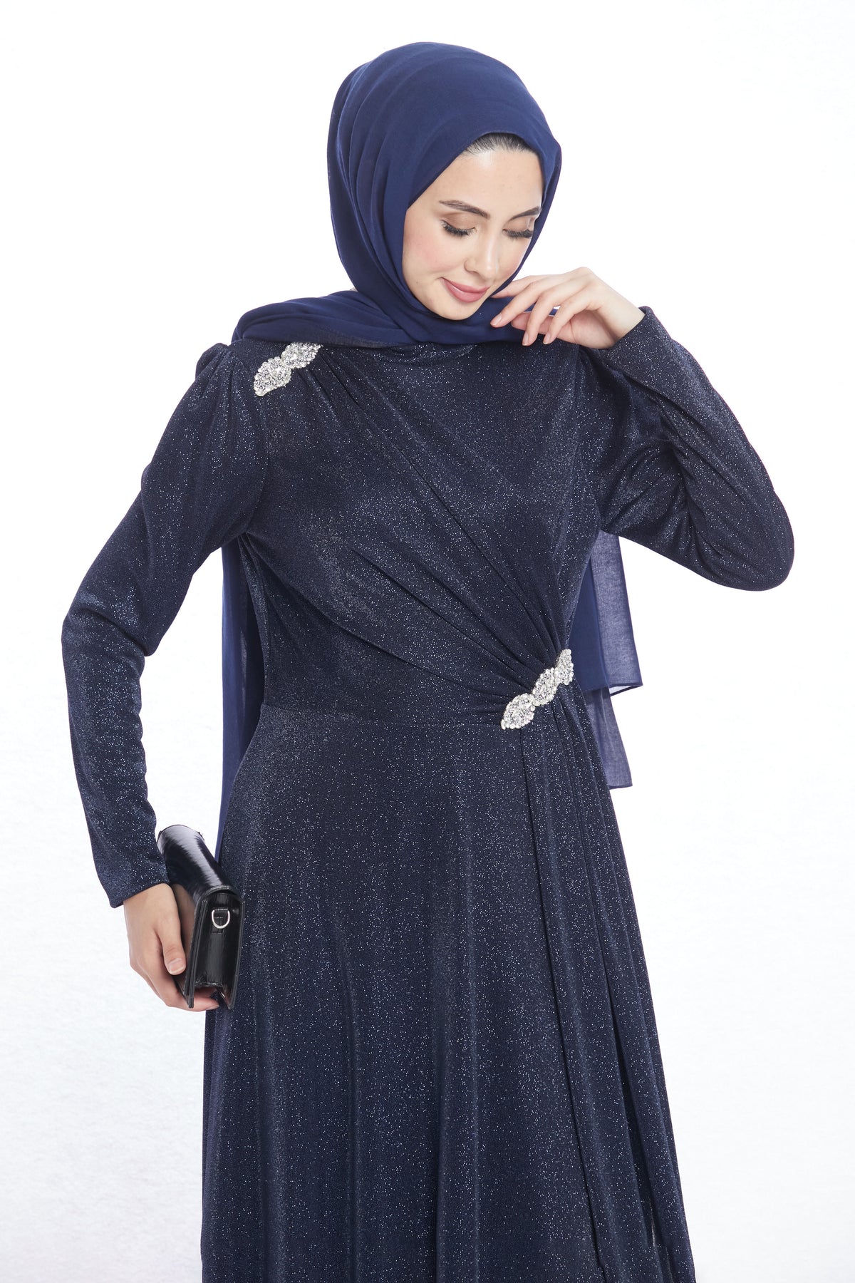 With its striking design, the patterned stone buckle detailed evening dress offers elegance and modern sophistication. Stone buckles on the shoulders and waist add a sparkling touch, while the unique fabric piece flowing from the shoulder buckle down to the waist and gently draping to the side creates a graceful silhouette. This special detail enhances the dress with a refined and stylish movement.