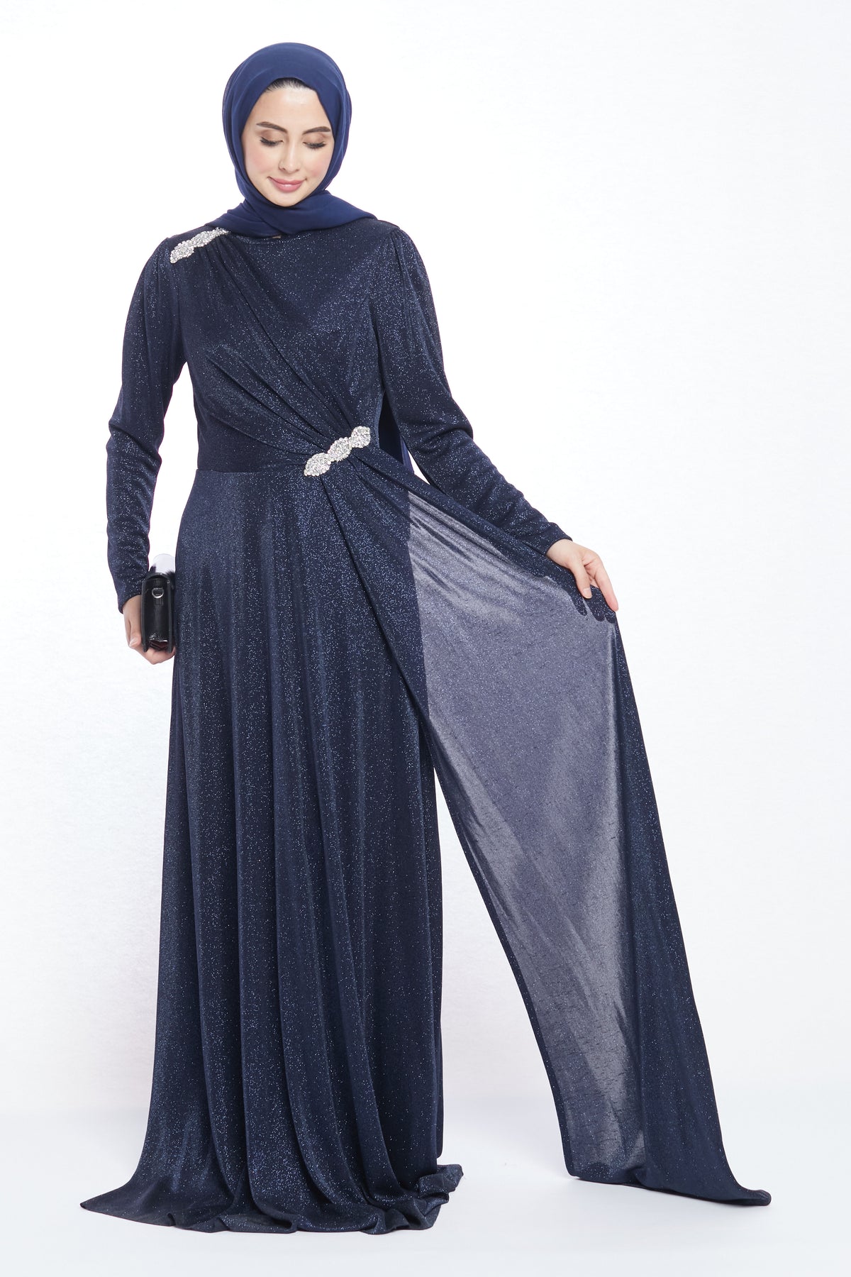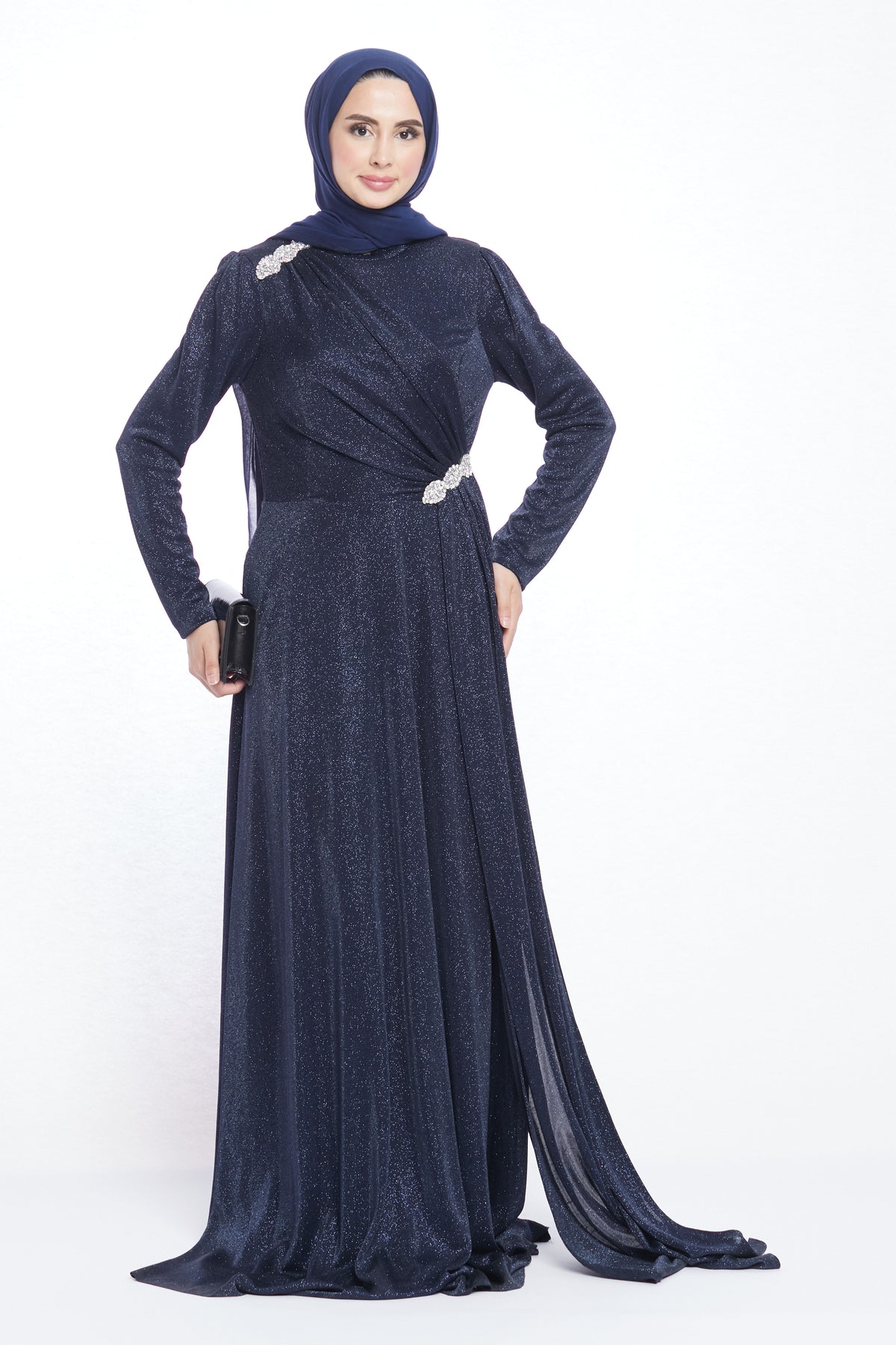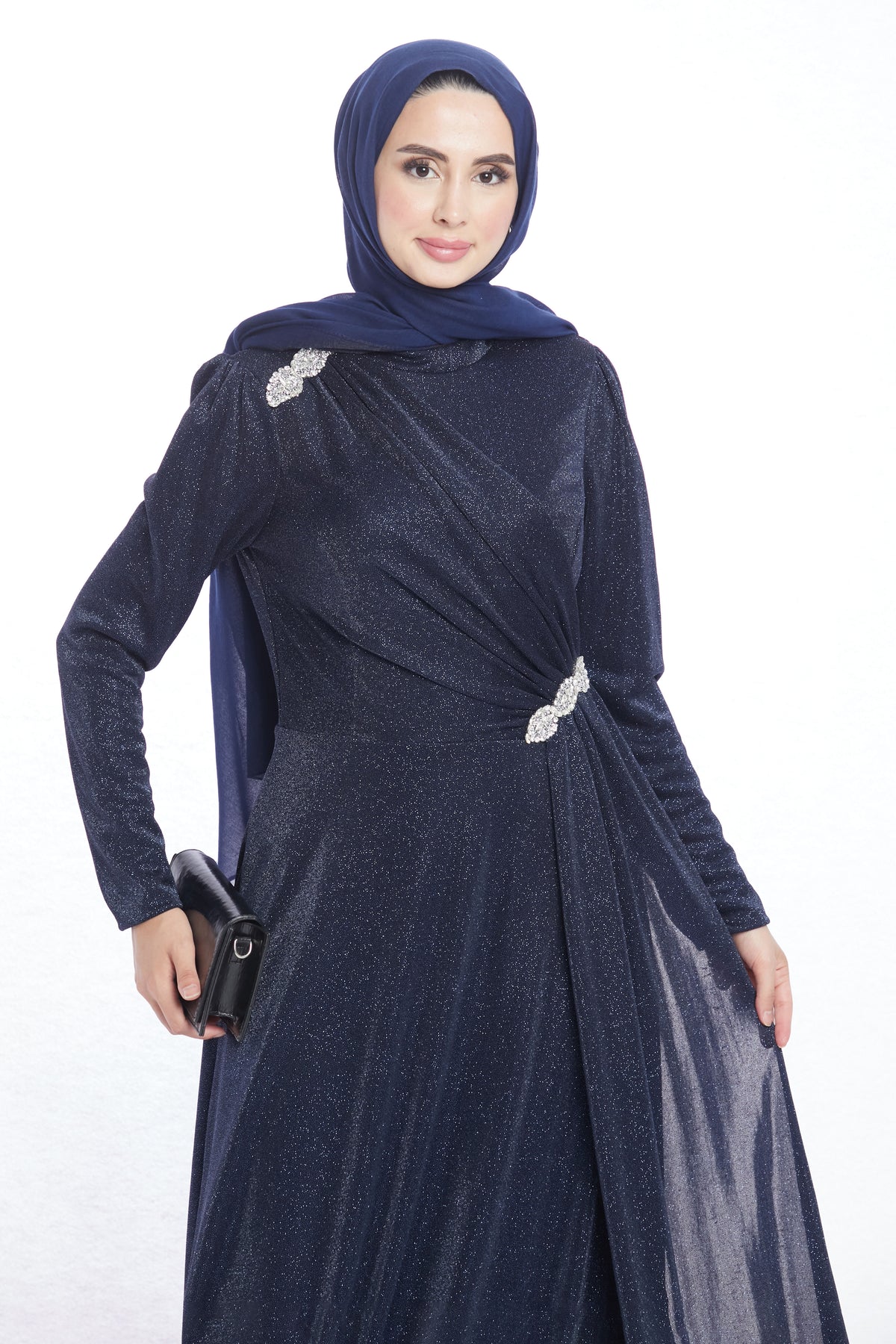 With its striking design, the patterned stone buckle detailed evening dress offers elegance and modern sophistication. Stone buckles on the shoulders and waist add a sparkling touch, while the unique fabric piece flowing from the shoulder buckle down to the waist and gently draping to the side creates a graceful silhouette. This special detail enhances the dress with a refined and stylish movement.