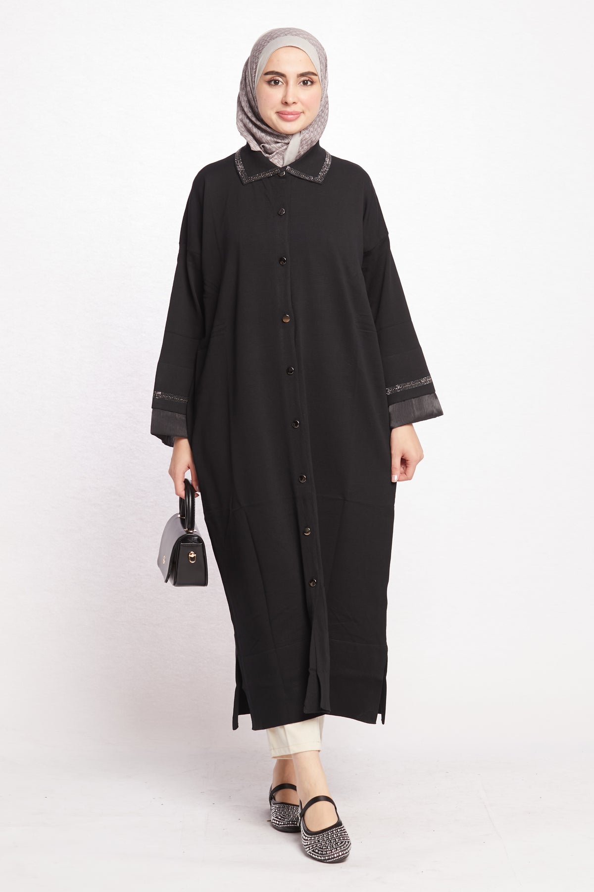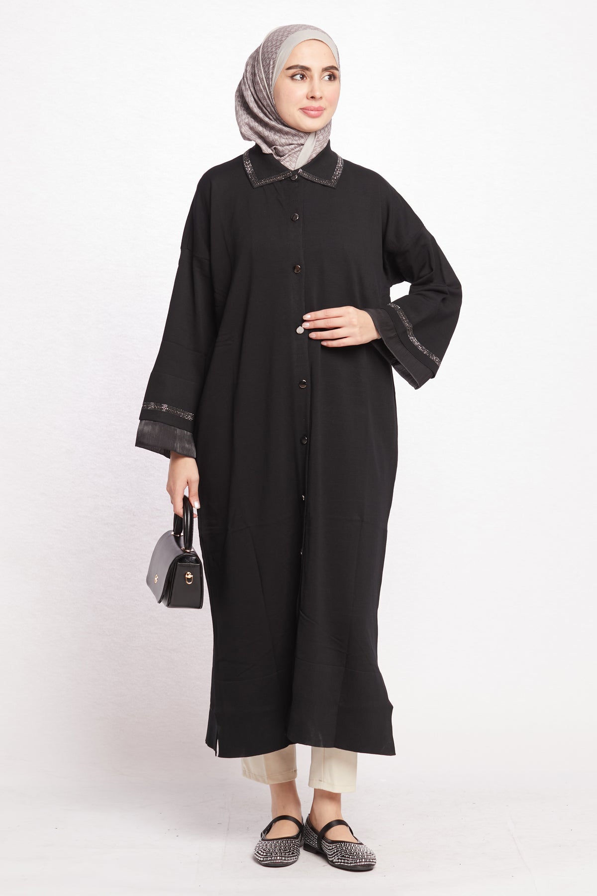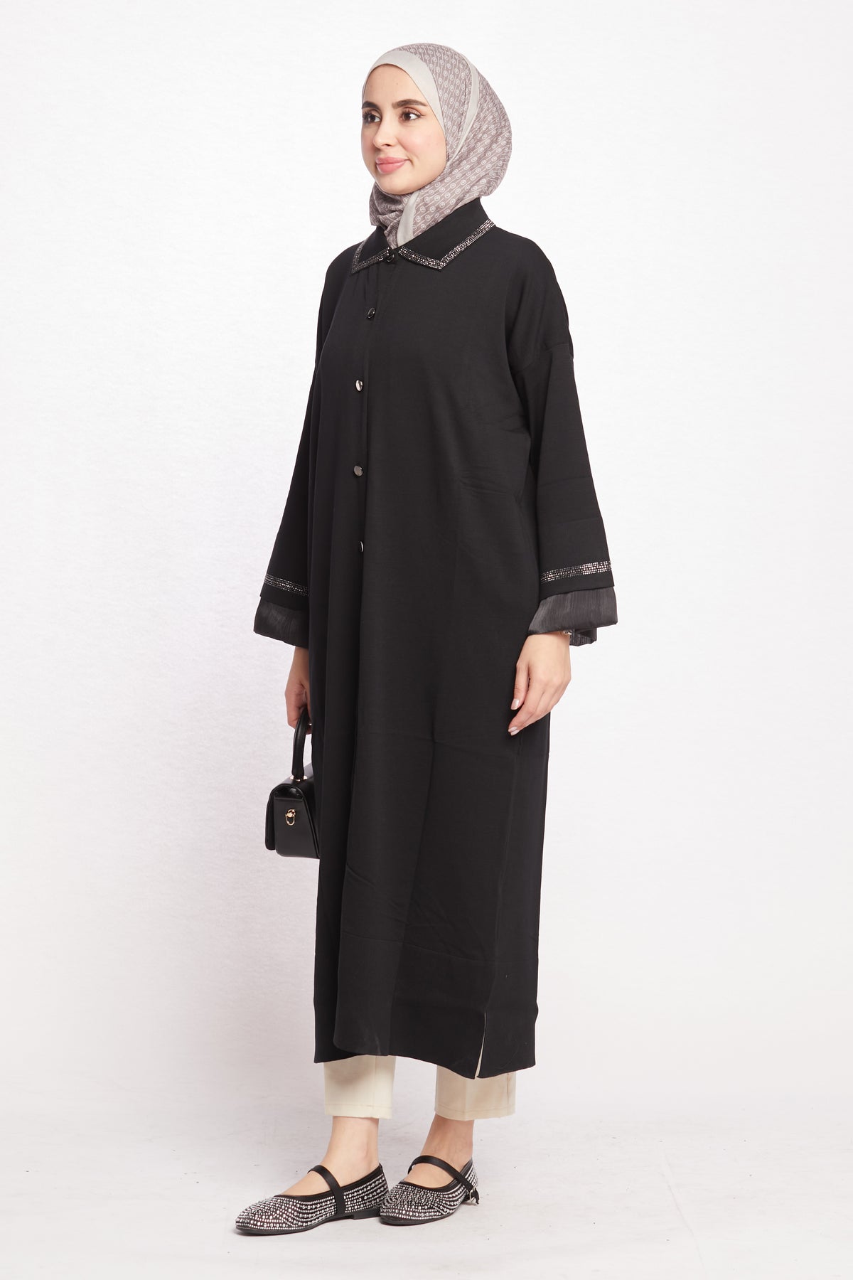 Combining classic and elegant details, this embroidered ferace completes its simple look with pearl embroidery and button details. With its shirt collar design and long cut, it offers both stylish and comfortable wear. Its warm structure makes it a comfortable choice even in winter months.