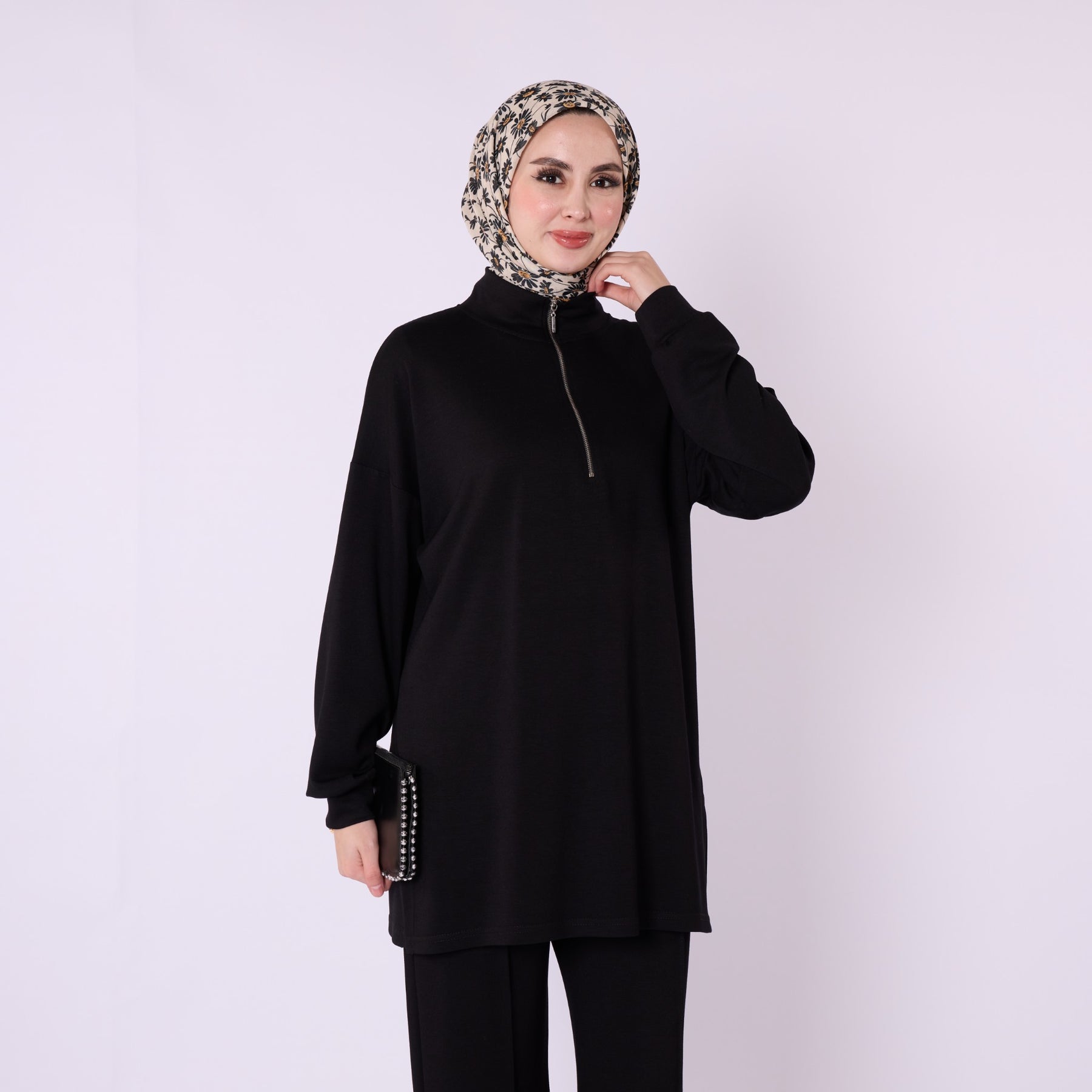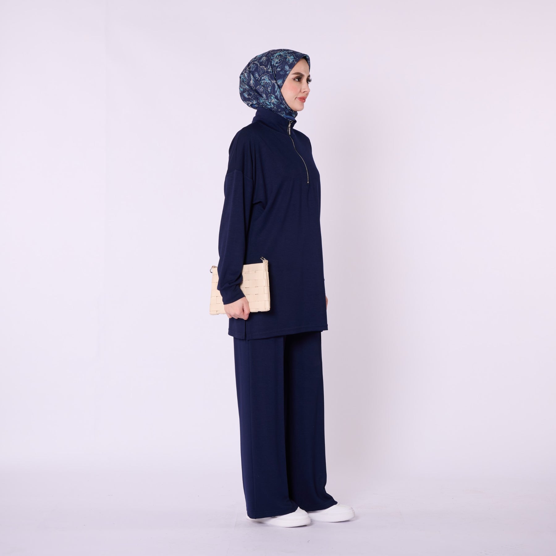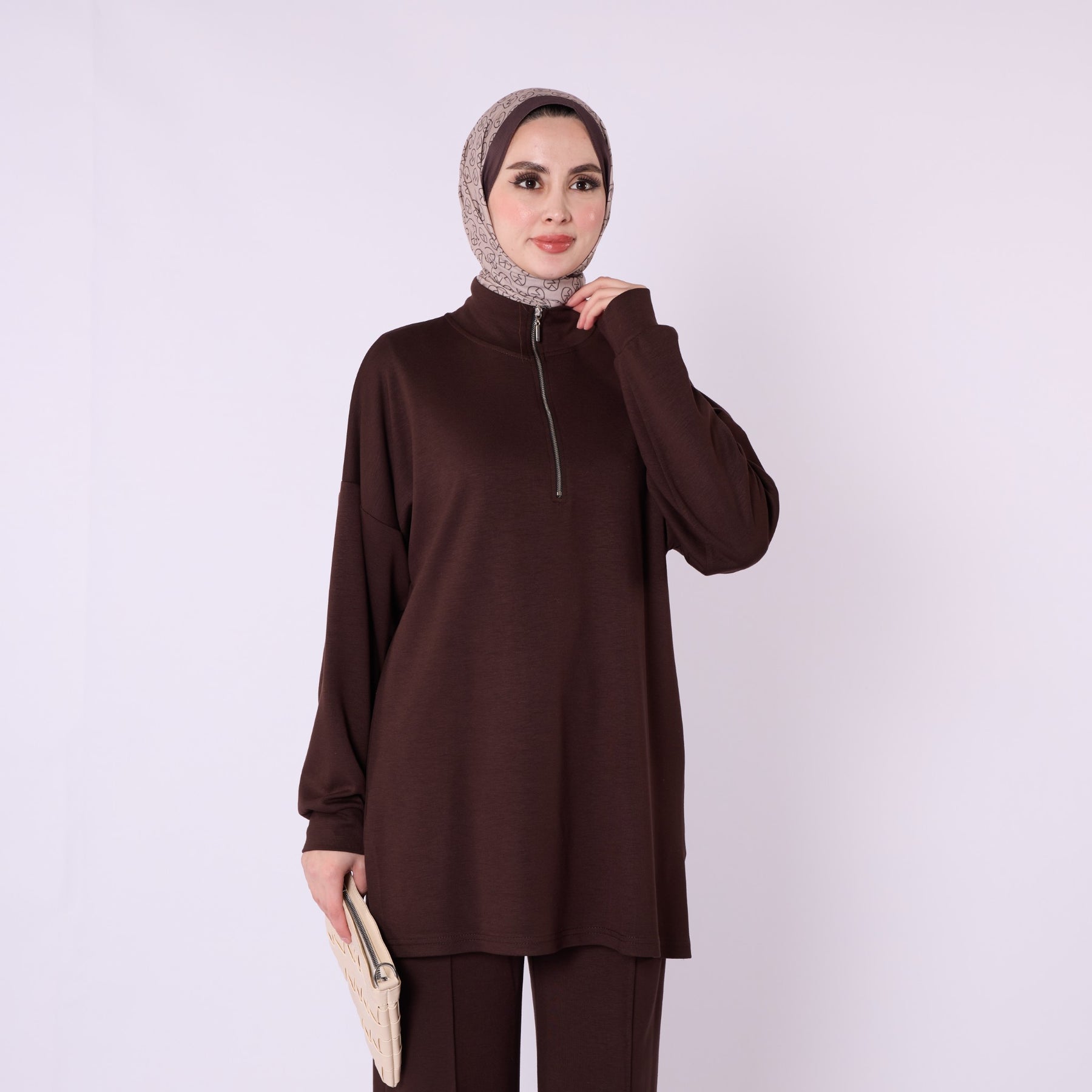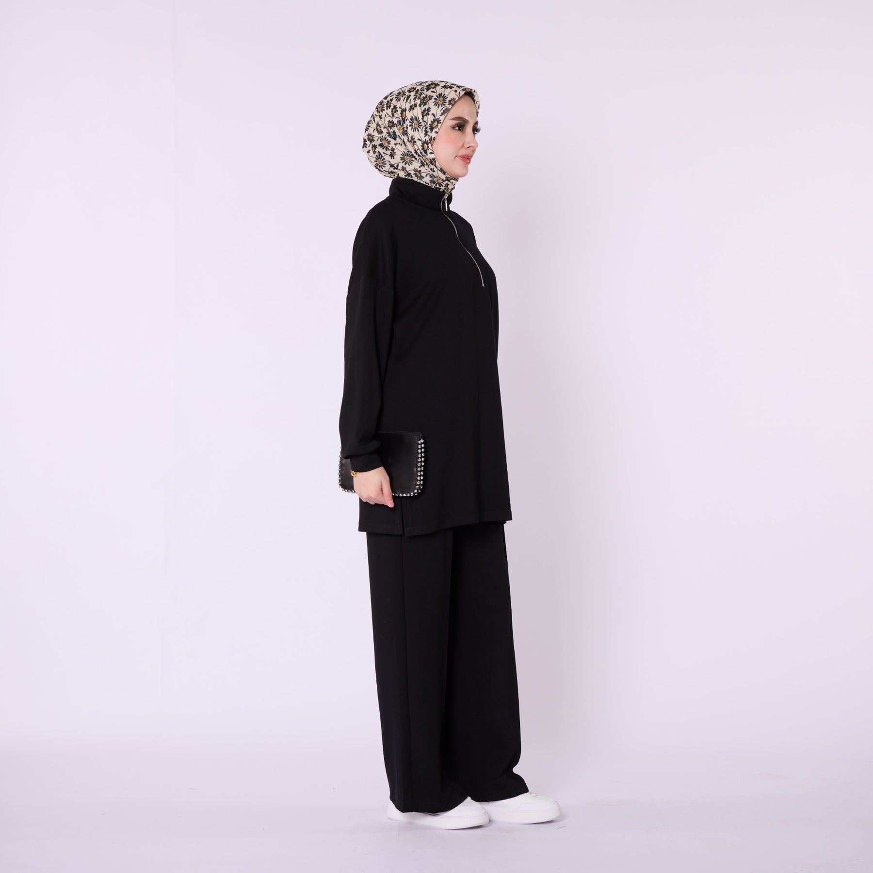 Designed for effortless everyday comfort, this two-piece set features a soft cotton-blend fabric that provides flexibility and ease of movement. The high-neck top with a half-zip offers warmth and a clean, structured look, while the trousers stand out with distinct seam detailing that highlights the crease line for a modern touch. The wide-leg silhouette enhances comfort, making the set ideal for daily wear. Available in a versatile color range including burgundy, charcoal, grey, brown, navy and black.