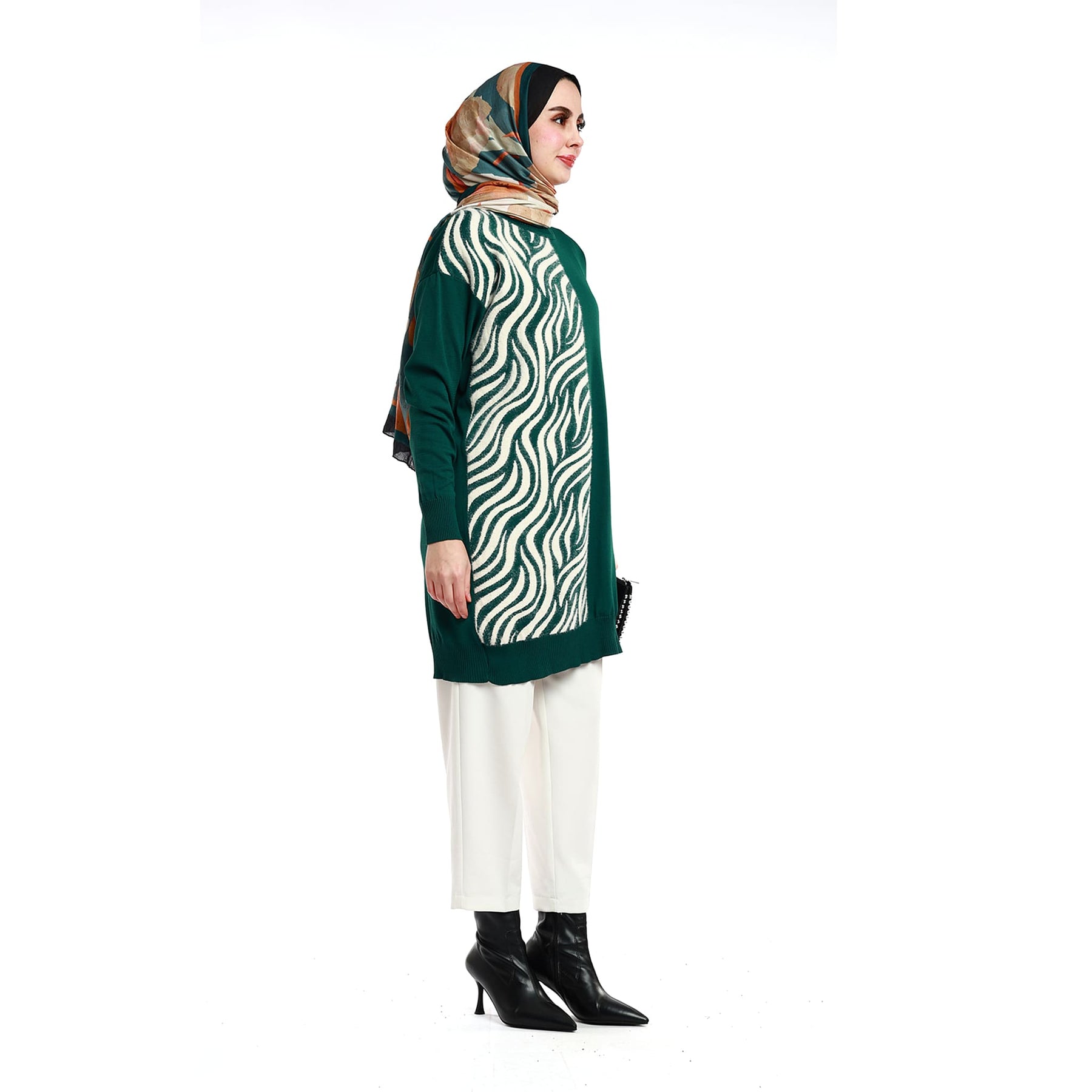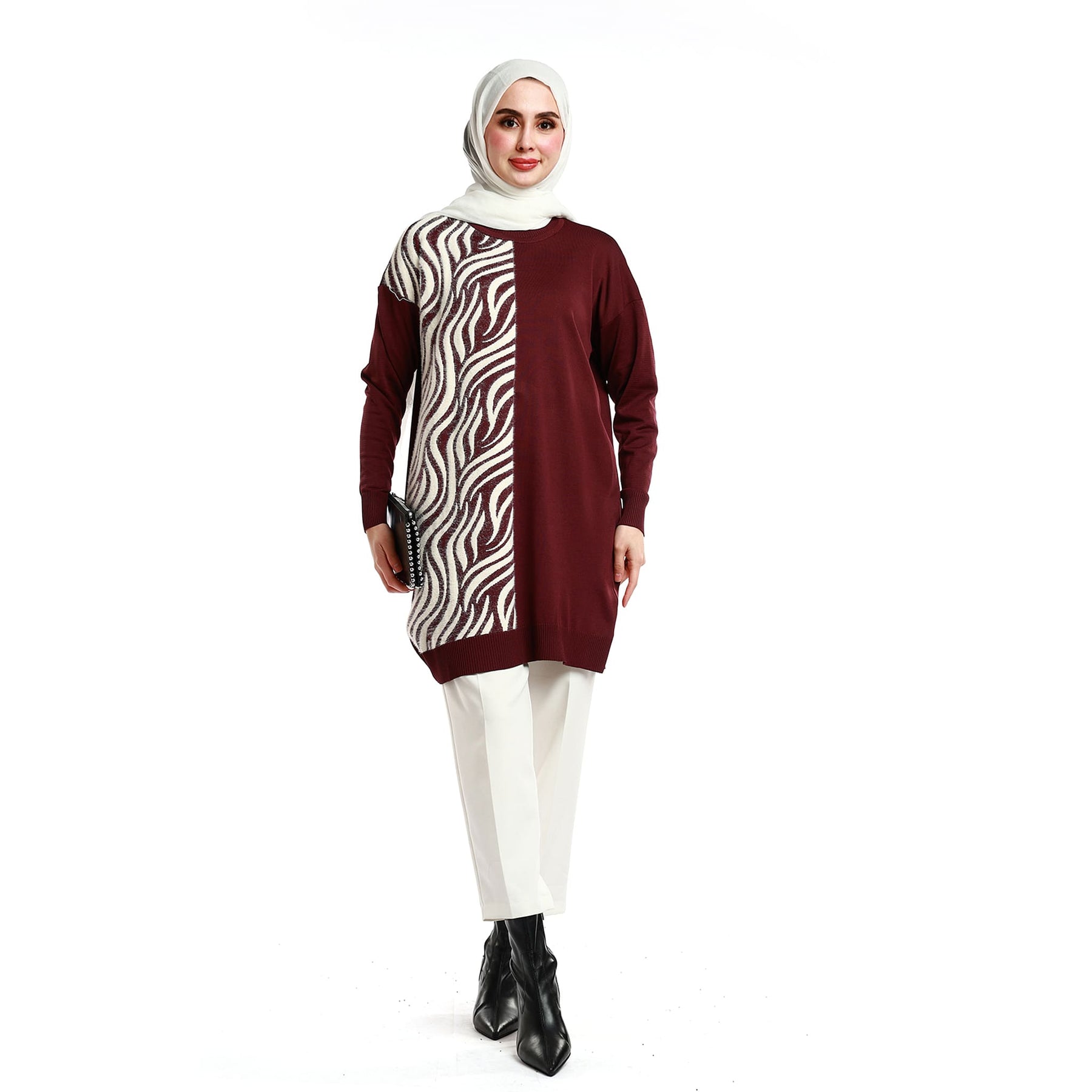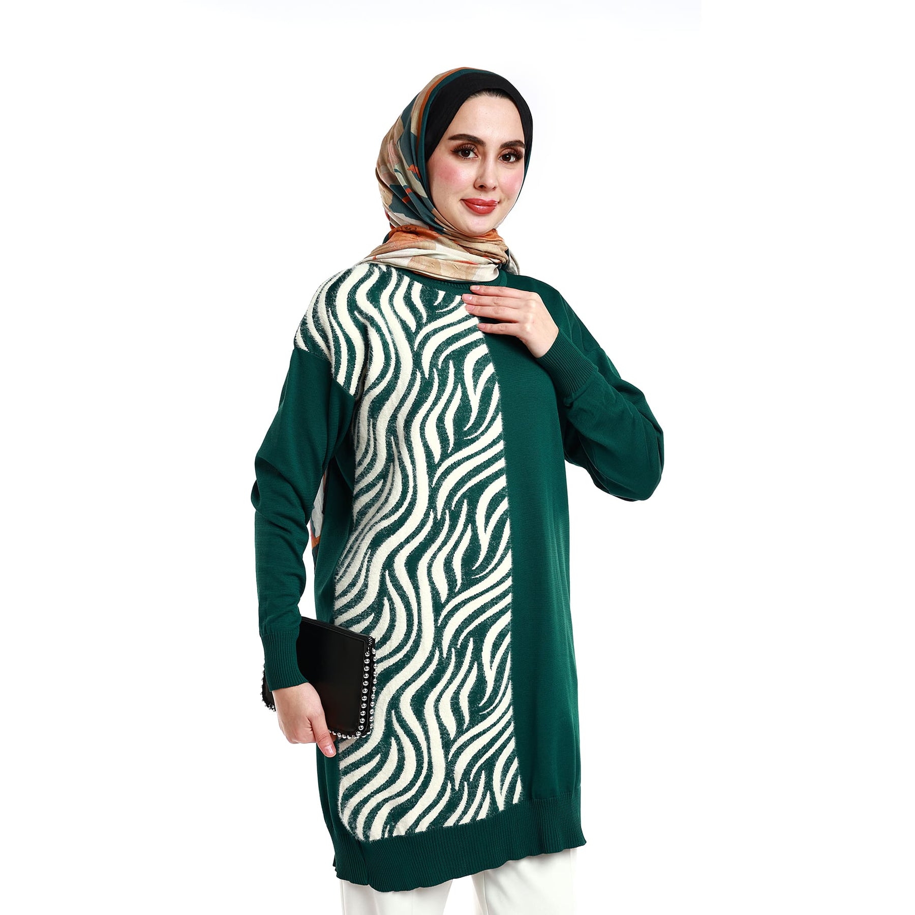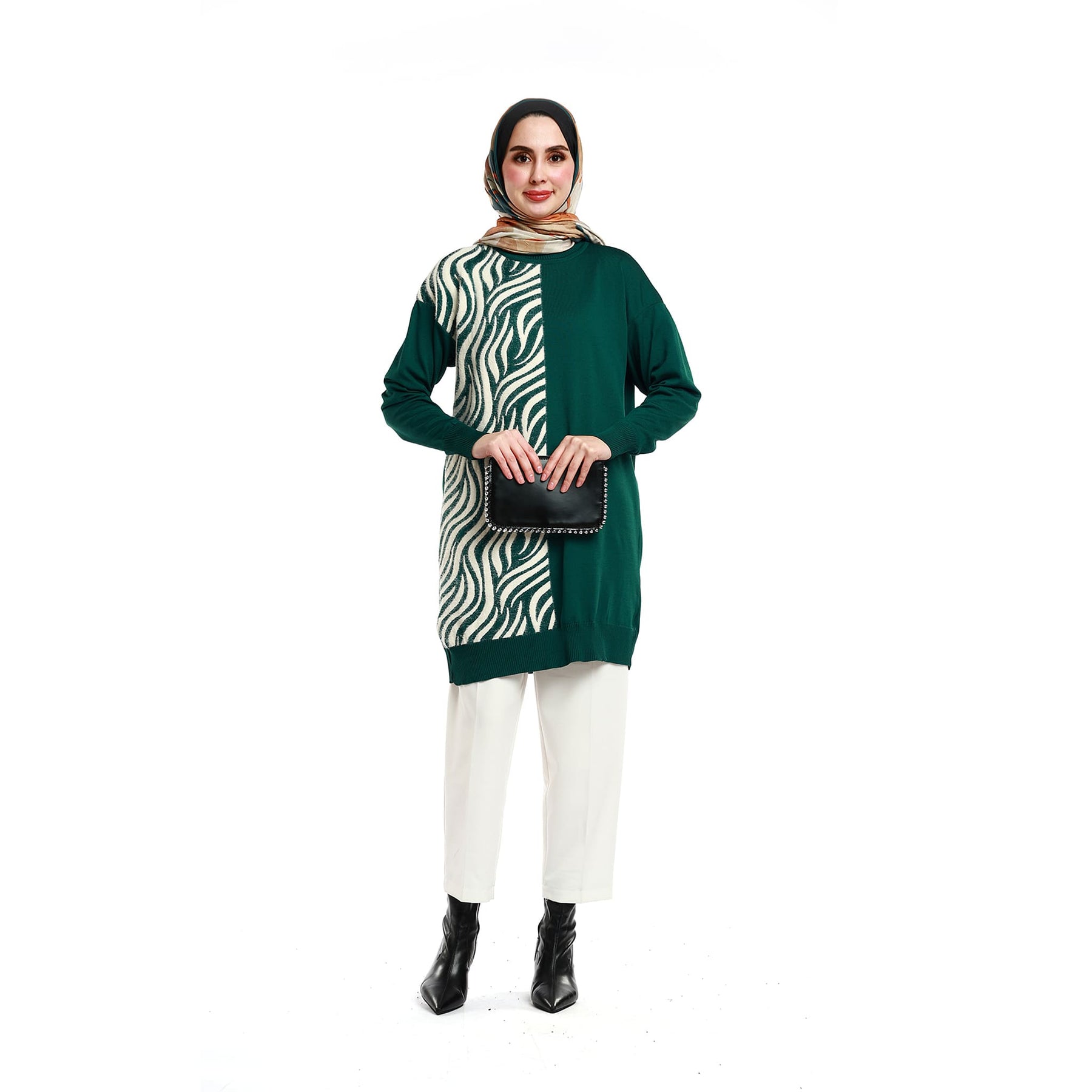 Designed for effortless everyday style, this zebra-patterned relaxed knit tunic offers both comfort and visual appeal. Its soft knitted texture ensures all-day ease, while the loose silhouette allows free movement. Perfect for transitional seasons and winter days, it pairs easily with casual or refined pieces. Available in green, emerald, burgundy, grey, brown, navy and black.