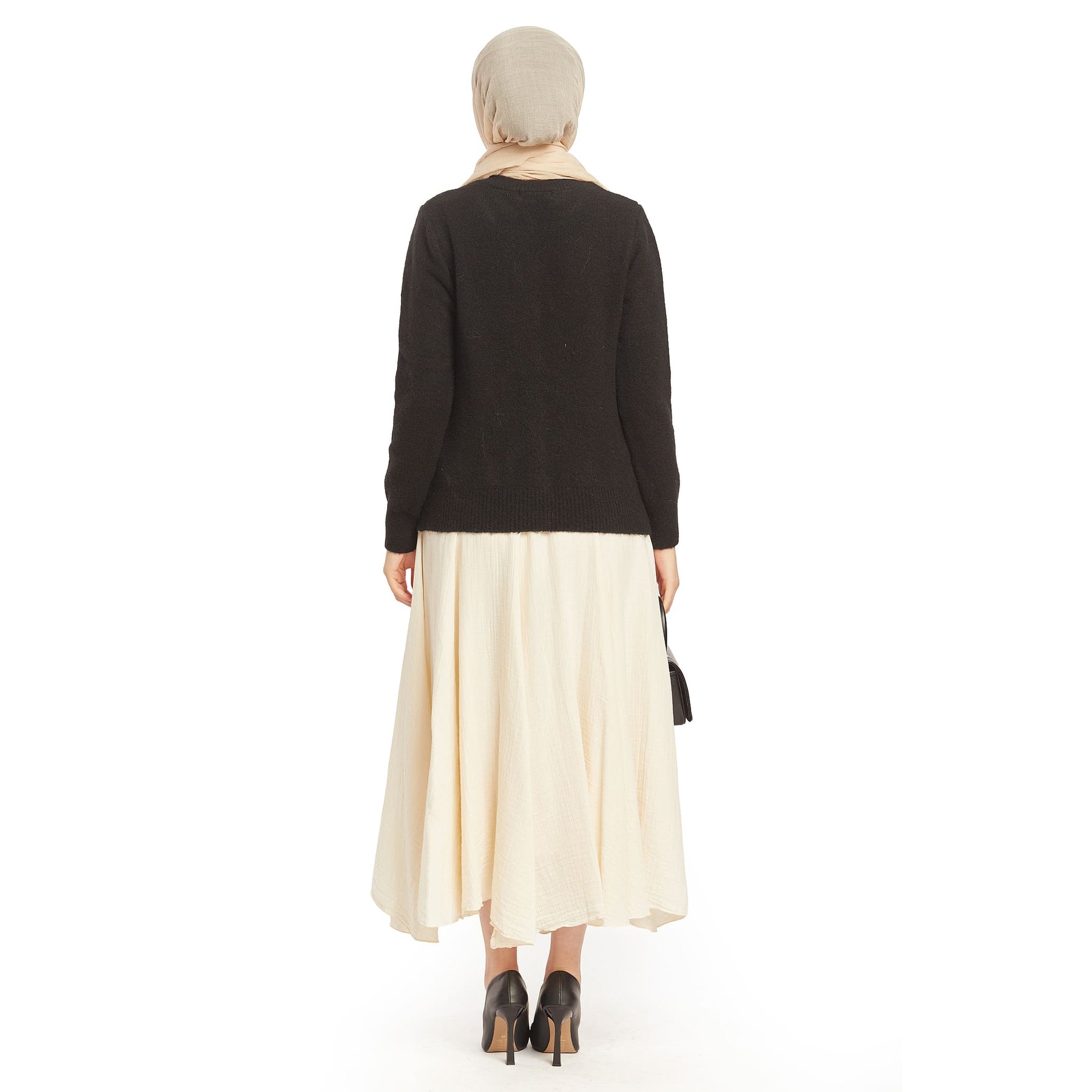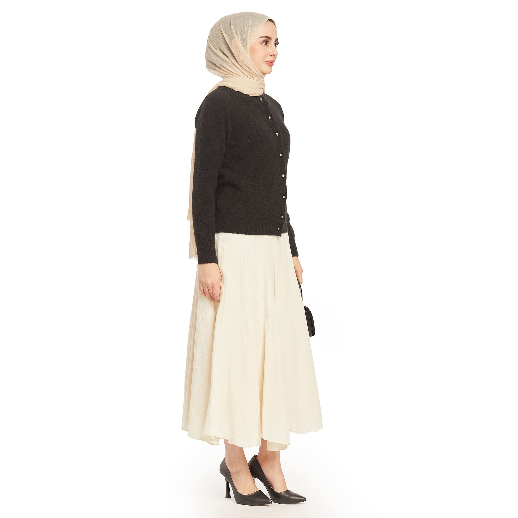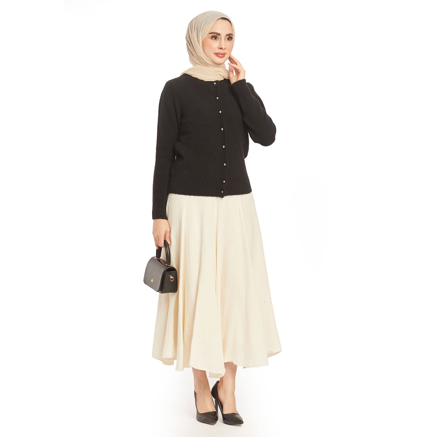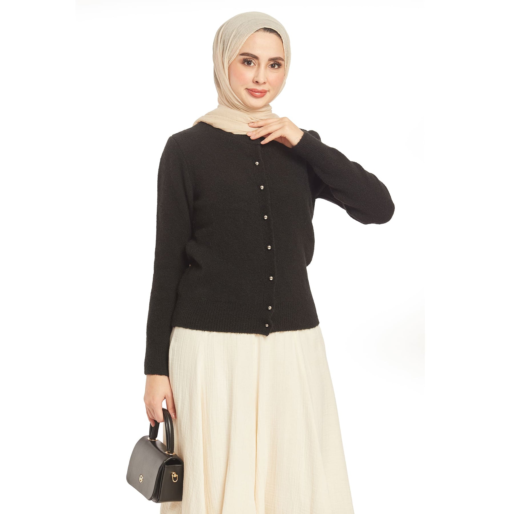 The pearl button knit cardigan is elegant and stylish, perfect for winter wear. Made from 63% polyester, 34% viscose, and 3% elastane acrylic fabric, it provides warmth and a comfortable fit. The pearl button details add a sophisticated touch to the cardigan.